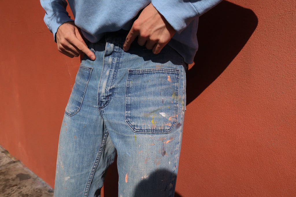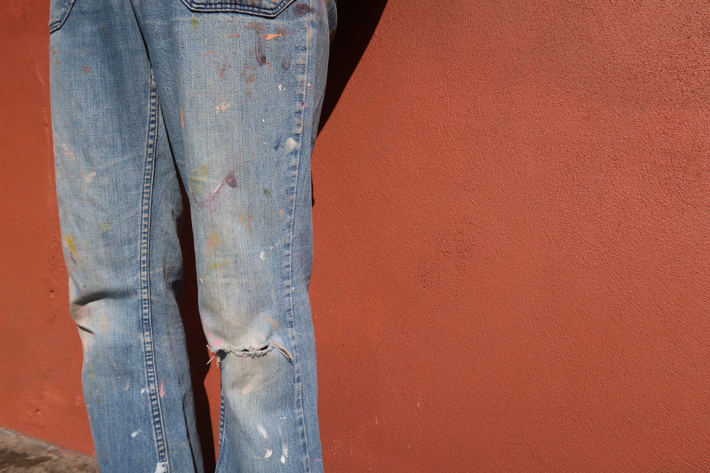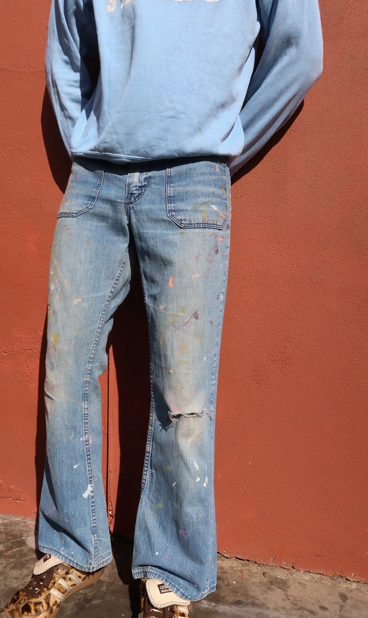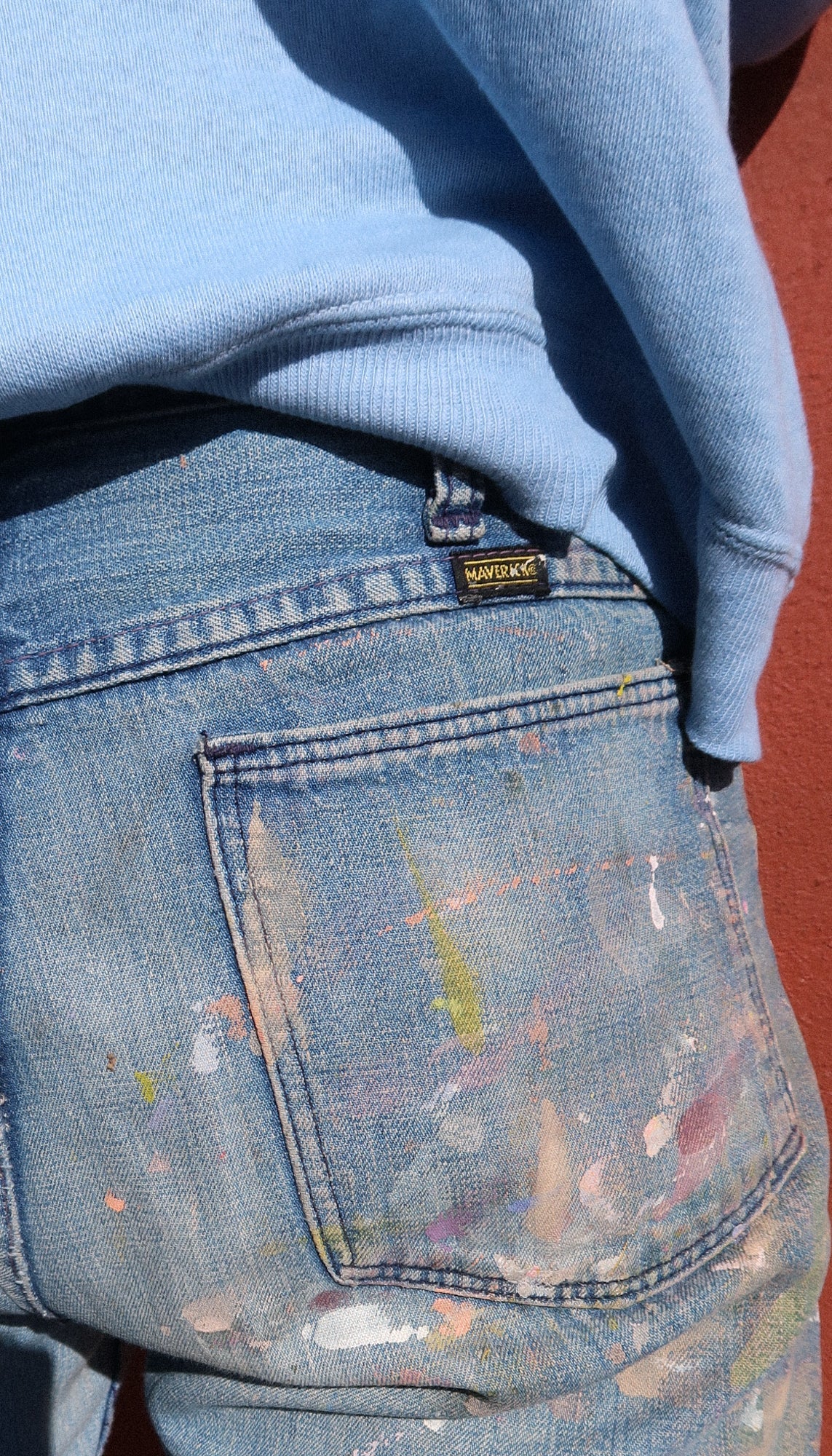 1970S MAVERICK SEA FARER STYLE JEANS. THIS PAIR HAVE BEEN WELL LOVED AND WORN. THEY ARE COVERED IN COLOURFUL PAINT SPLATS, NOT PURPOSEFULLY DONE.