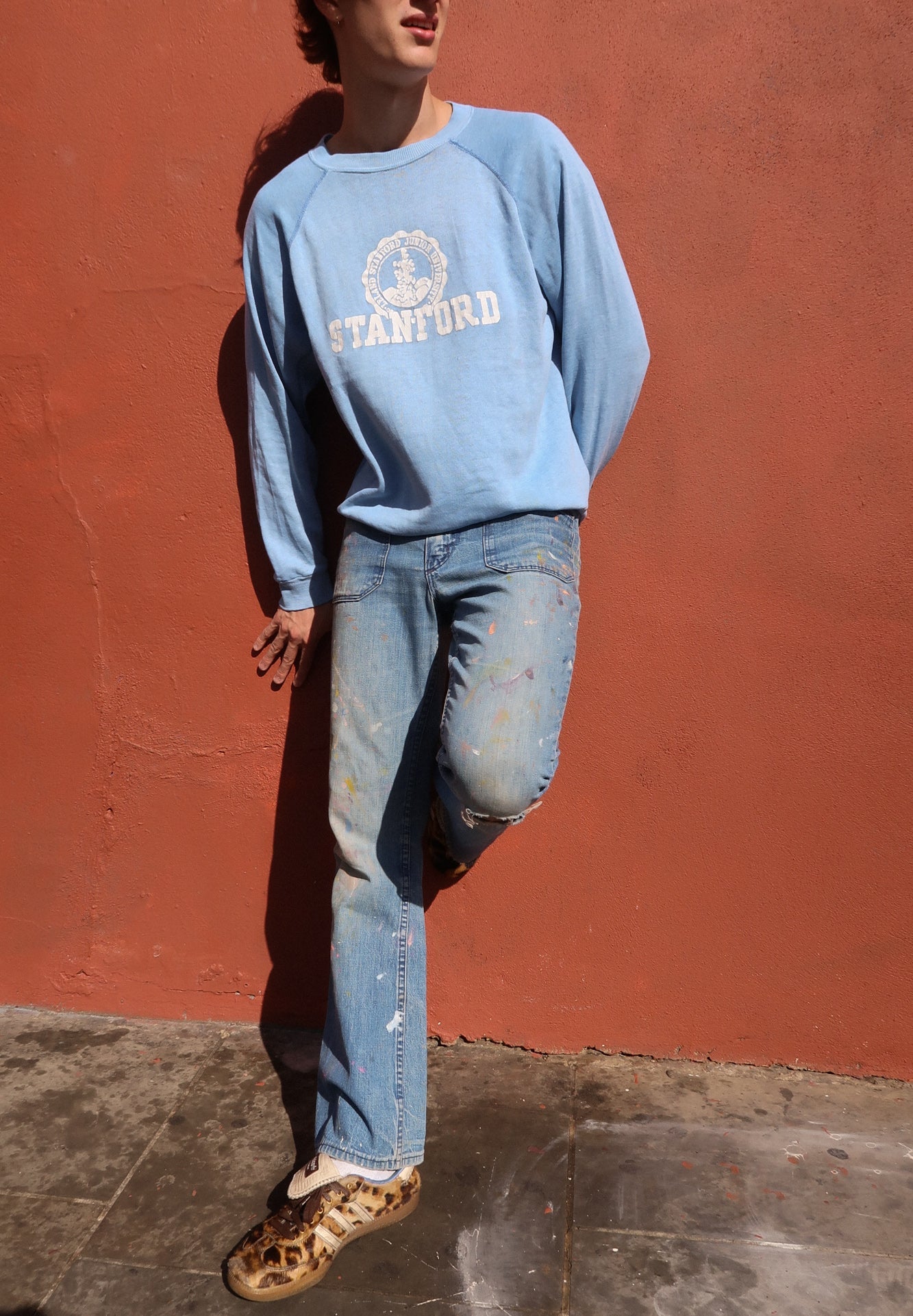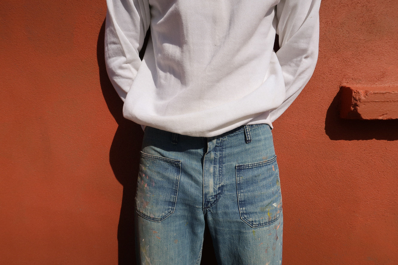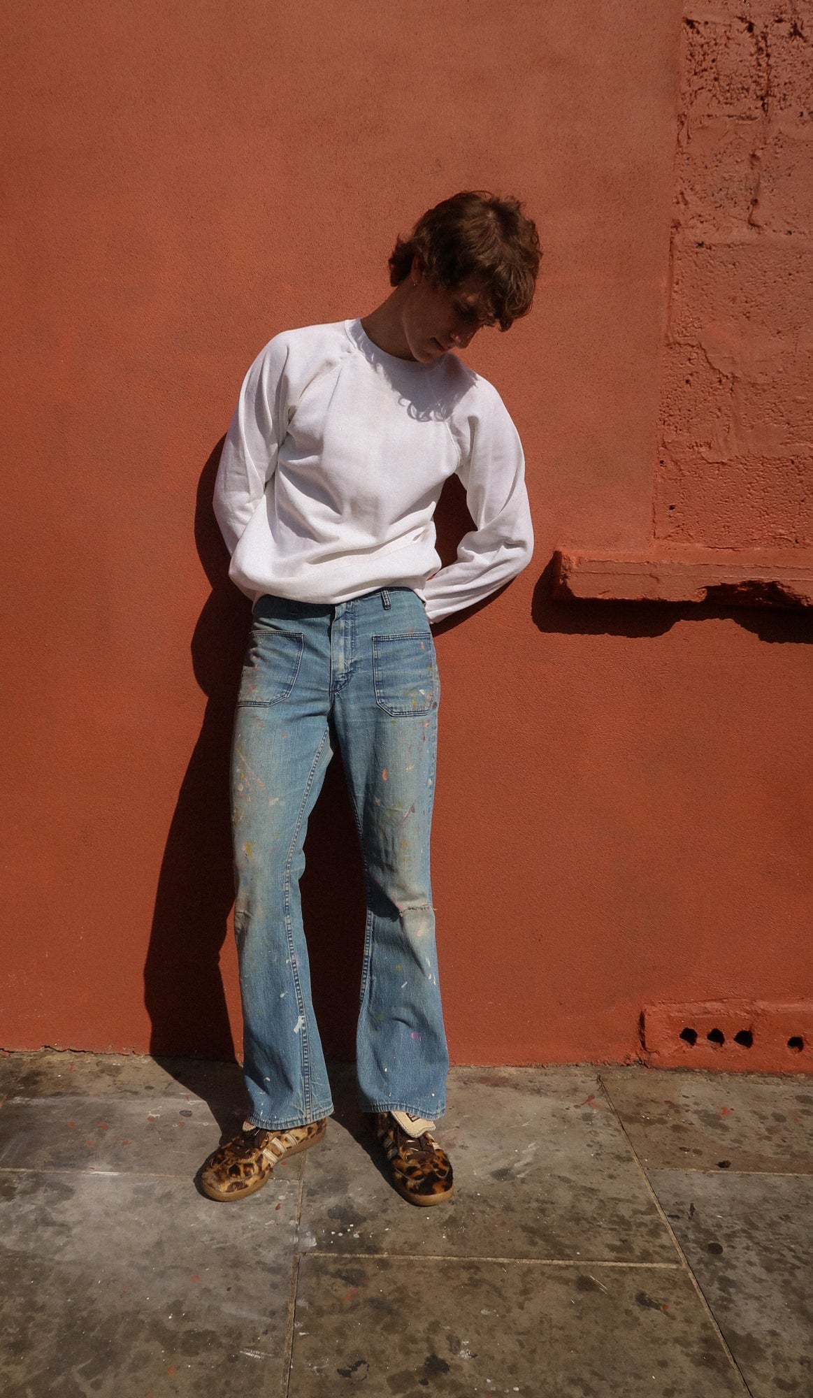 1970S MAVERICK SEA FARER STYLE JEANS. THIS PAIR HAVE BEEN WELL LOVED AND WORN. THEY ARE COVERED IN COLOURFUL PAINT SPLATS, NOT PURPOSEFULLY DONE.