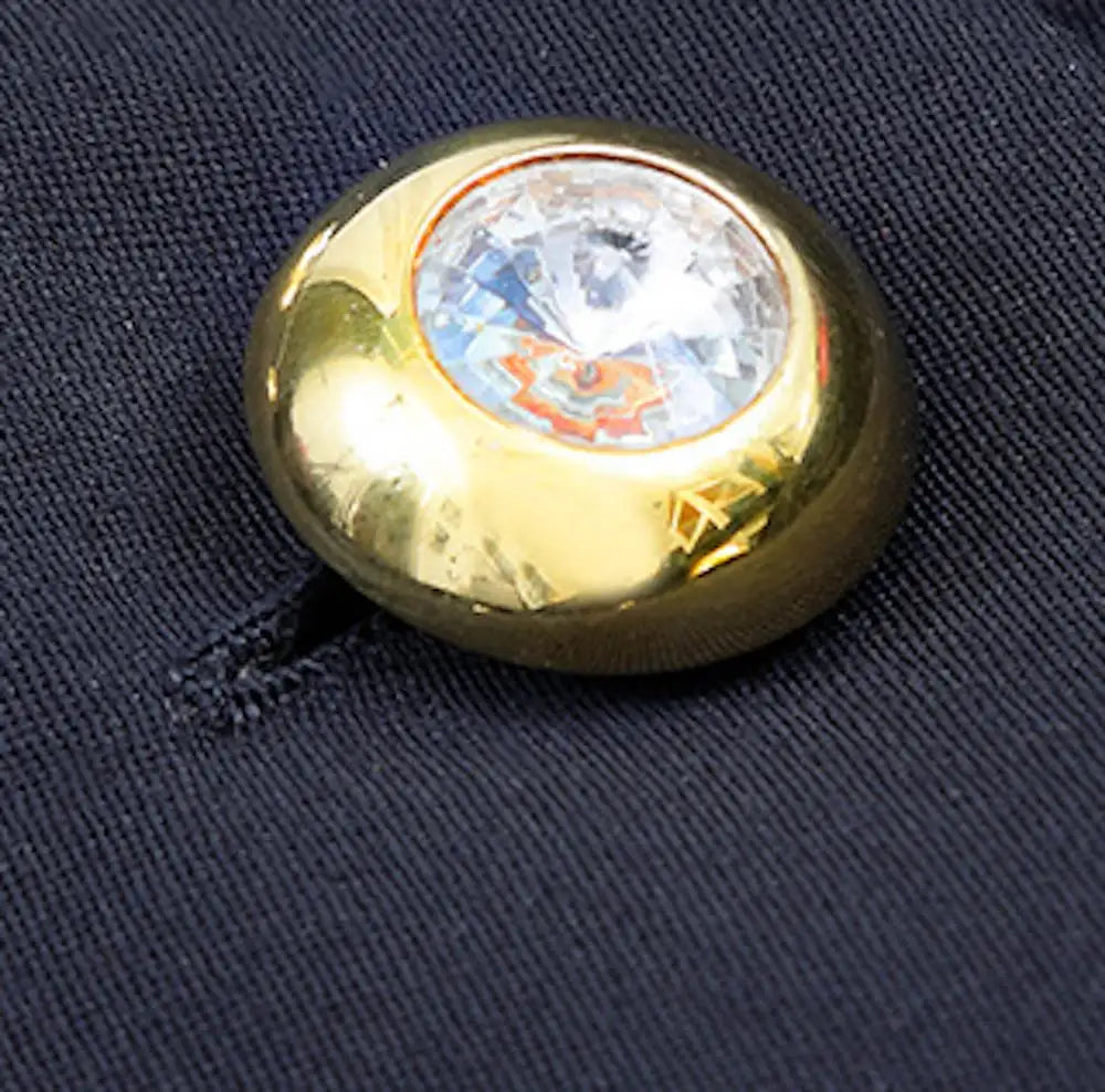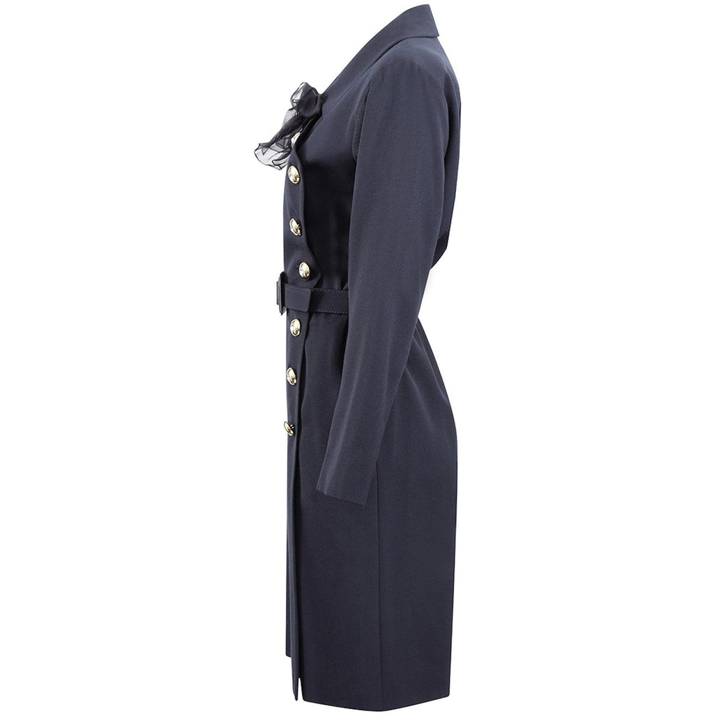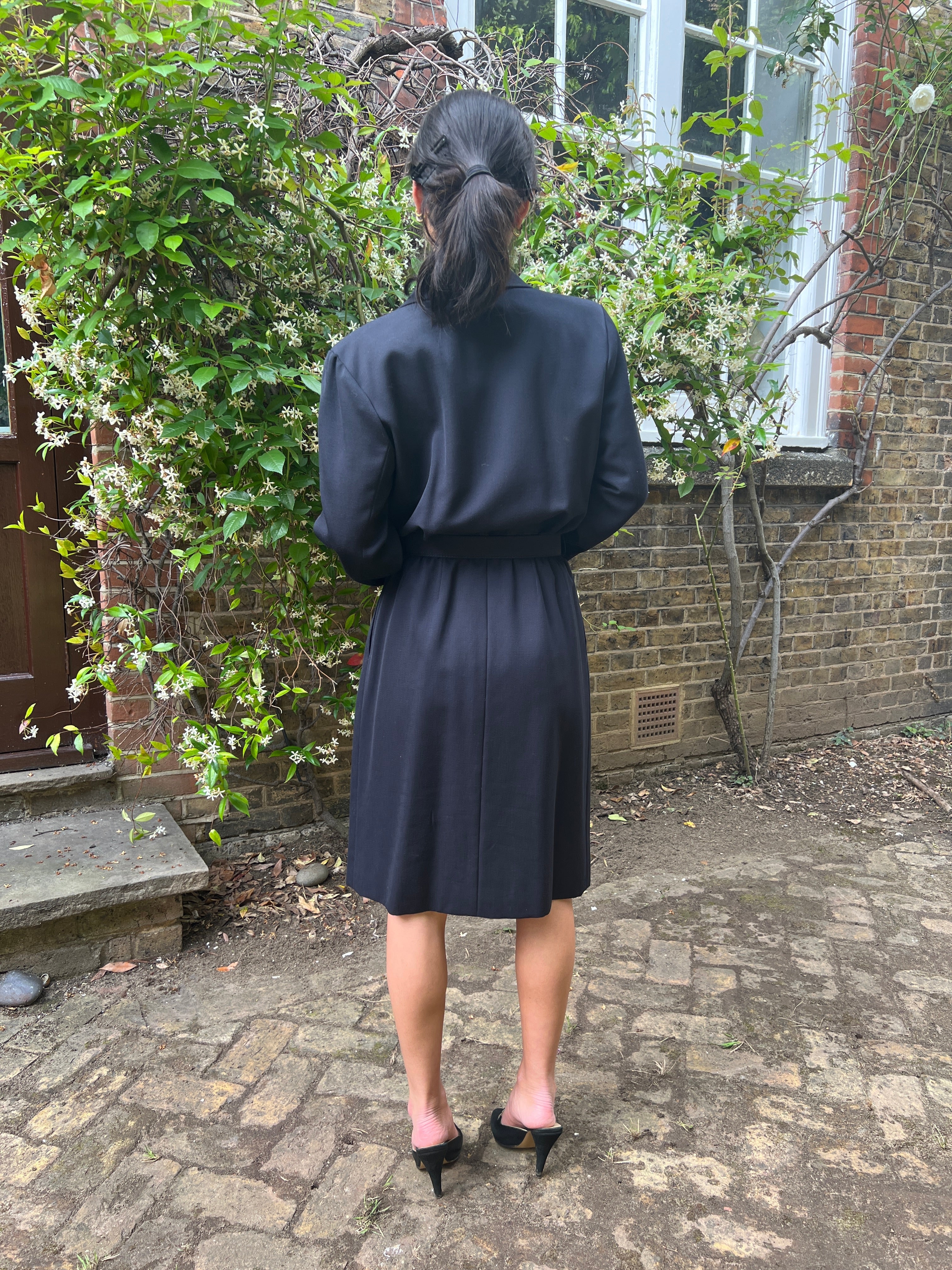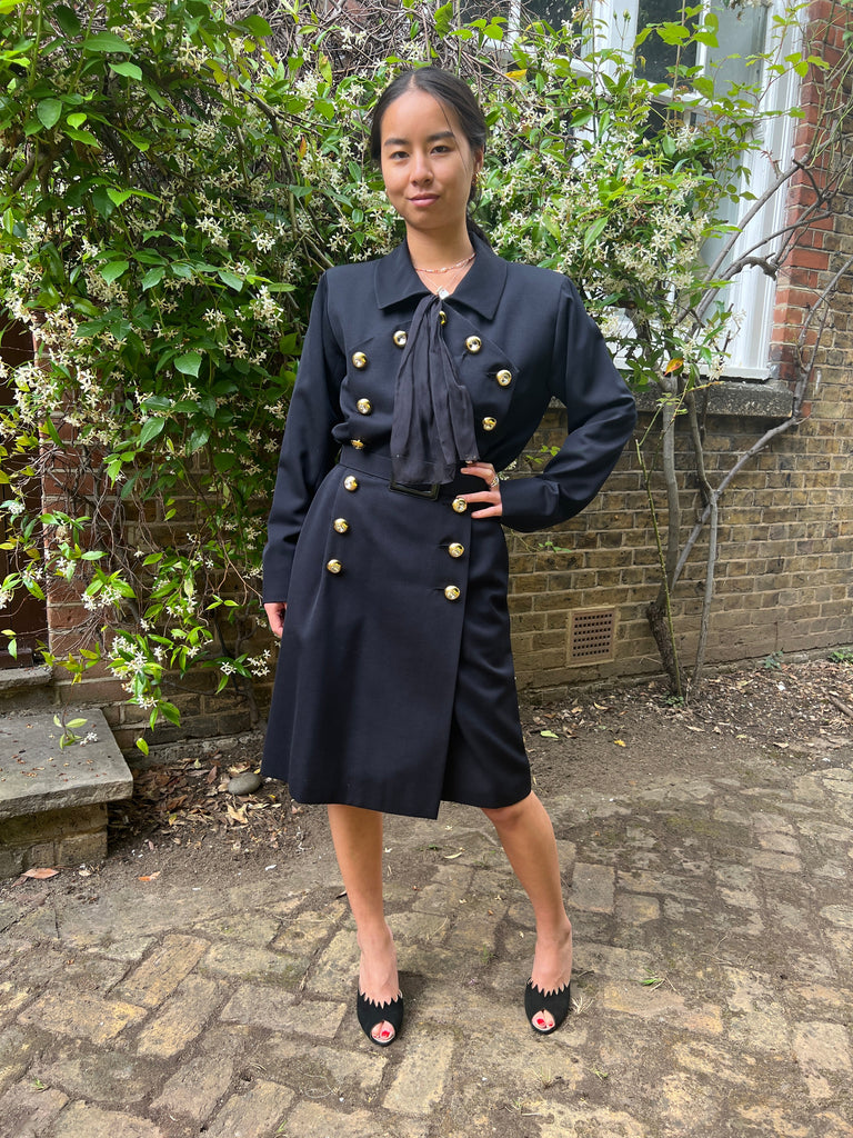 The dress is a fine black wool fabric and emulates a double breasted military style jacket with an impressive array of gold gilt buttons with crystal inset. The buttons travel from the lapel collar at diagonals over the bust before descending in parallel to the hip. The left button stand unfastens all the way with a hook eye fastening to secure the waist. The collar features a silk organza tie detail arranged in a bow whilst the matching belt buckles at the centre-front to complete the look. The straight calf length skirt has concealed pockets on each hip with pleated folds either side and a wrap over design creating a subtle opening to the left. Lined in a silk feel fabric throughout. This striking piece is chic, timeless and transitions effortlessly from day time to evening wear. Would best fit sizes up to a US size 4, UK 8. Please note, we have lightened slightly to show the fabric detail.