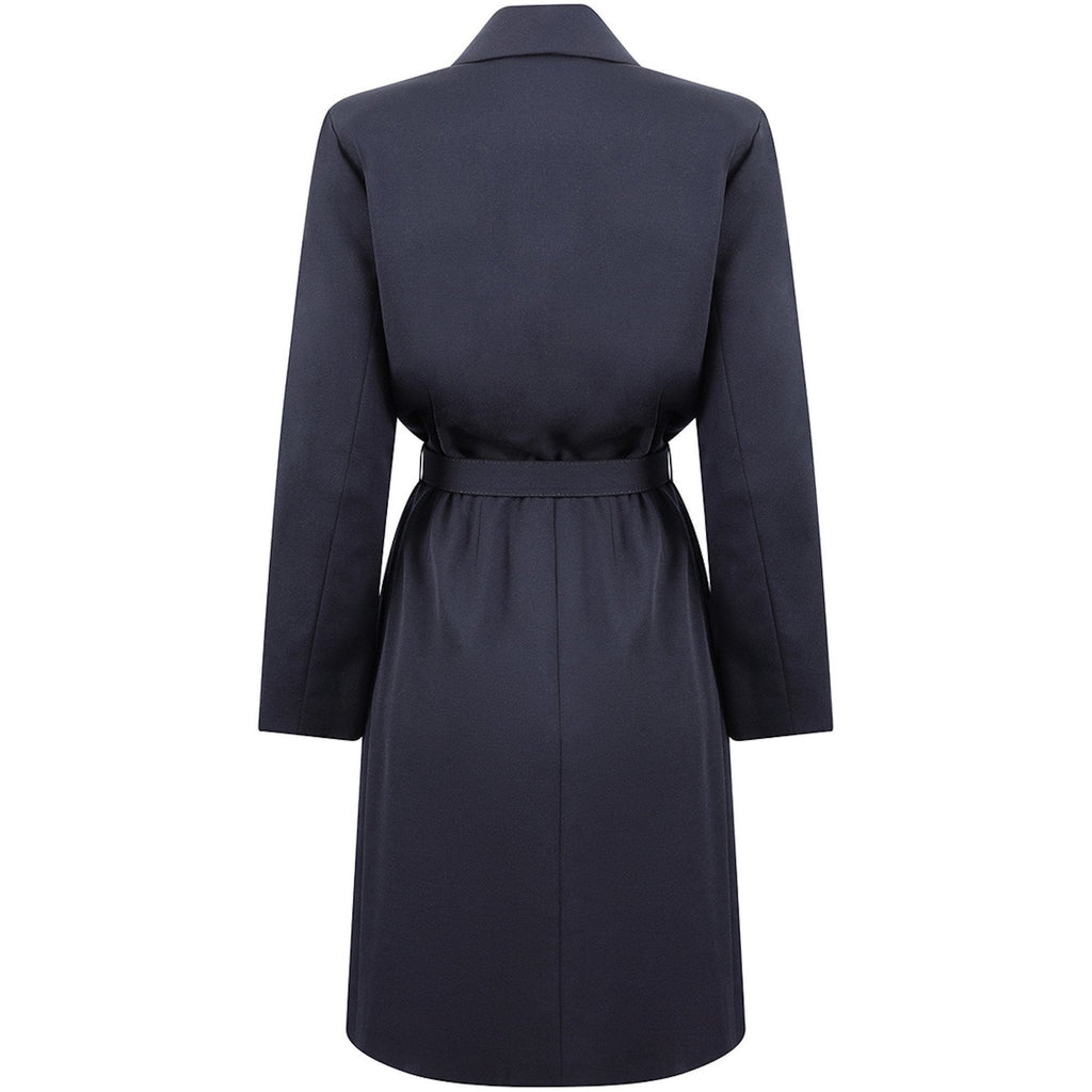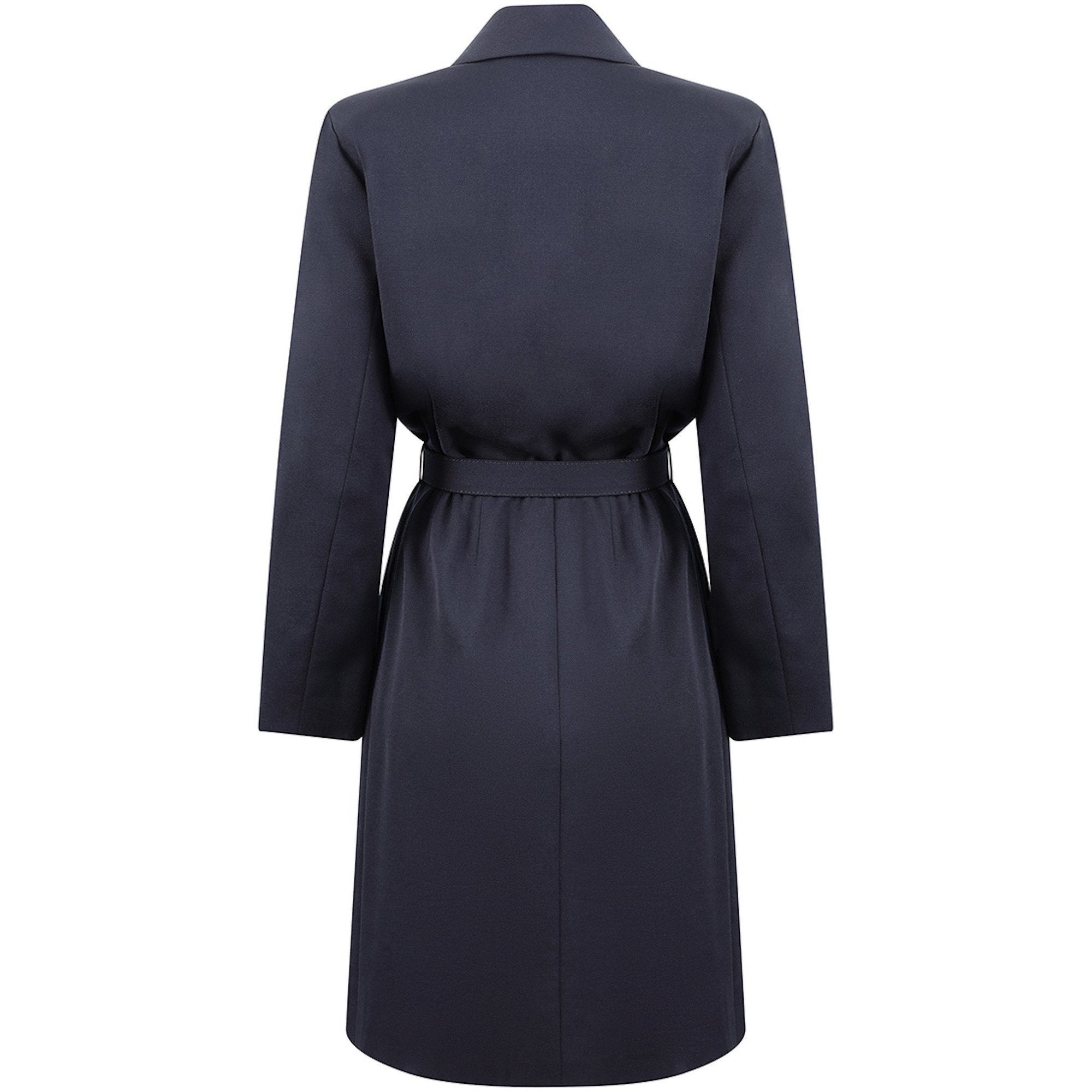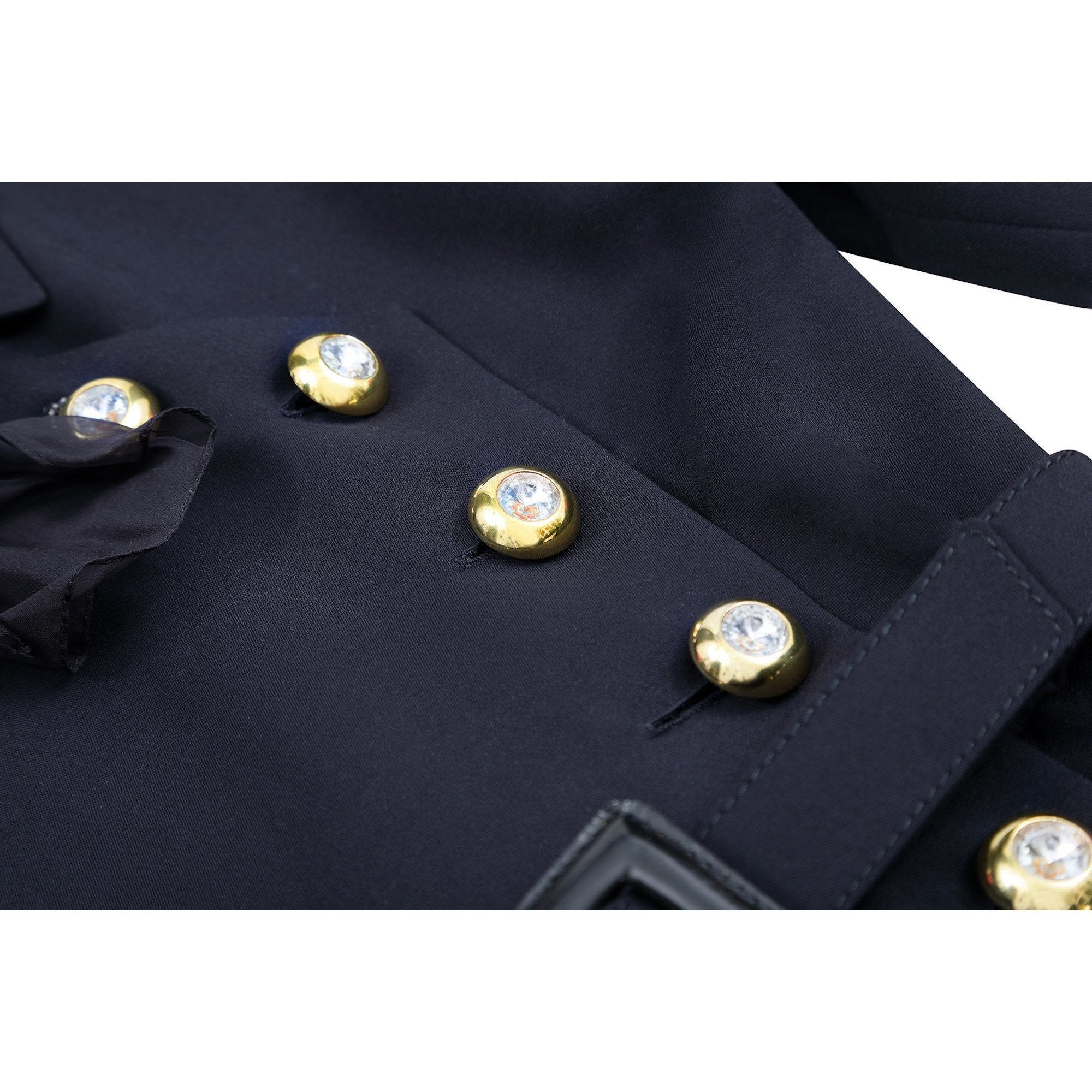 The dress is a fine black wool fabric and emulates a double breasted military style jacket with an impressive array of gold gilt buttons with crystal inset. The buttons travel from the lapel collar at diagonals over the bust before descending in parallel to the hip. The left button stand unfastens all the way with a hook eye fastening to secure the waist. The collar features a silk organza tie detail arranged in a bow whilst the matching belt buckles at the centre-front to complete the look. The straight calf length skirt has concealed pockets on each hip with pleated folds either side and a wrap over design creating a subtle opening to the left. Lined in a silk feel fabric throughout. This striking piece is chic, timeless and transitions effortlessly from day time to evening wear. Would best fit sizes up to a US size 4, UK 8. Please note, we have lightened slightly to show the fabric detail.