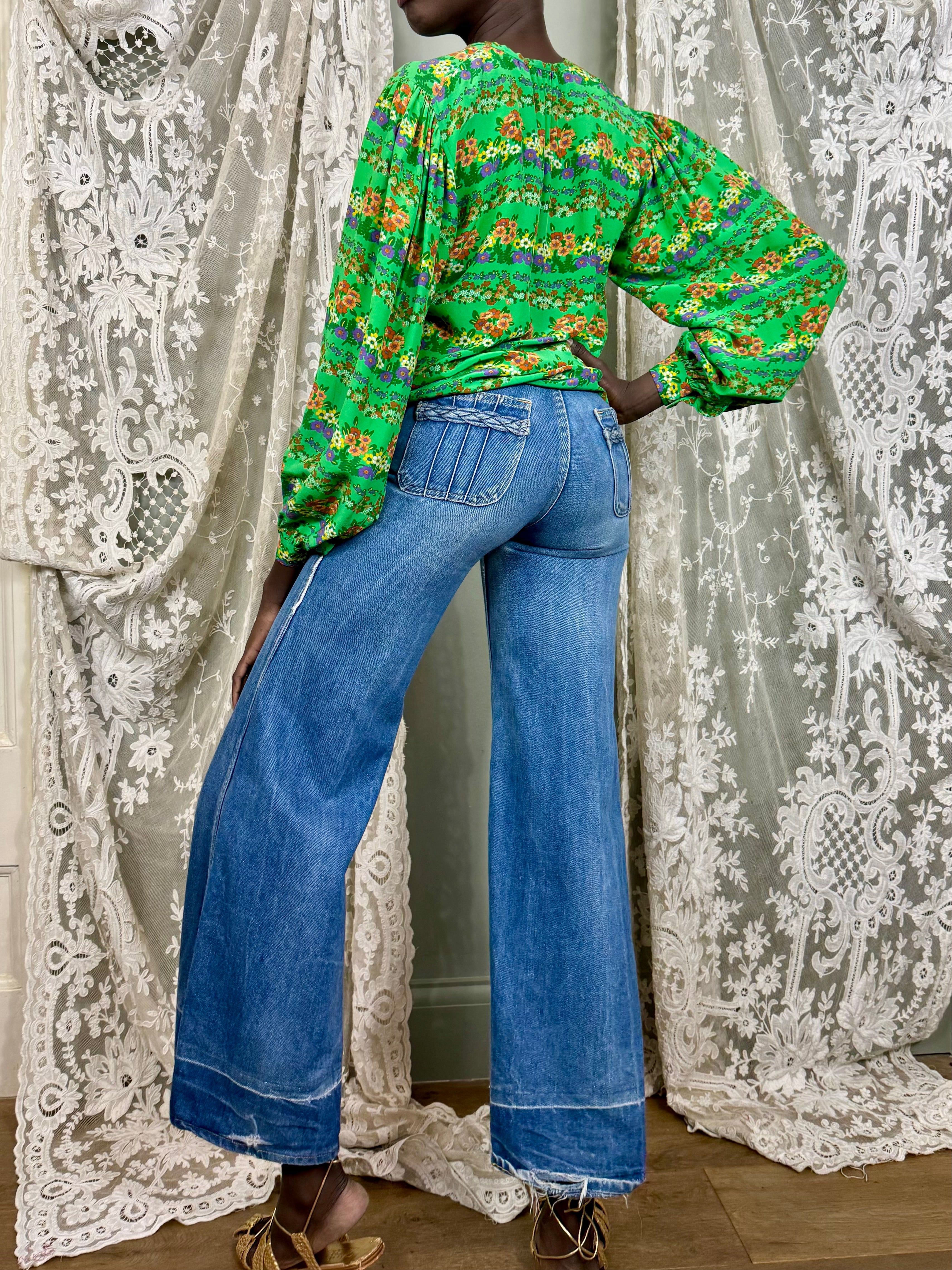 This collectible Yves Saint Laurent blouse from the 80s features a beautifully crafted silk peasant design with balloon sleeves and a front V neckline with a tie. The elegant and straight fit offers a timeless and sophisticated look.