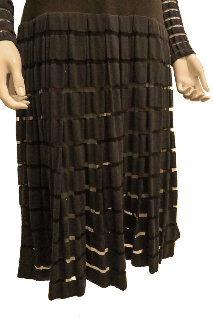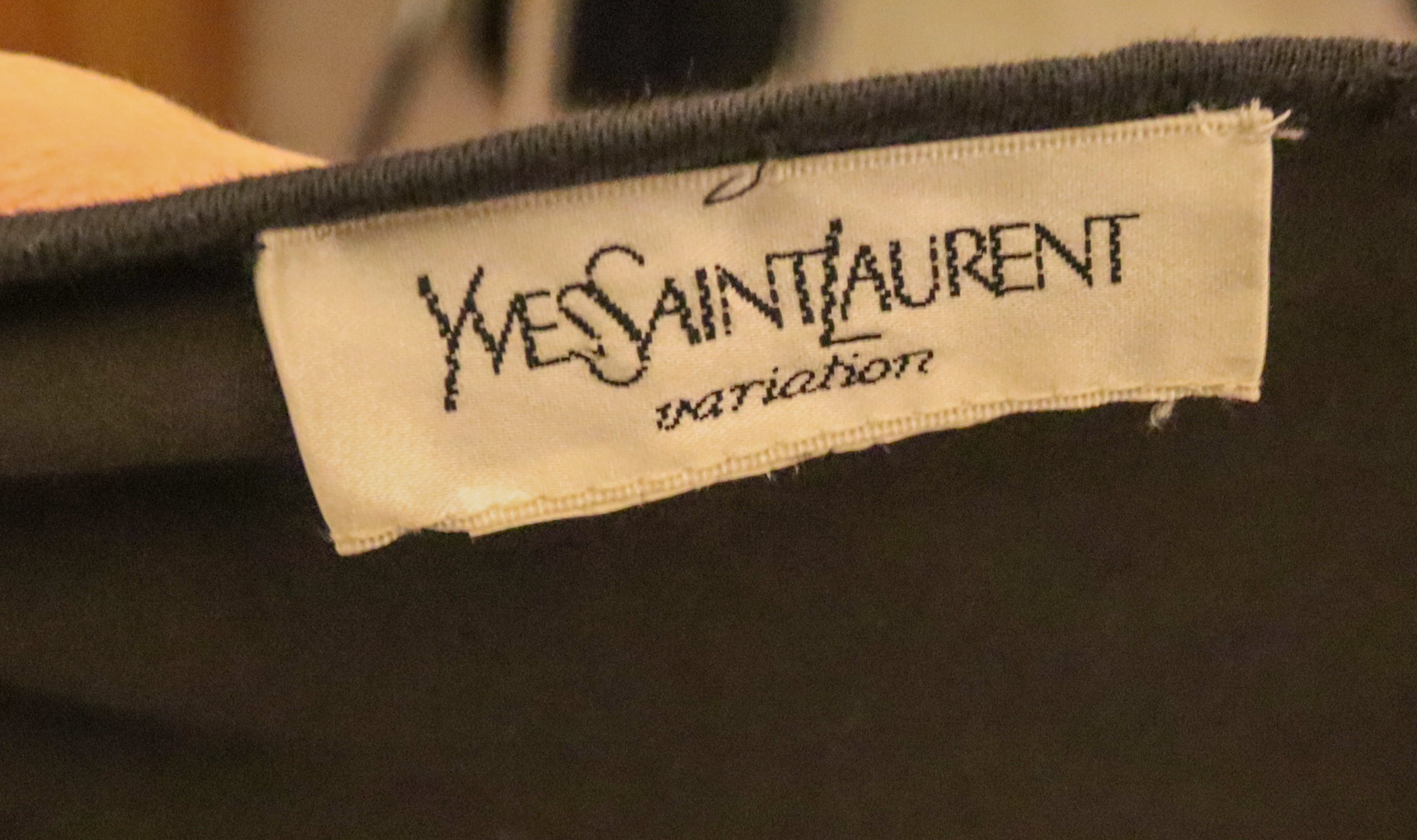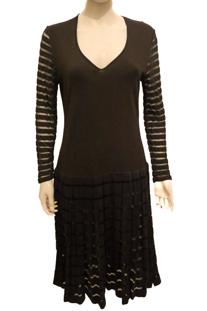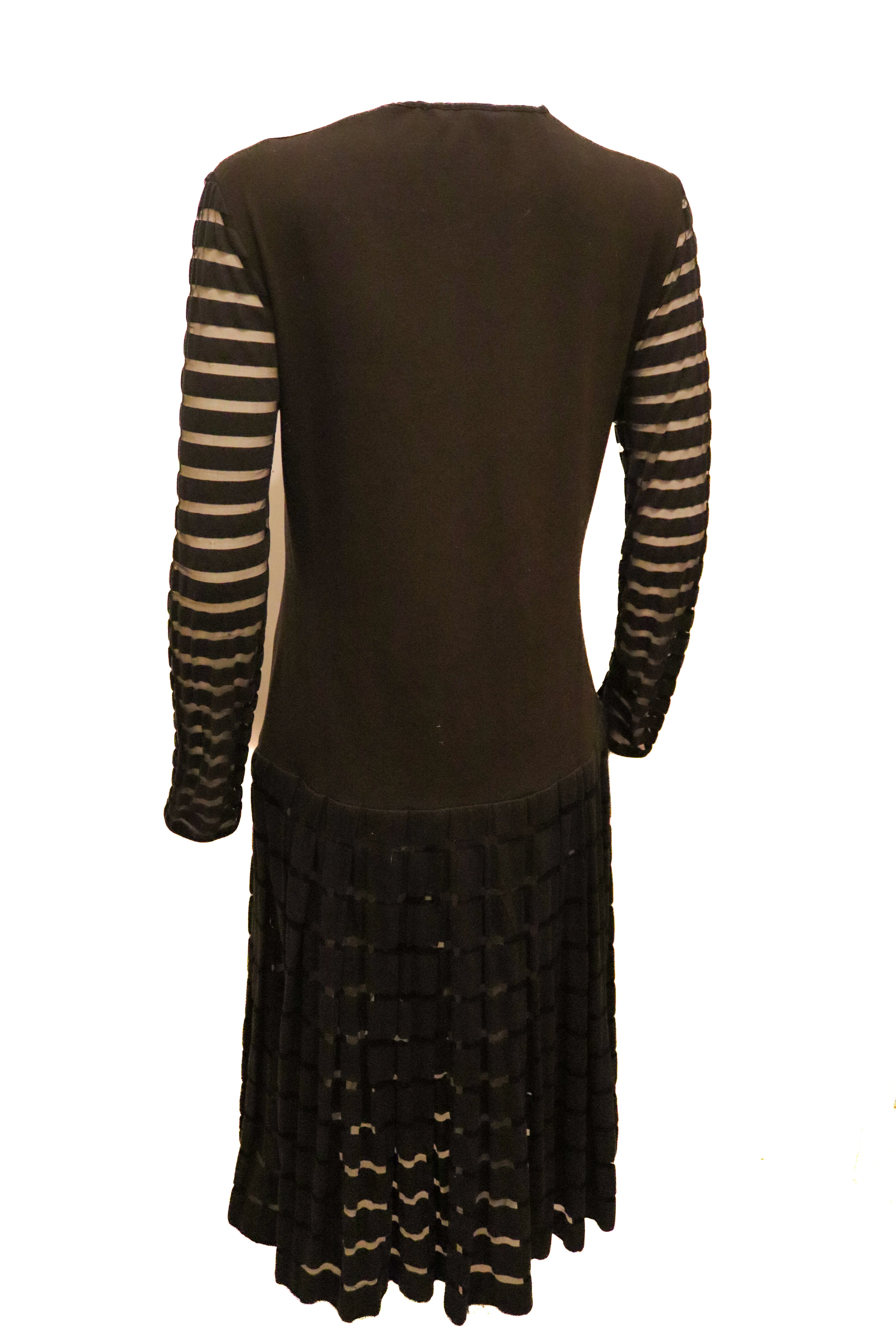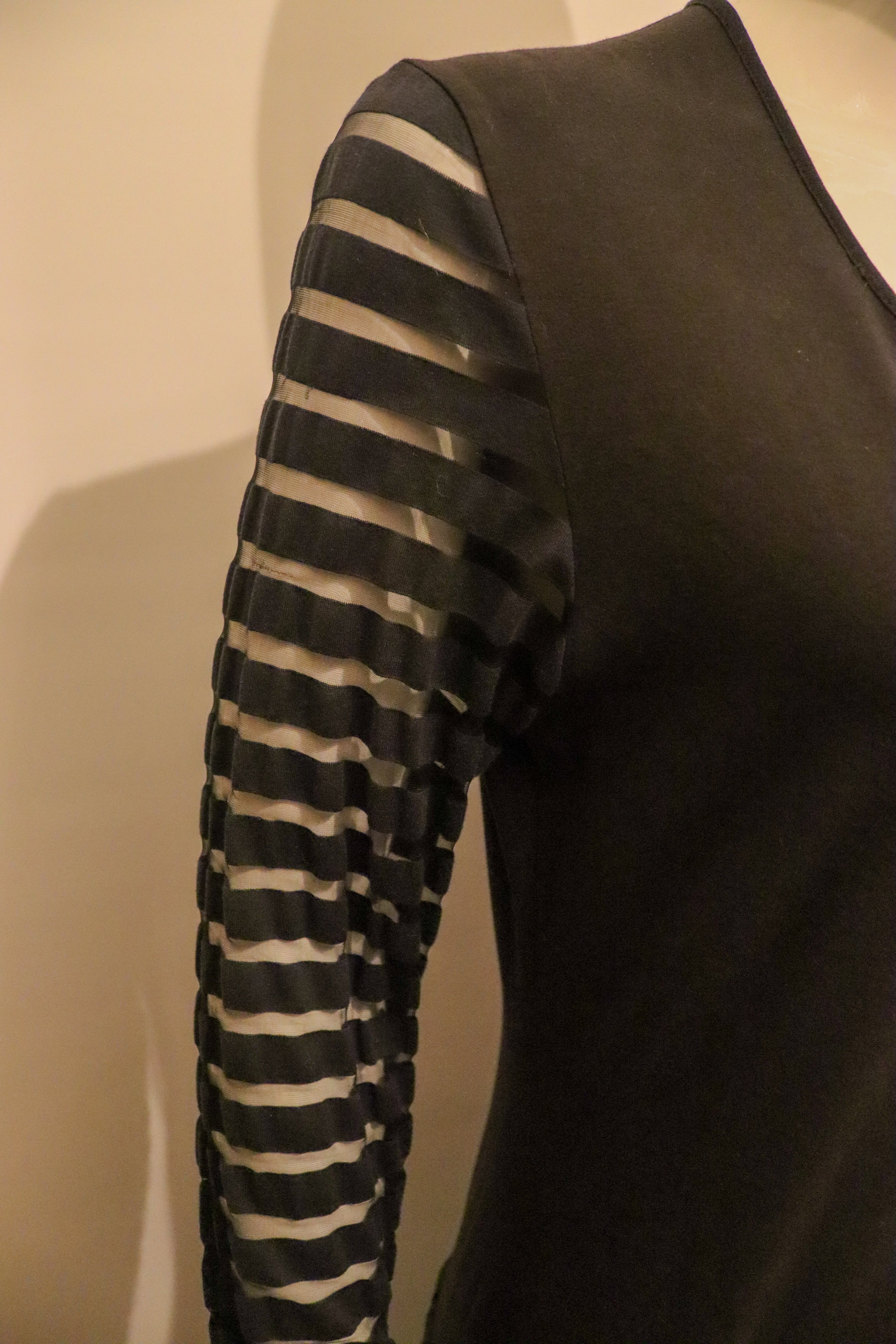 An easy to wear and interesting dress by Yves Saint Laurent , variation line. In a black jersey like fabric, the dress has a v neckline and cut away detail on the sleaves and hem.