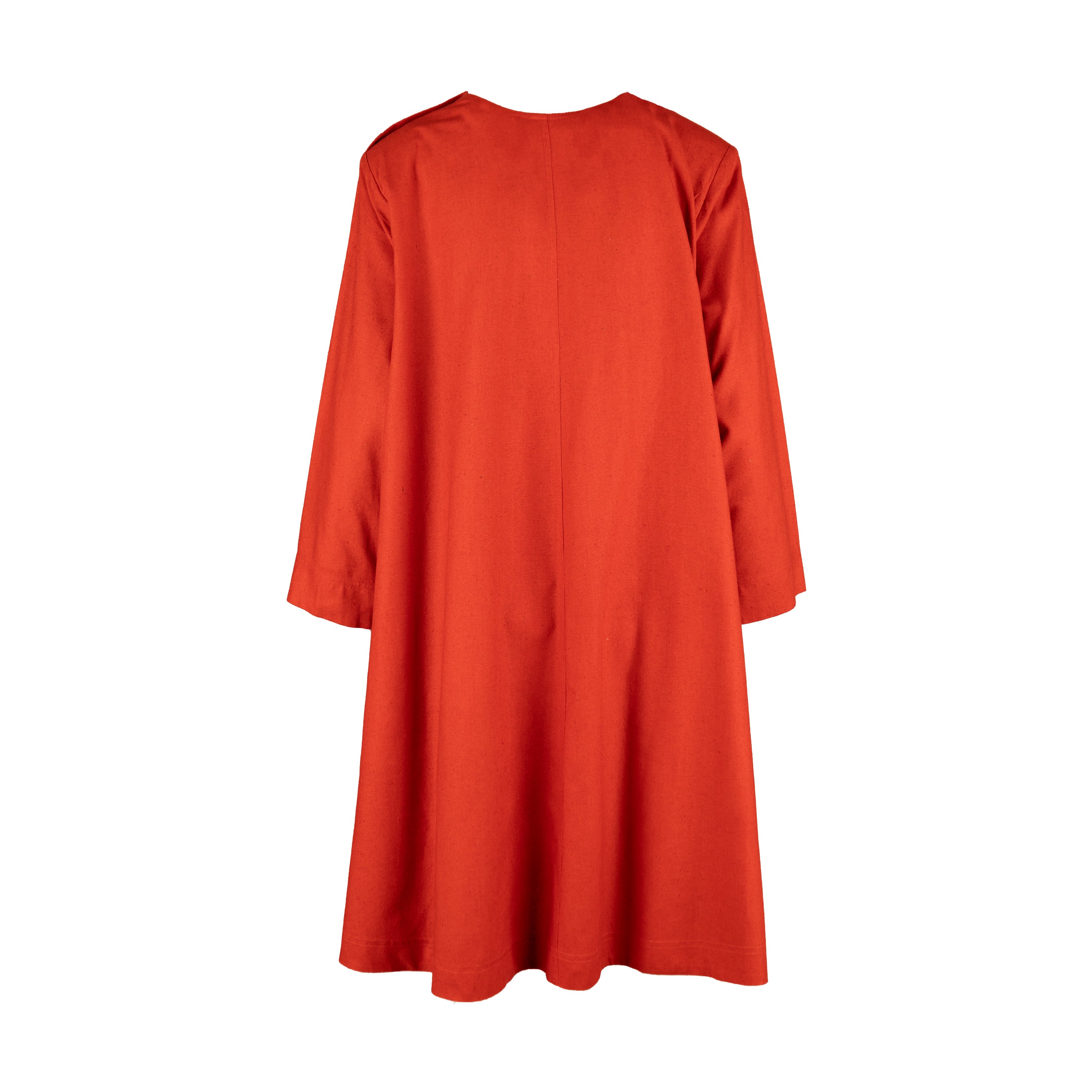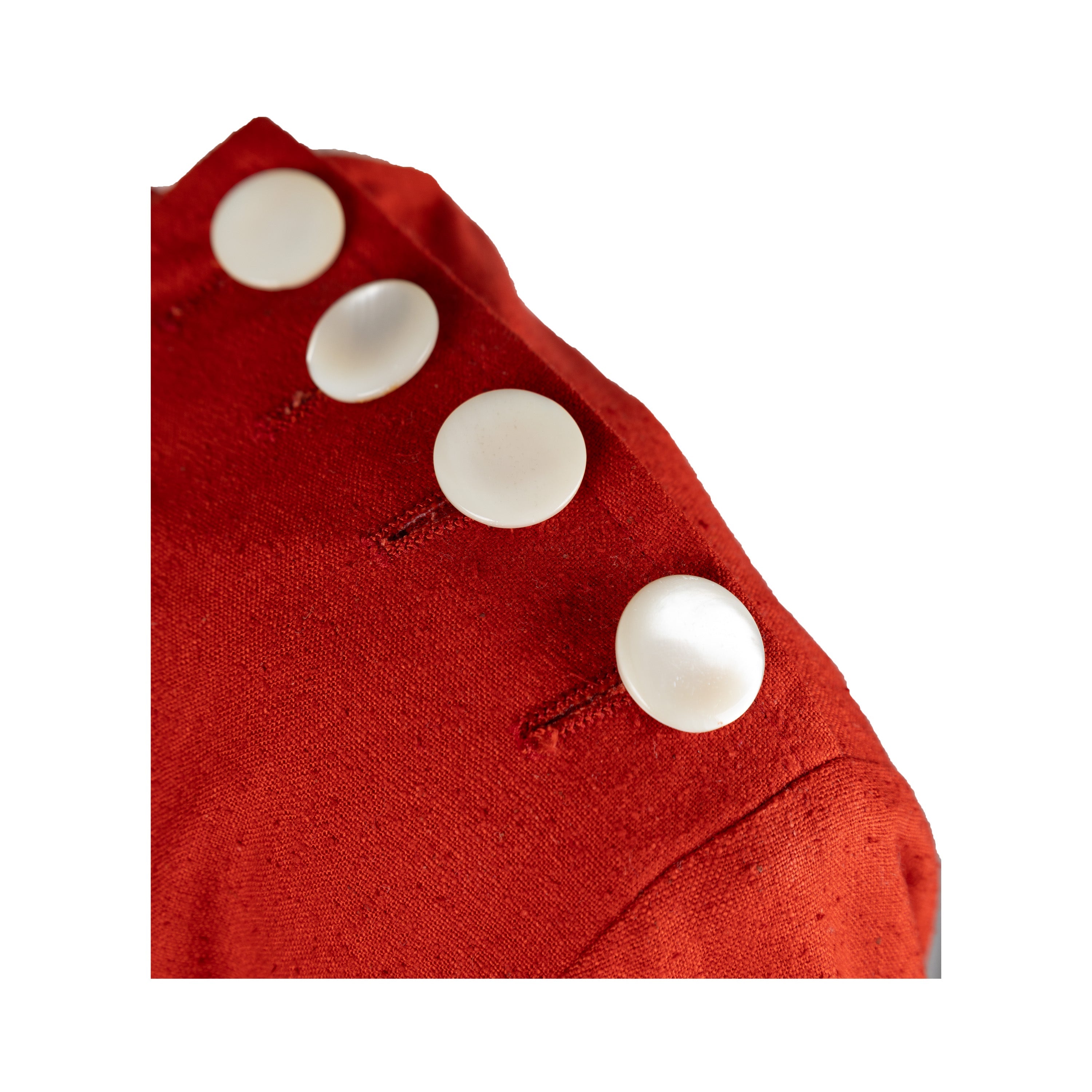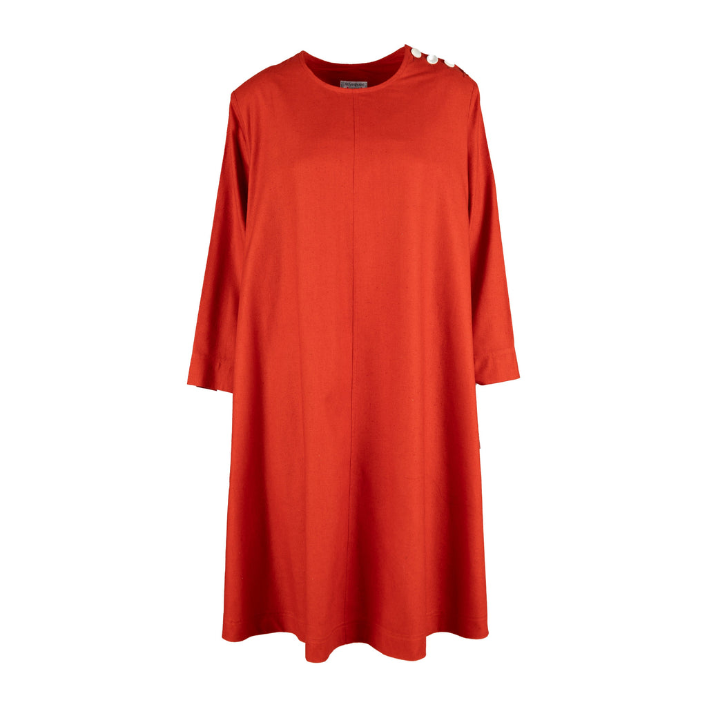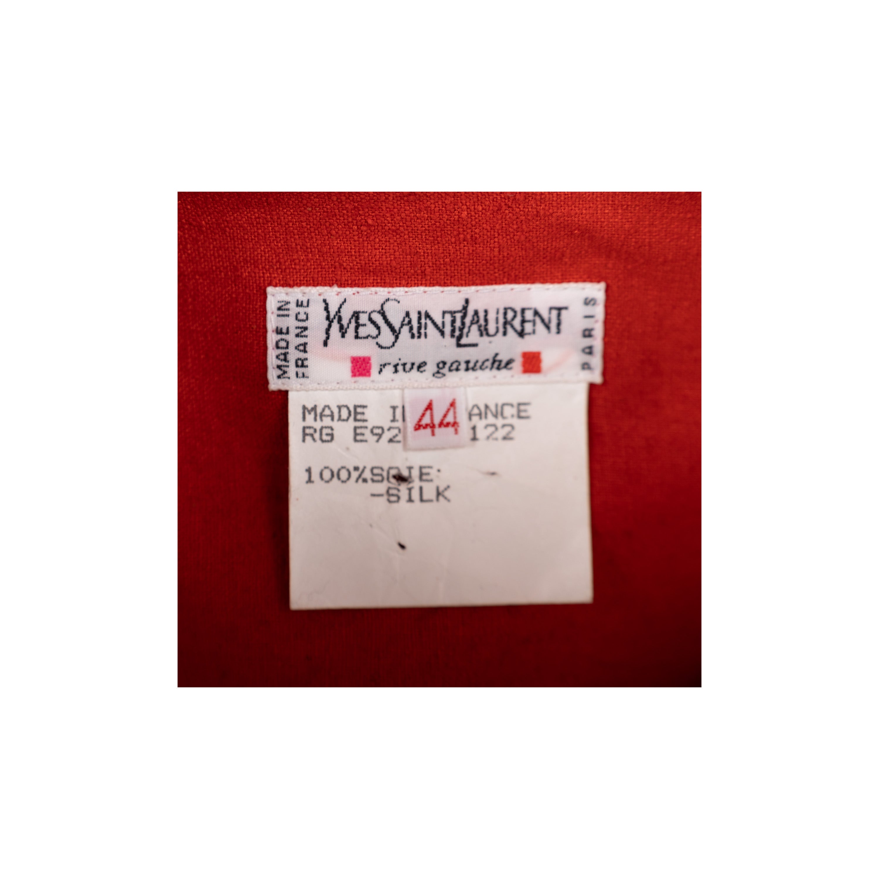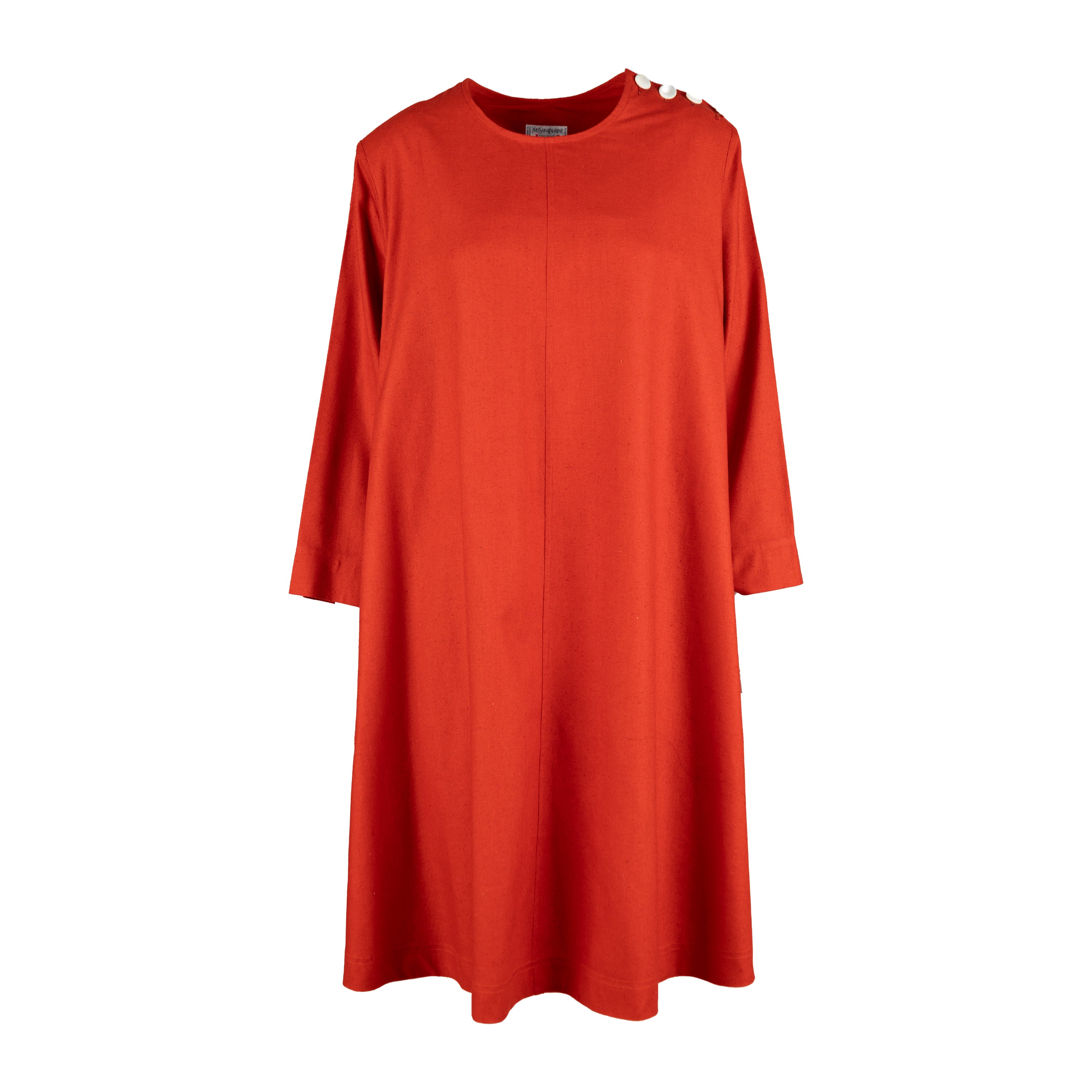 This Yves Saint Laurent dress from the 90s offers a relaxed fit for comfortable wear. Featuring a vibrant red color and quarter-length sleeves, it also includes four white buttons at the shoulder for a touch of style. The rive gauche label adds a hint of vintage luxury, and it even has pockets for added convenience.