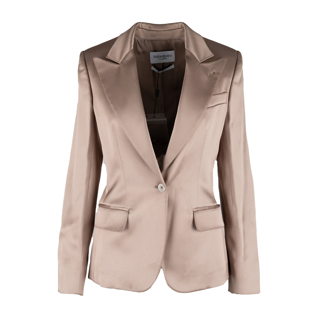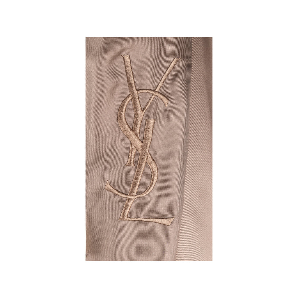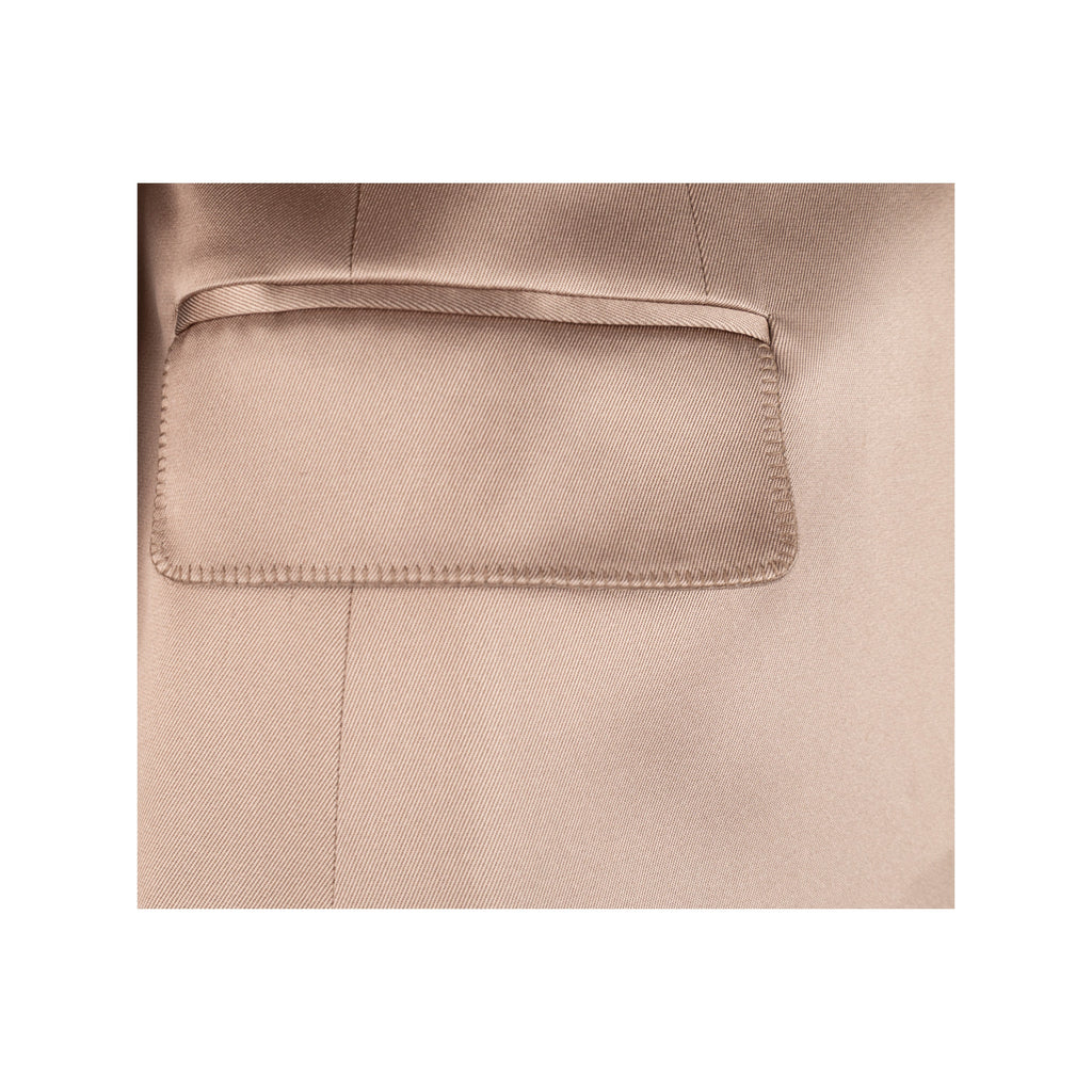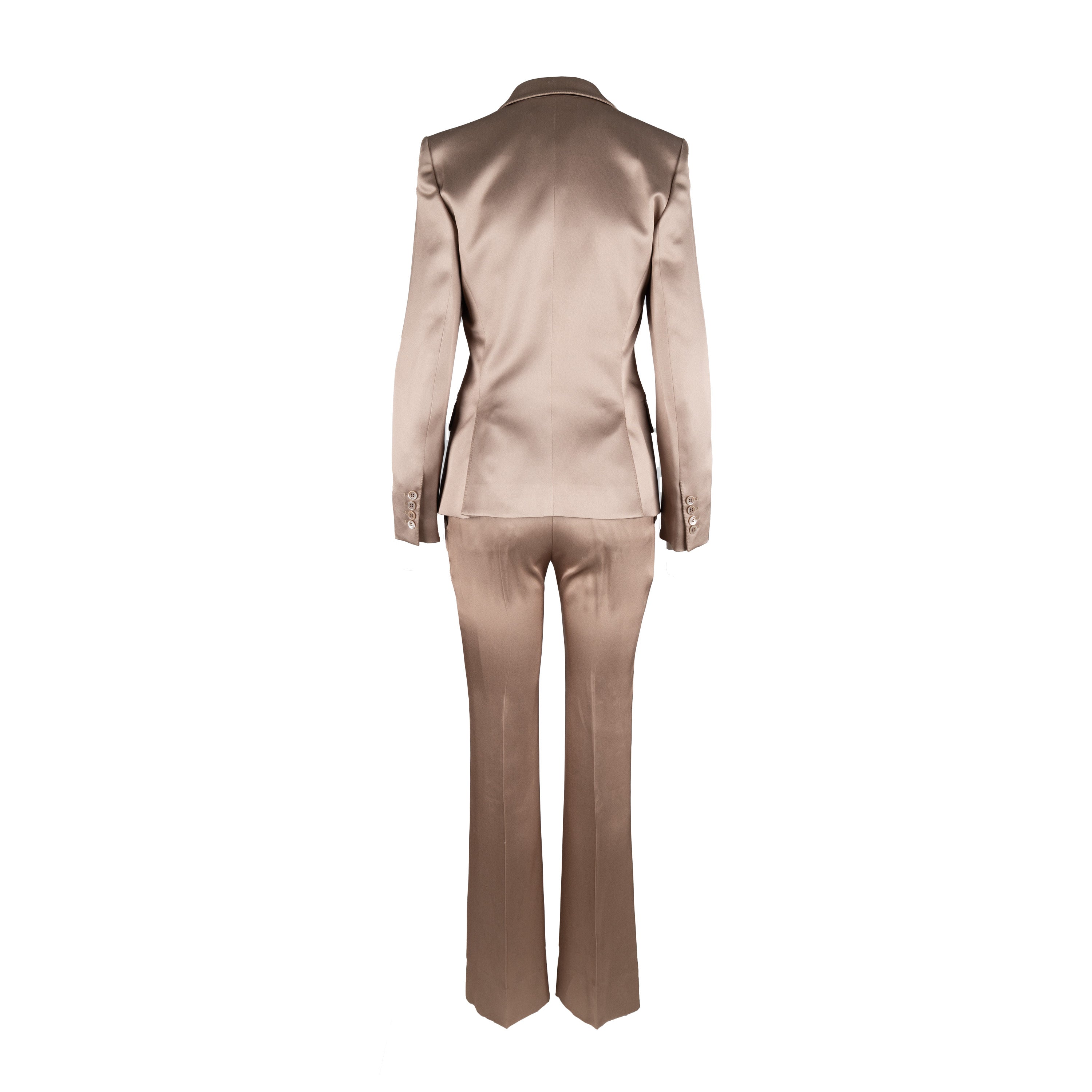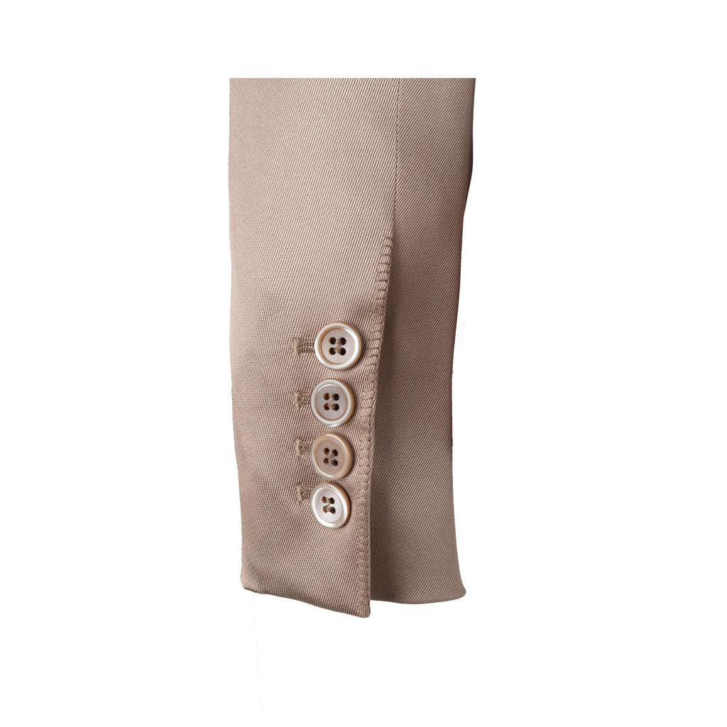 This Yves Saint Laurent Silk Suit, designed by Tom Ford circa 2000s, is expertly crafted from 100% silk in a beige hue with a subtle sheen. Showcasing a signature spread lapel collar, one front button, two flap pockets and a chest pocket with an embroidered YSL logo inside the lining. The tailored, straight fit pants feature a front zip closure and two side pockets.
