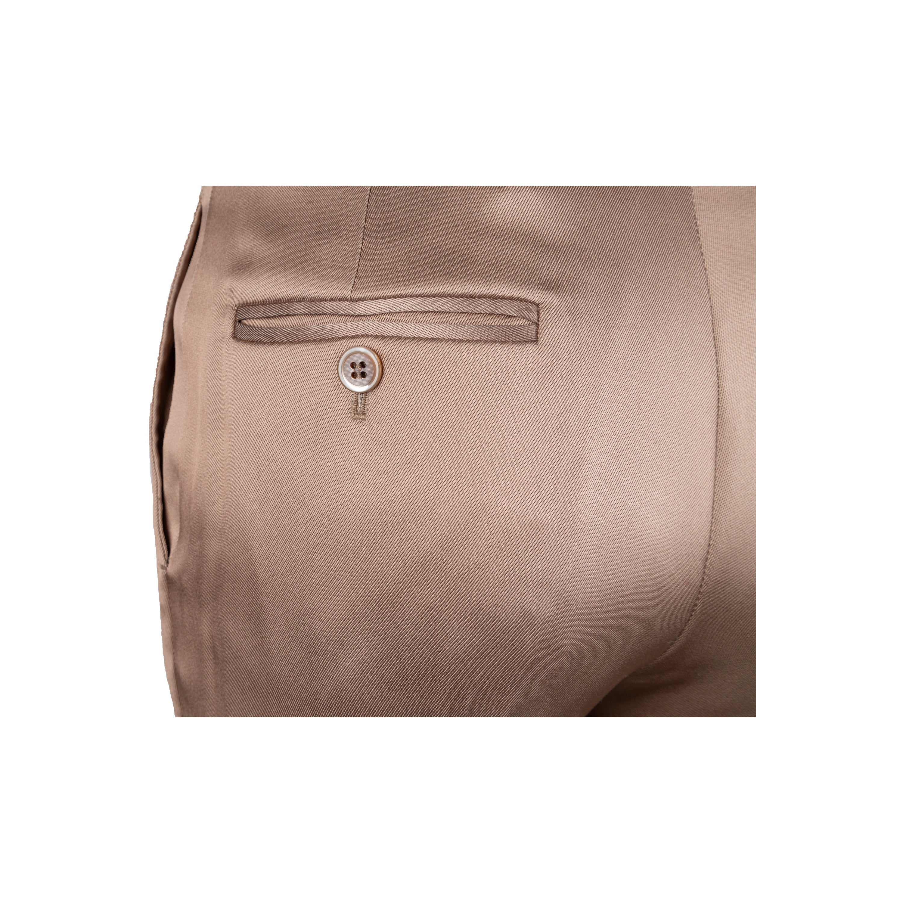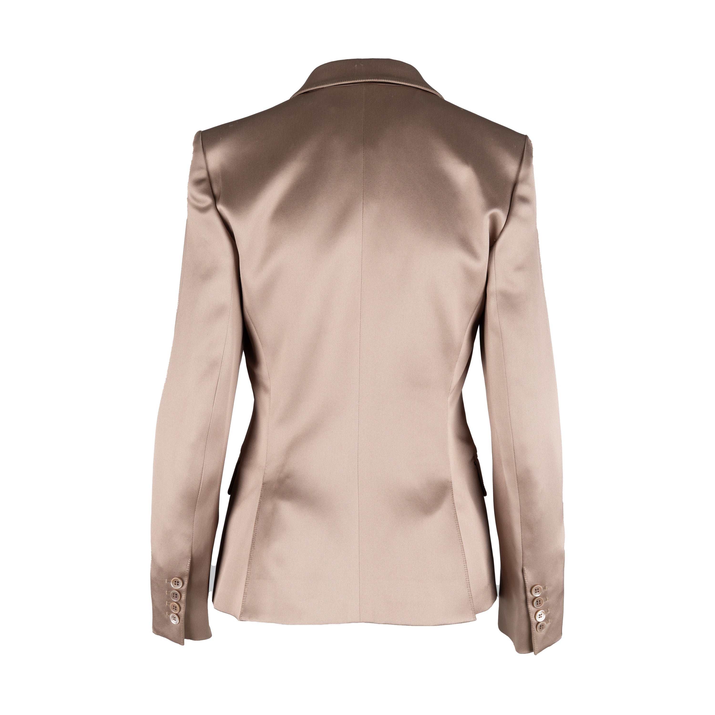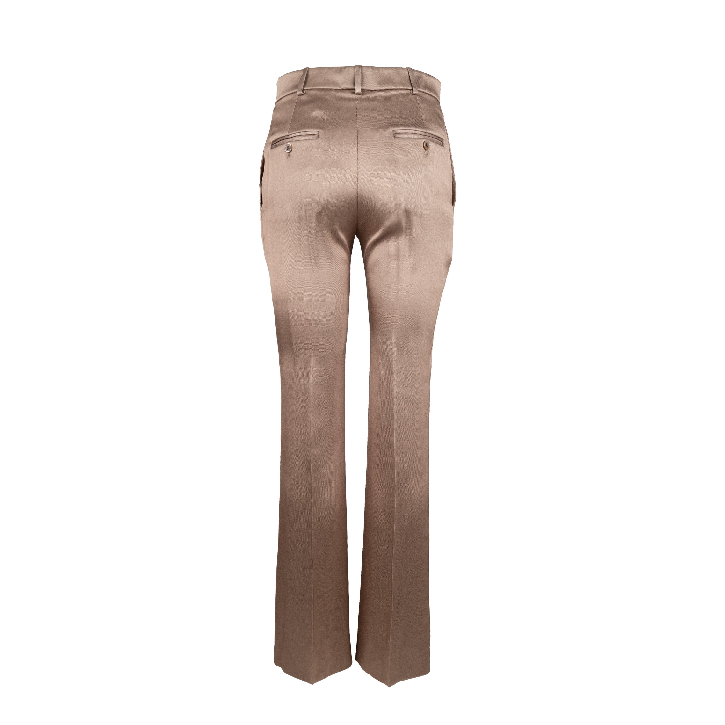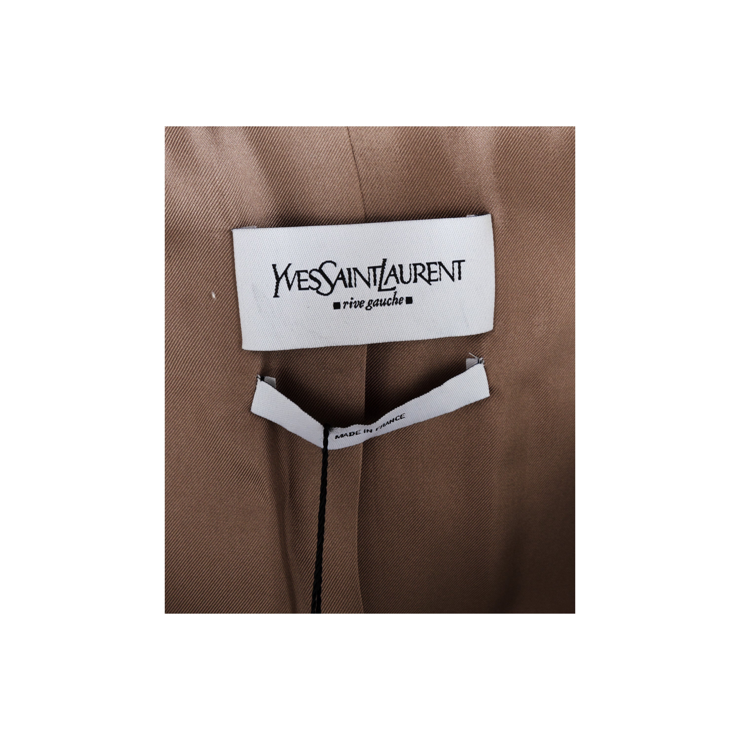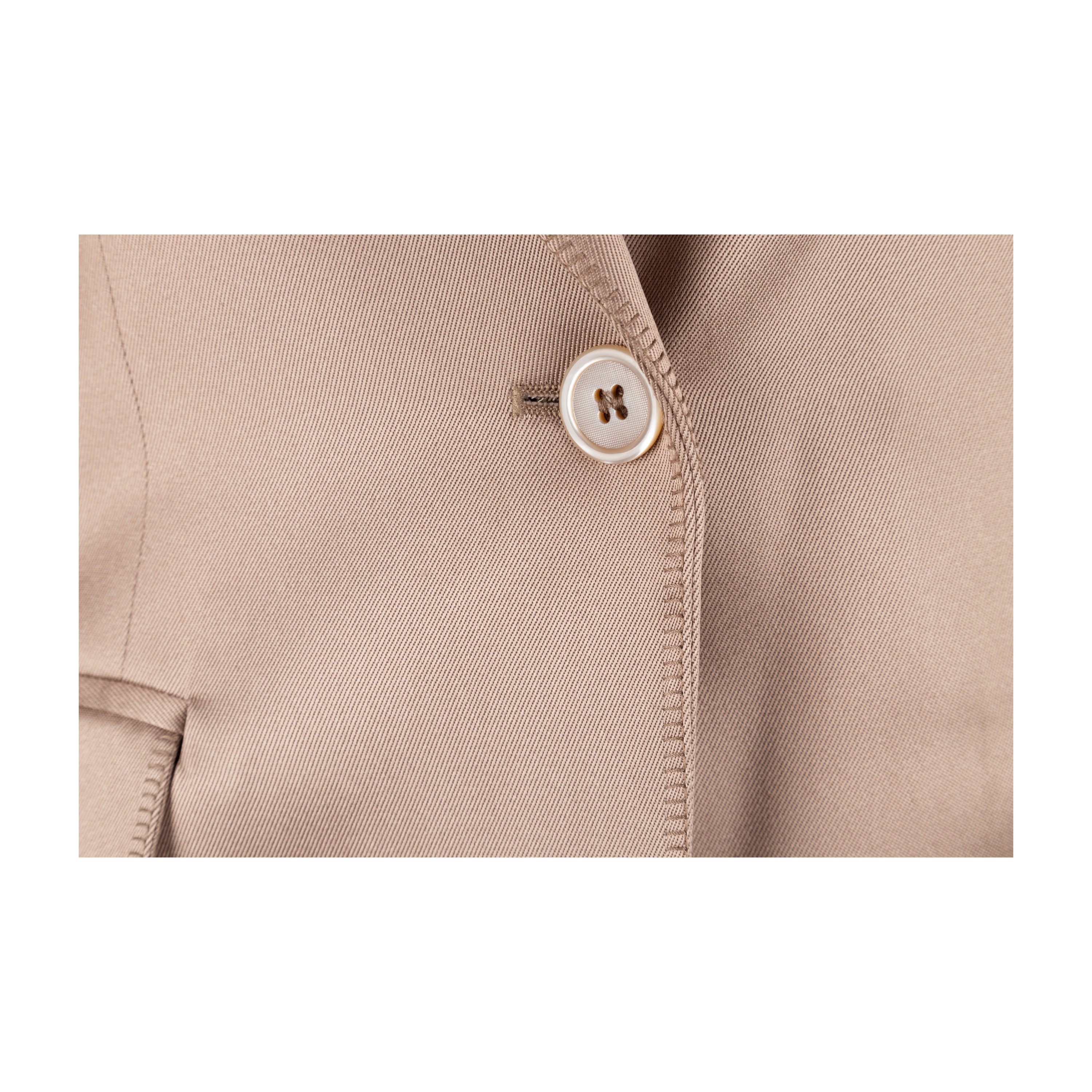 This Yves Saint Laurent Silk Suit, designed by Tom Ford circa 2000s, is expertly crafted from 100% silk in a beige hue with a subtle sheen. Showcasing a signature spread lapel collar, one front button, two flap pockets and a chest pocket with an embroidered YSL logo inside the lining. The tailored, straight fit pants feature a front zip closure and two side pockets.