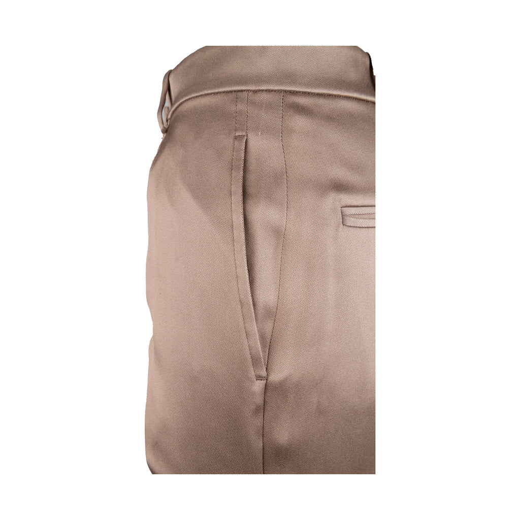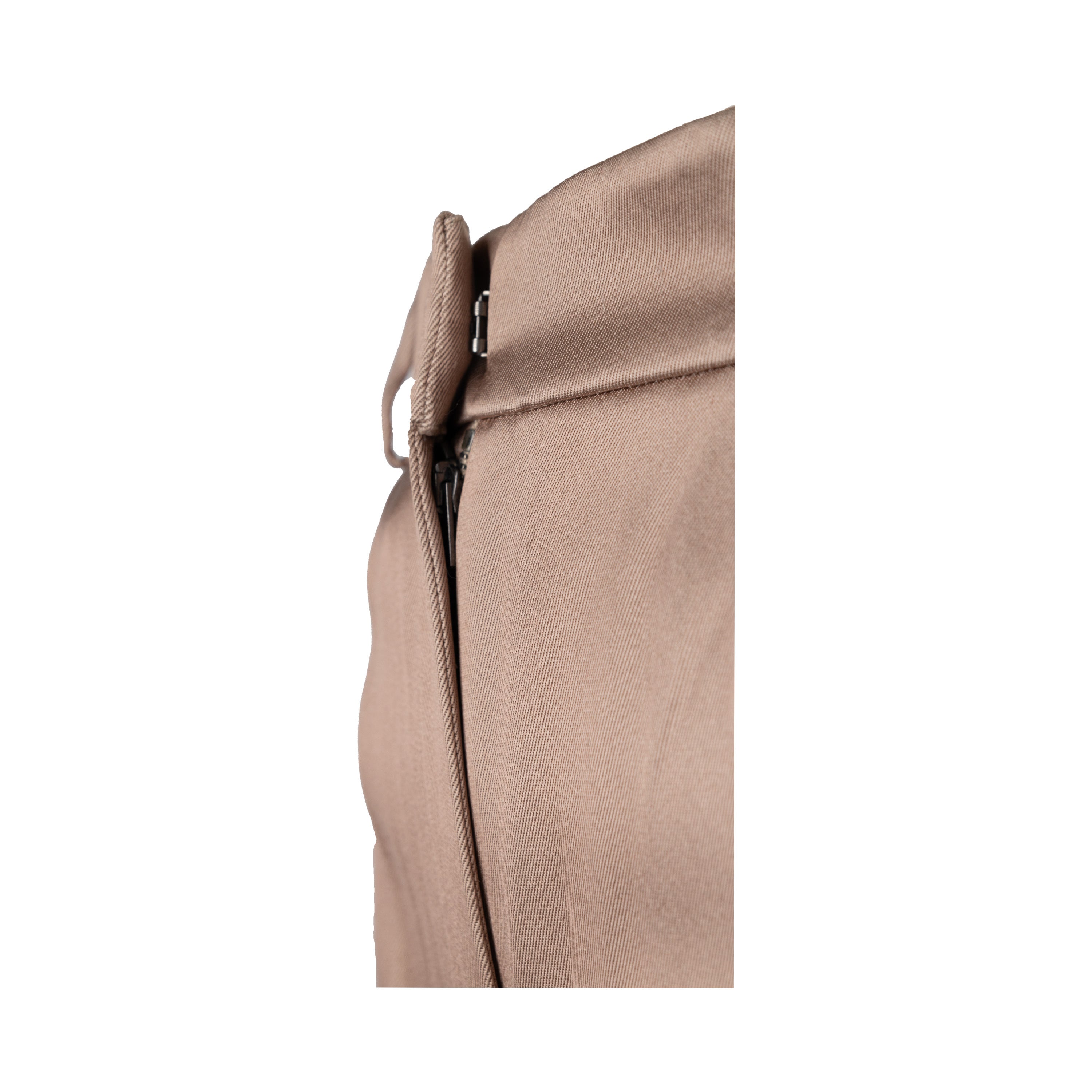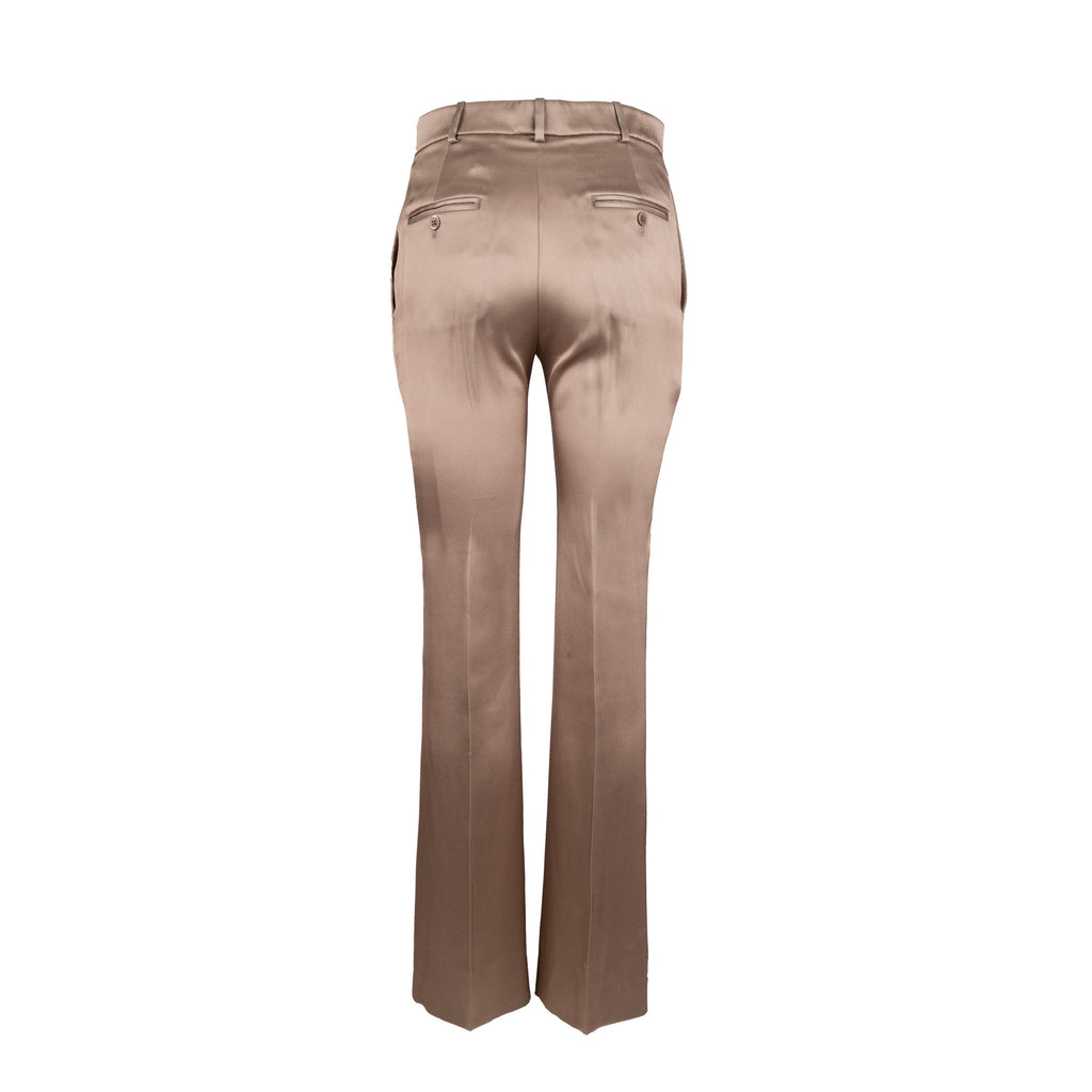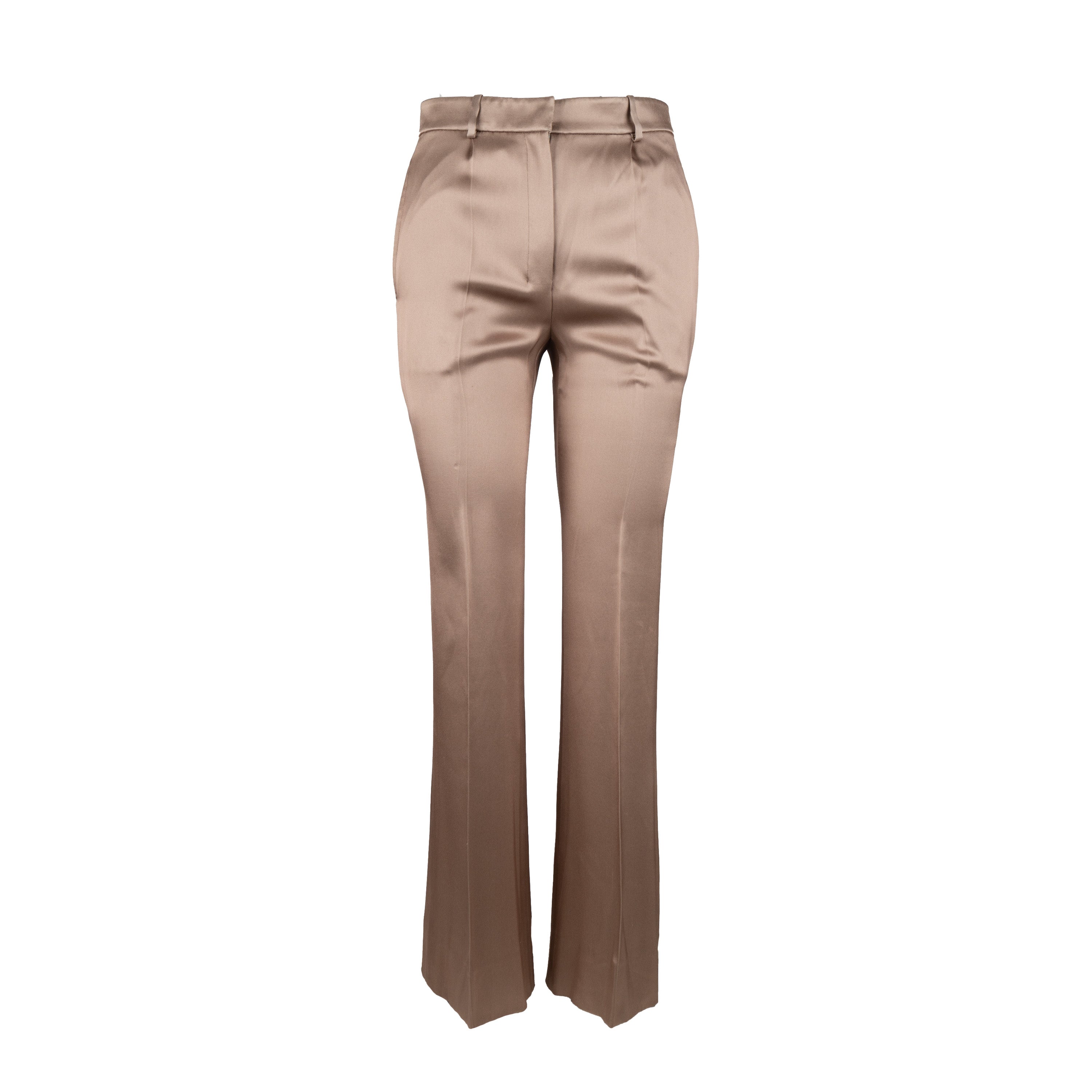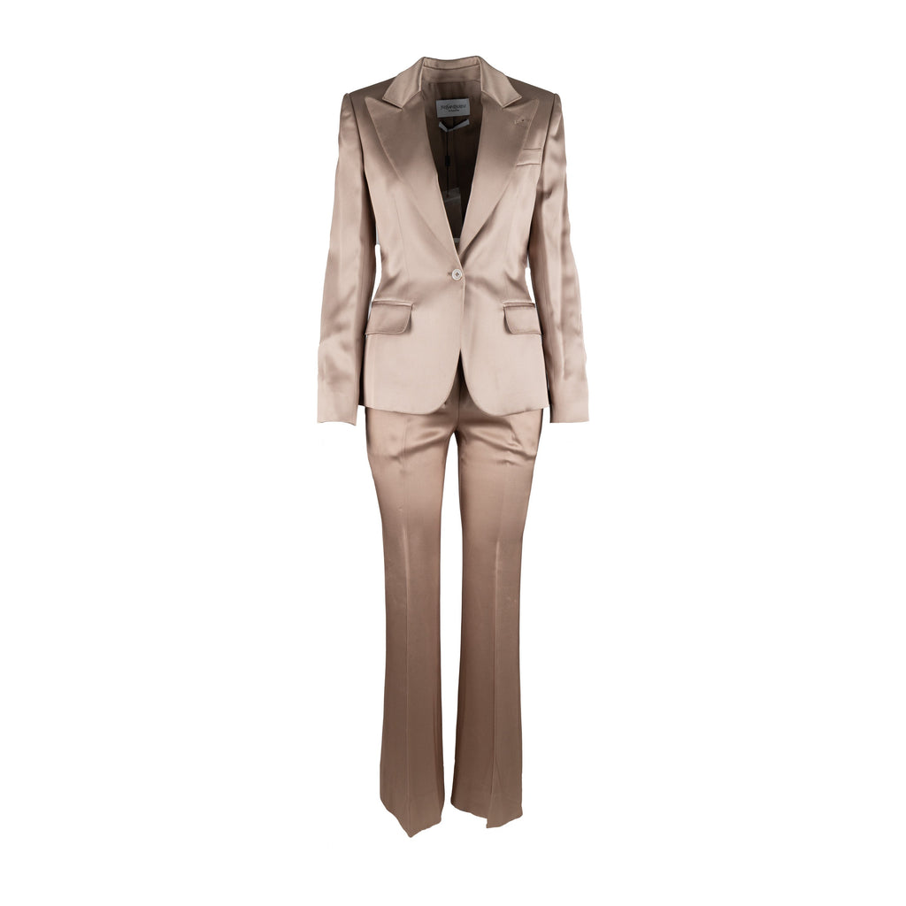 This Yves Saint Laurent Silk Suit, designed by Tom Ford circa 2000s, is expertly crafted from 100% silk in a beige hue with a subtle sheen. Showcasing a signature spread lapel collar, one front button, two flap pockets and a chest pocket with an embroidered YSL logo inside the lining. The tailored, straight fit pants feature a front zip closure and two side pockets.