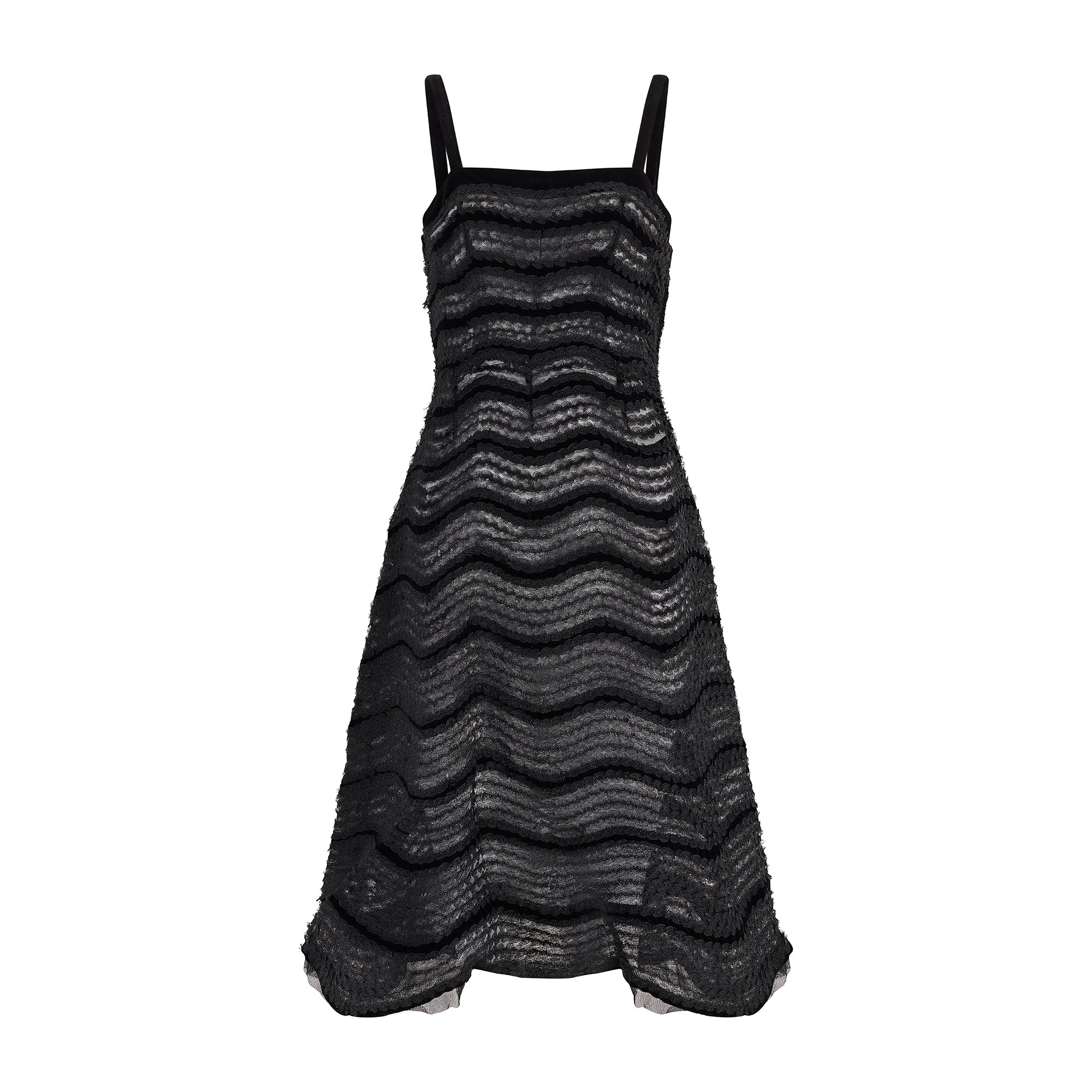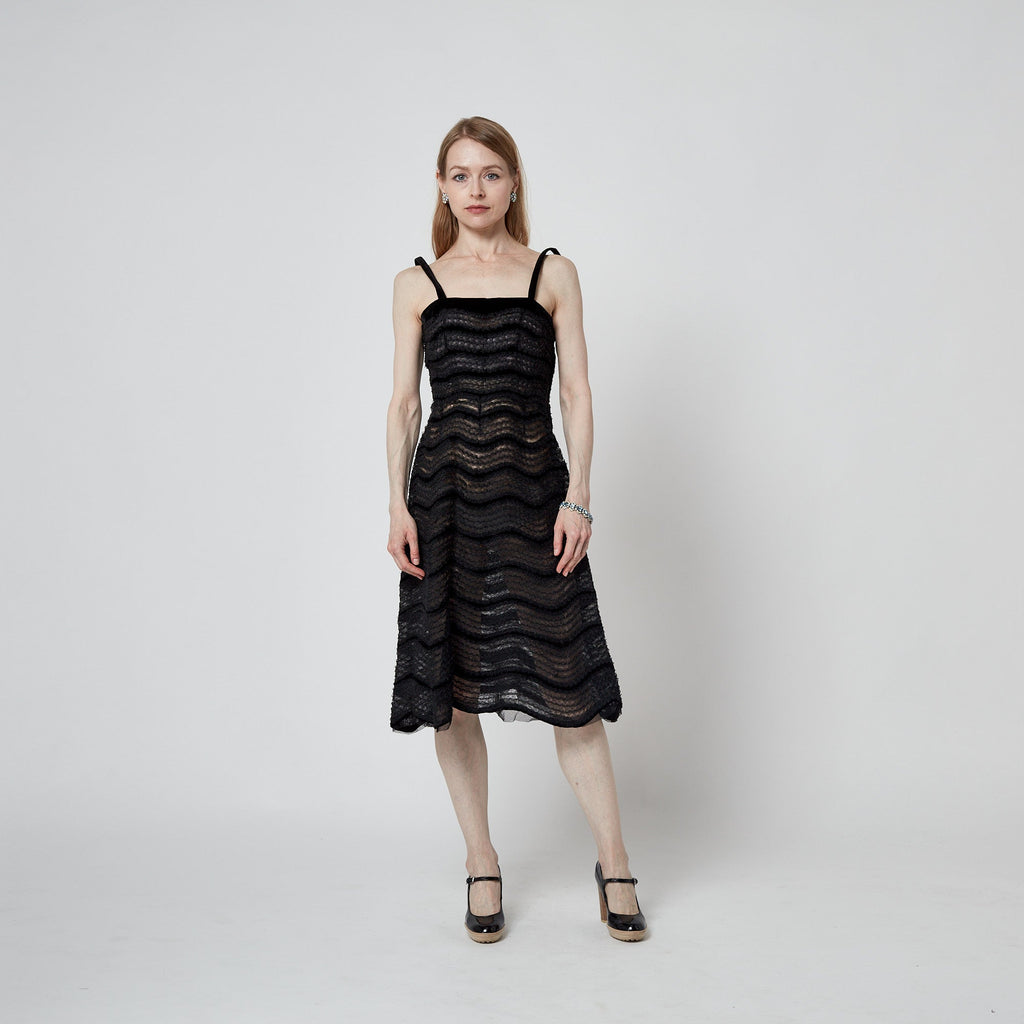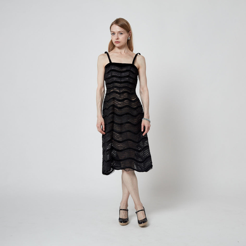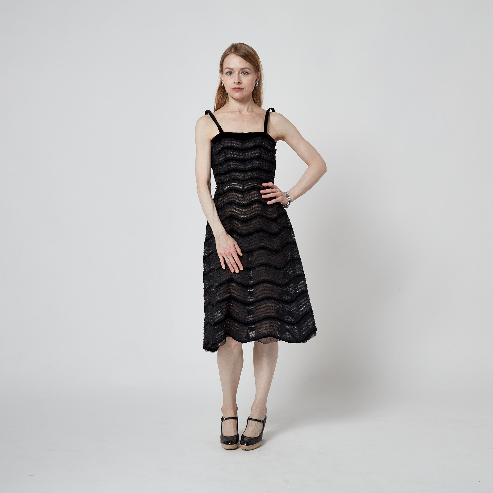 This 1950s haute couture dress reminds me of Pierre Balmain designs from the early 1950s although it is unlabelled, the quality and construction is the very best. Beautifully crafted from black tulle and horizontal stripes of thick black velvet the length of the dress. In between the velvet, the sheer tulle has been embellished with rows of stiffened, ruffled tulle. Above the bust, the neckline and shoulder straps of the dress are trimmed with black velvet. It has a classic hourglass silhouette with a flared skirt that holds its shape due to the stiffened tulle. The hem has a pretty scallop finish. It probably had a black under-dress originally and looks very contemporary 'unlined' as such paired with a black or nude slip. Alternatively, wear it with nothing underneath for a sensuous, peekaboo effect. It fastens under the arm with a hidden tonal zip.