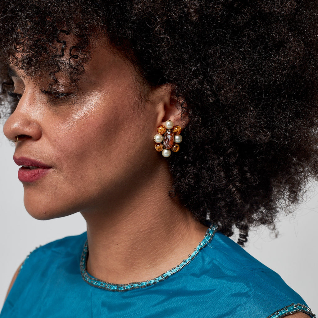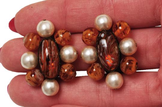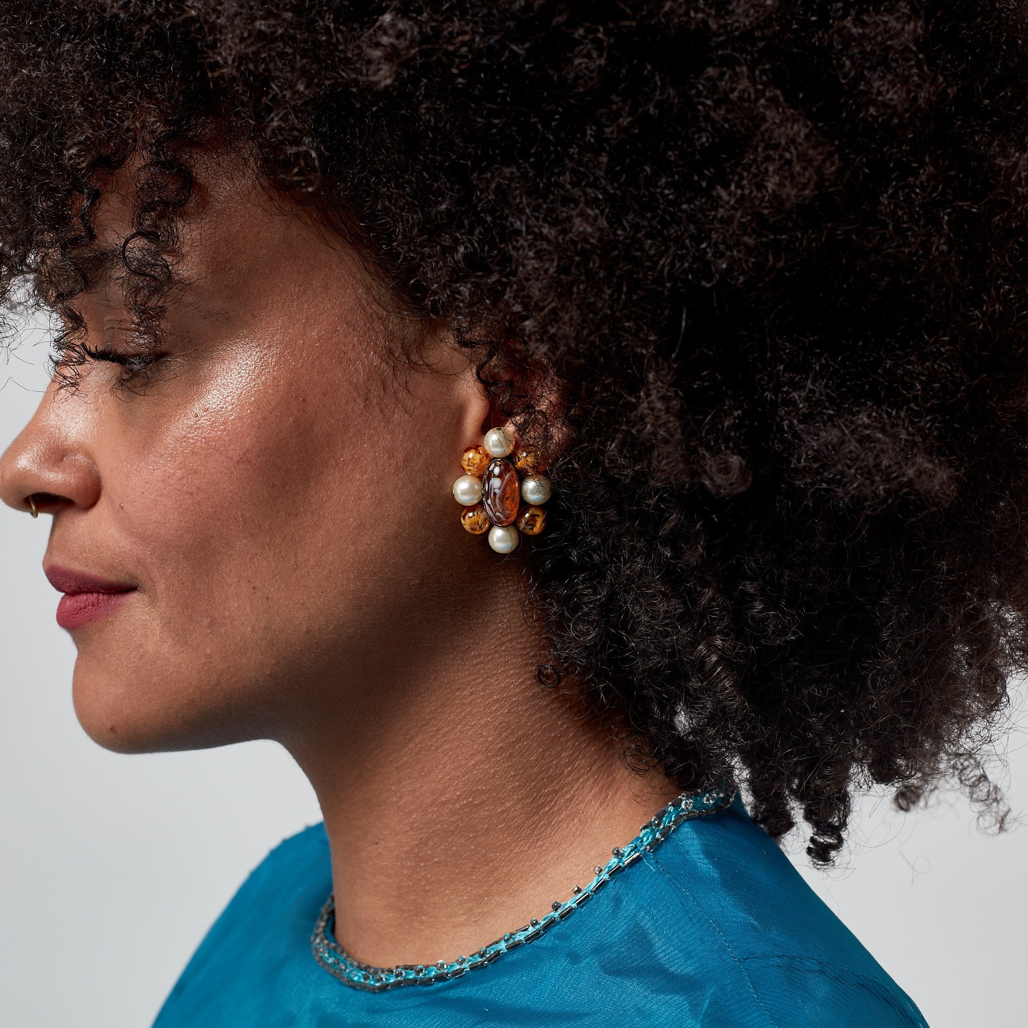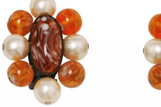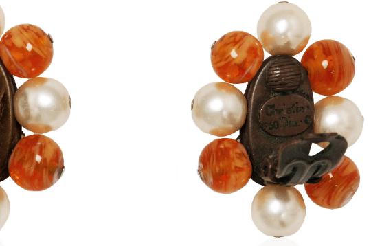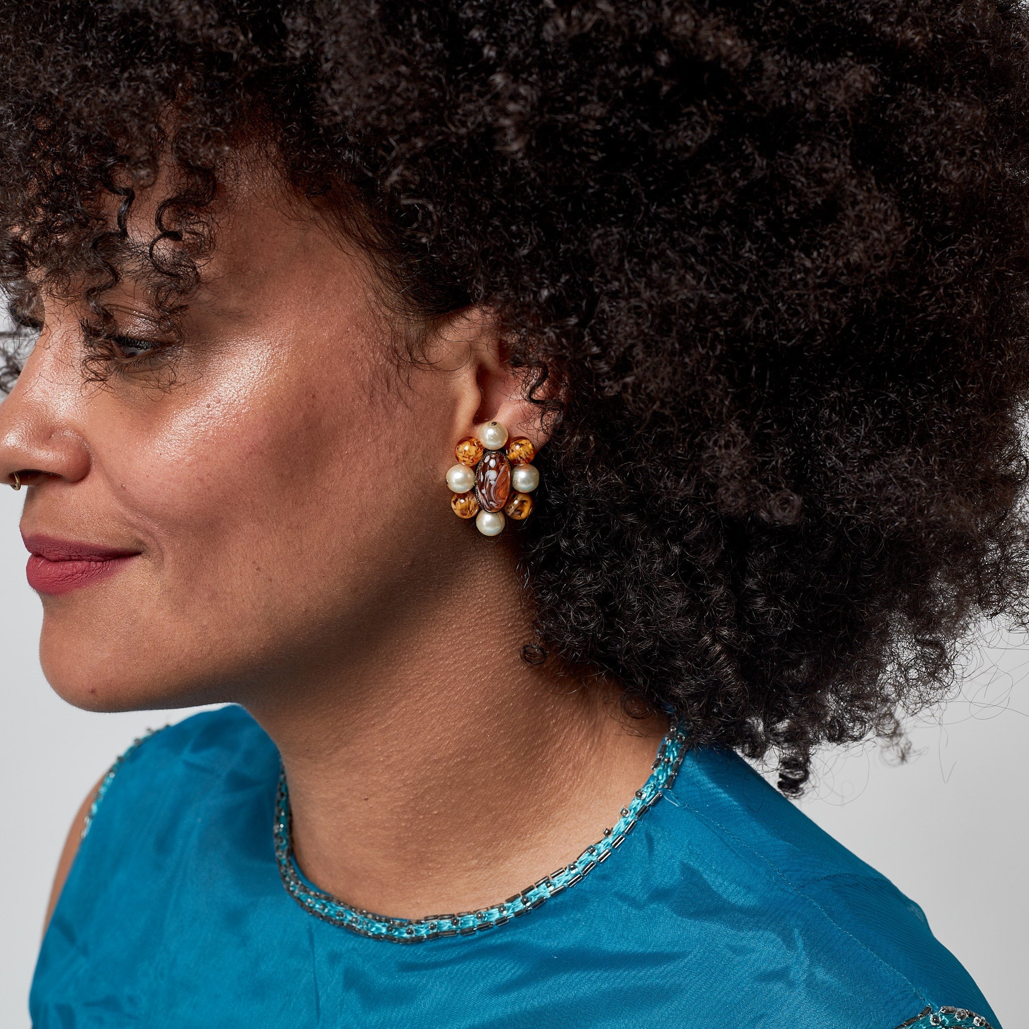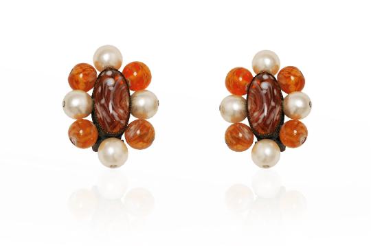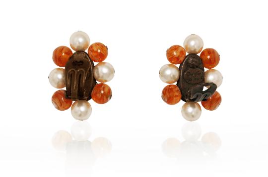 This is an original 1960s Dior pair of earrings from my archive. I've always loved the amber coloured glass which reminds me of early 19th century lamp glass. The central oval cabochon has flakes and swirls of cream which is also echoed in the smaller spherical beads that surround the central cabochon. The four glass pearls complete the look and unusually the backs of these Dior earrings are set in what looks to be copper. Each bead is held in by a gold jewellery tack and all of the beads rotate individually. They are both signed Christian Dior, copyright symbol and dated 1960. In excellent vintage condition with no nicks or scratches to the glass. This colour combination looks really good with gold and black clothing; definitely one for the collector or connoisseur of fine vintage jewellery.
