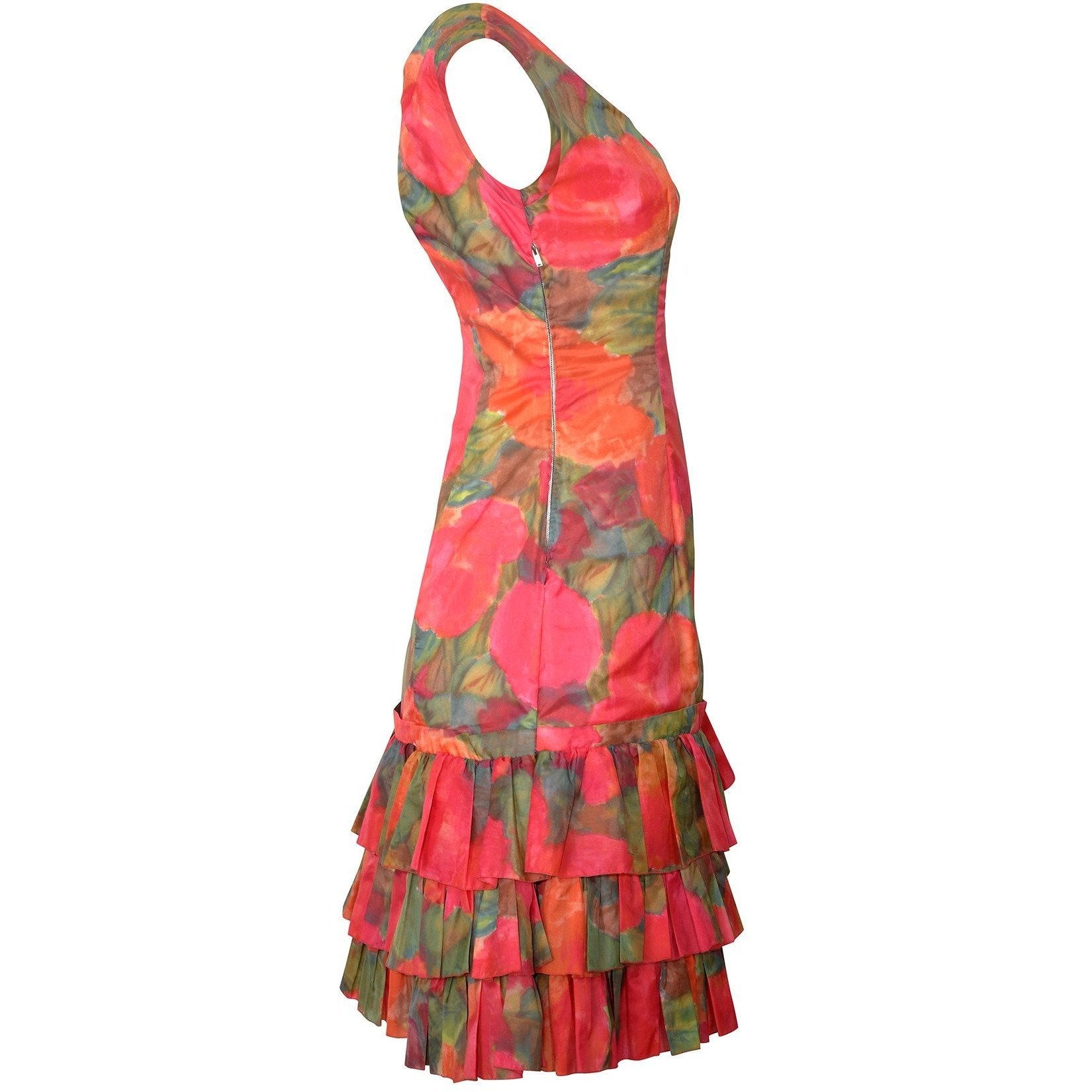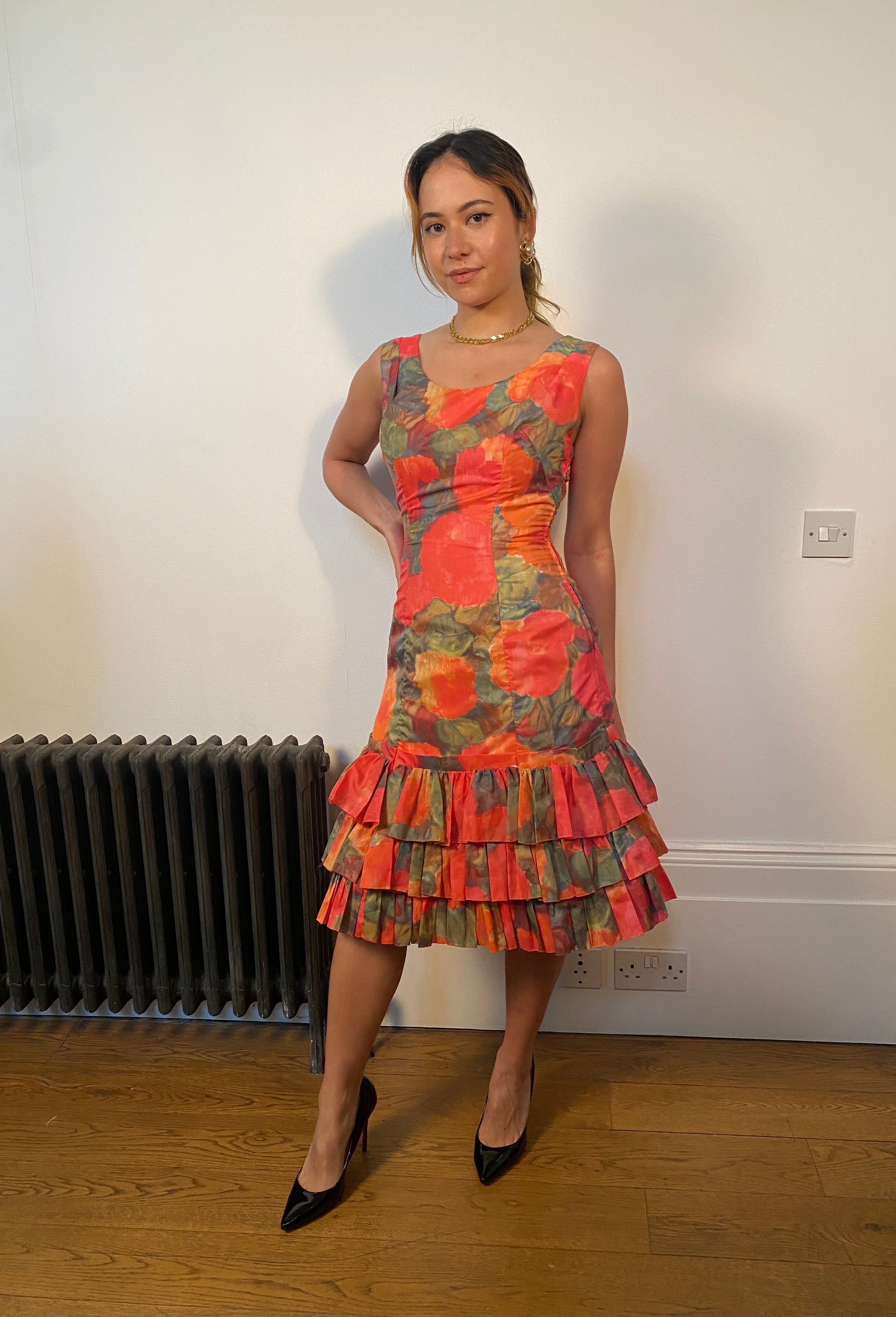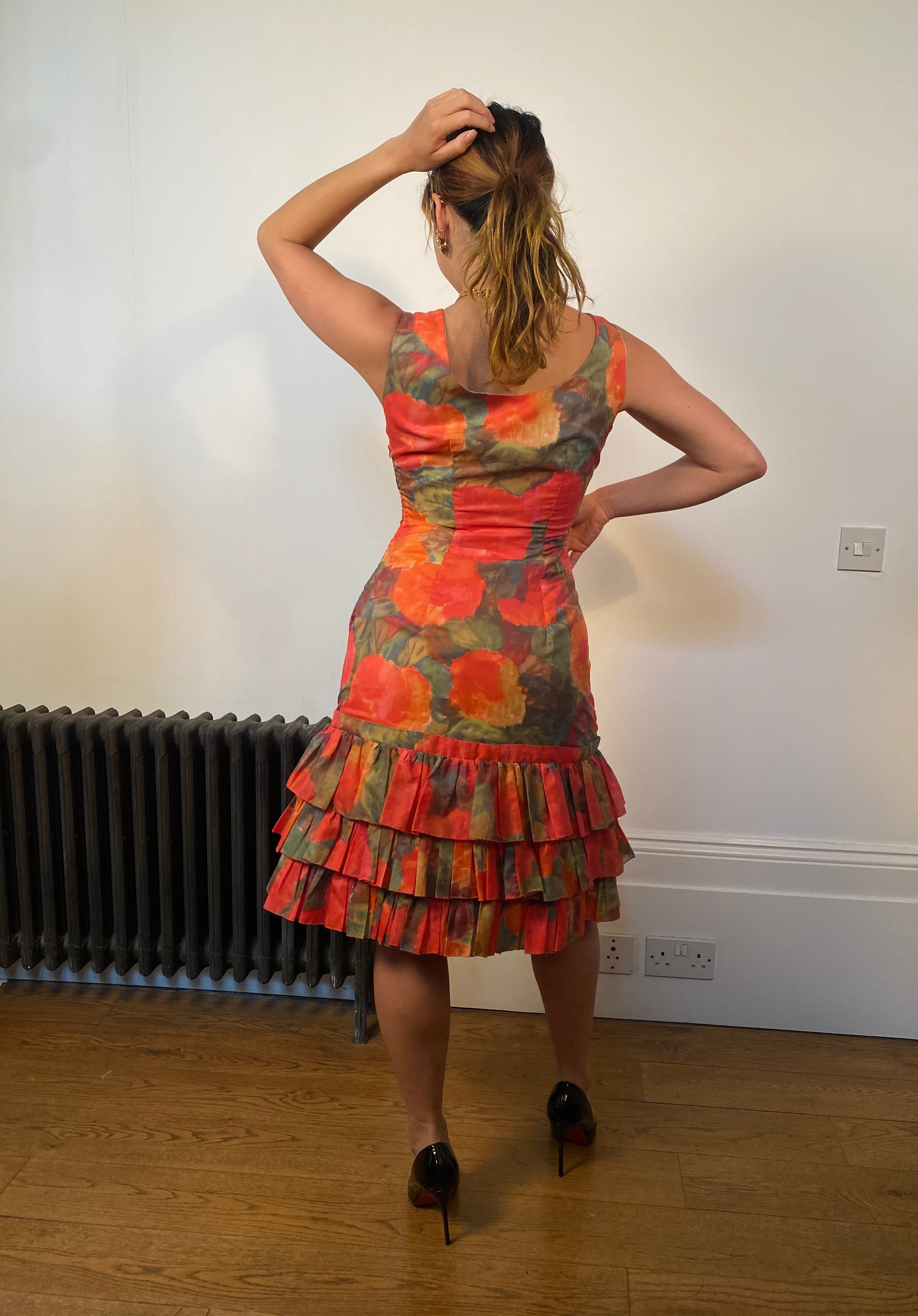 1960s Ruffle Tiered Orange and Pink Watercolour Floral Print Dress