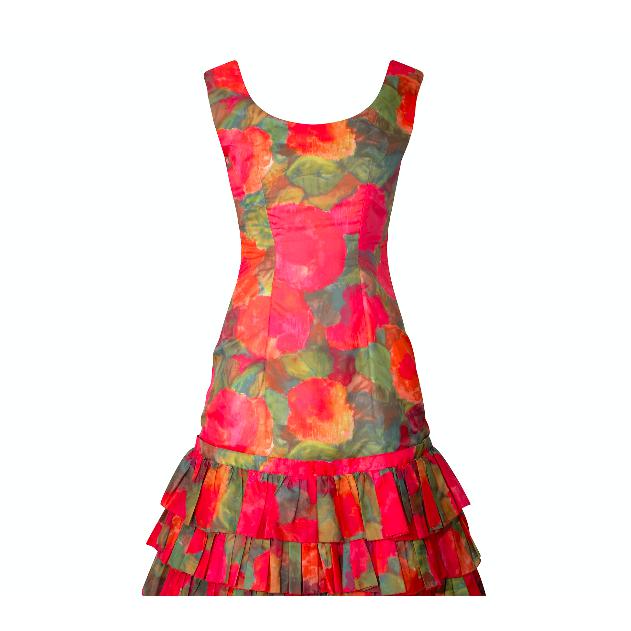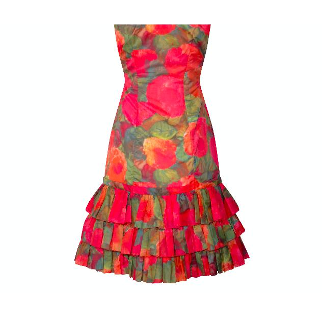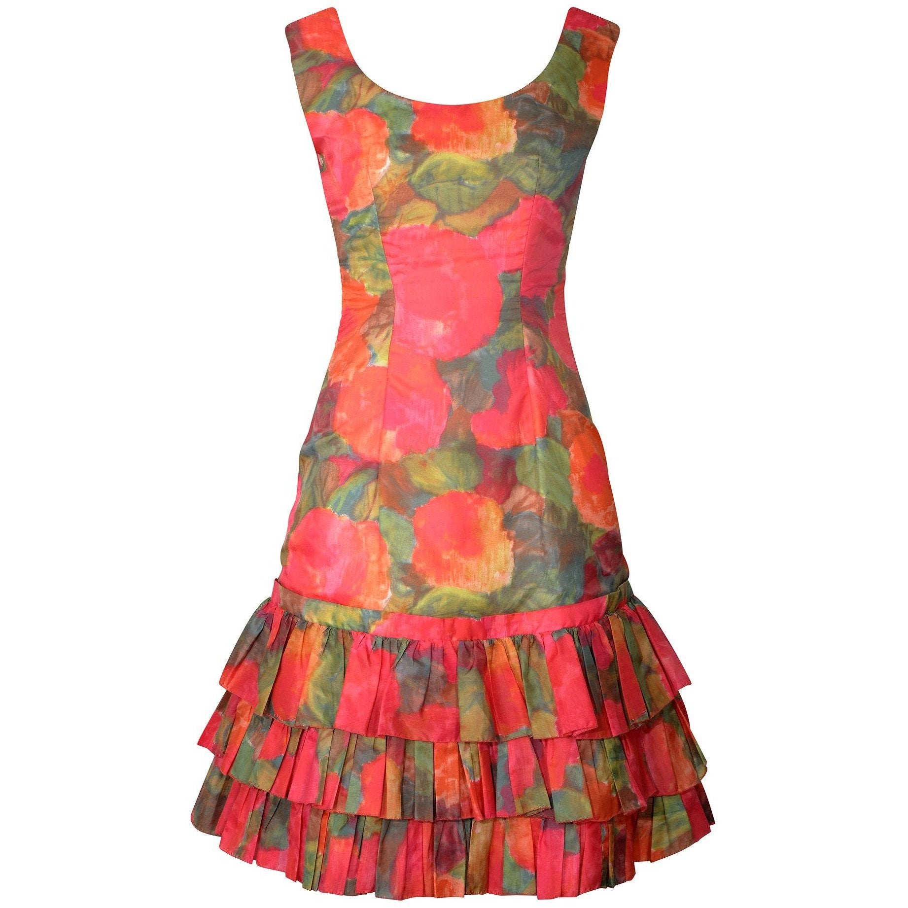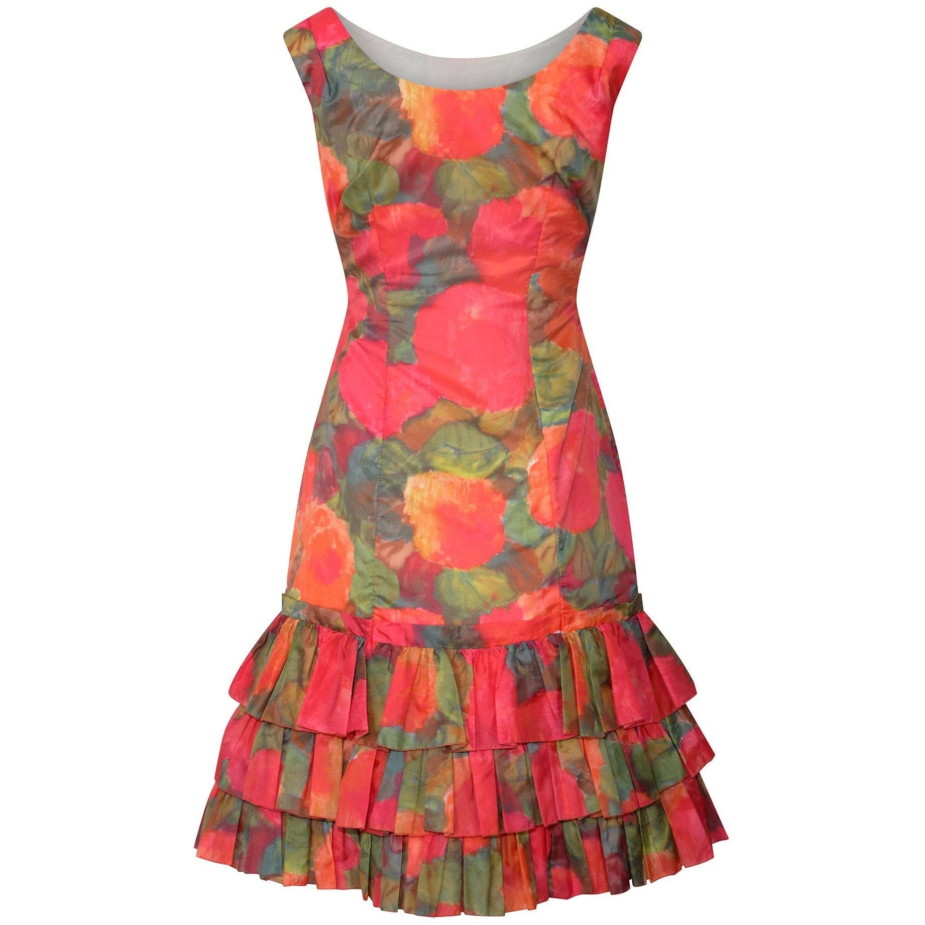 1960s Ruffle Tiered Orange and Pink Watercolour Floral Print Dress