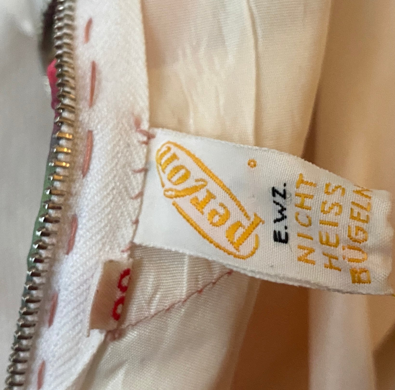 We love the vibrancy of the colours in this original 1960s vintage dress. It appears to be an abstract rose print in warm tones of pinks, oranges and green. The stand out design element of this piece has to be the wonderful triple tiered ruffle hemline with each row perfectly gathered and attached in tiers to the bottom hem. The dress has been edged in a zig zag seam and does up at the side with the original metal zip. It is fully lined in a quality cream acetate. To ensure a great flare, the dress has a stiffened cotton mesh underskirt that has been trimmed with a 3 centimetre lace trim. This is in itself a beautifully made item which you would catch a glimpse of perhaps on movement or dancing. The dress is German made and superbly made with many hand finished details and excellent execution of design. The small manufacturing label is very neatly attached at the zip and the brand is named Perlon. It is labelled a European size 36 but the measurements equate in modern sizing to around a UK 6-8, our house model in the photo is this size. It is in absolutely lovely fresh vintage condition with no issues or faults.