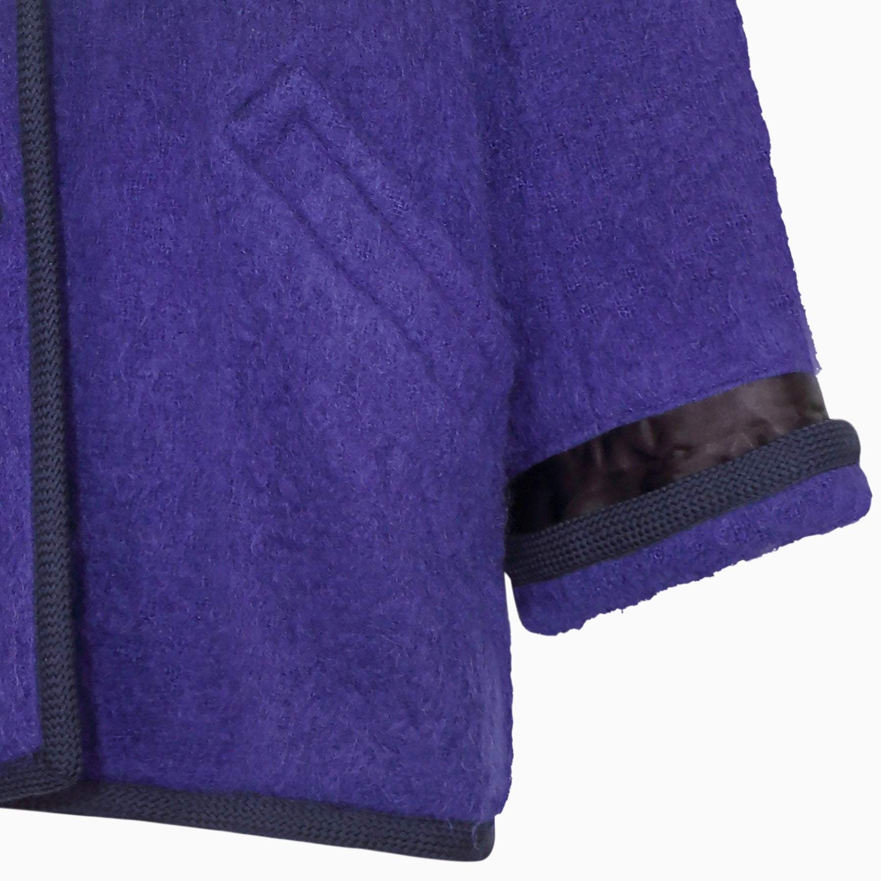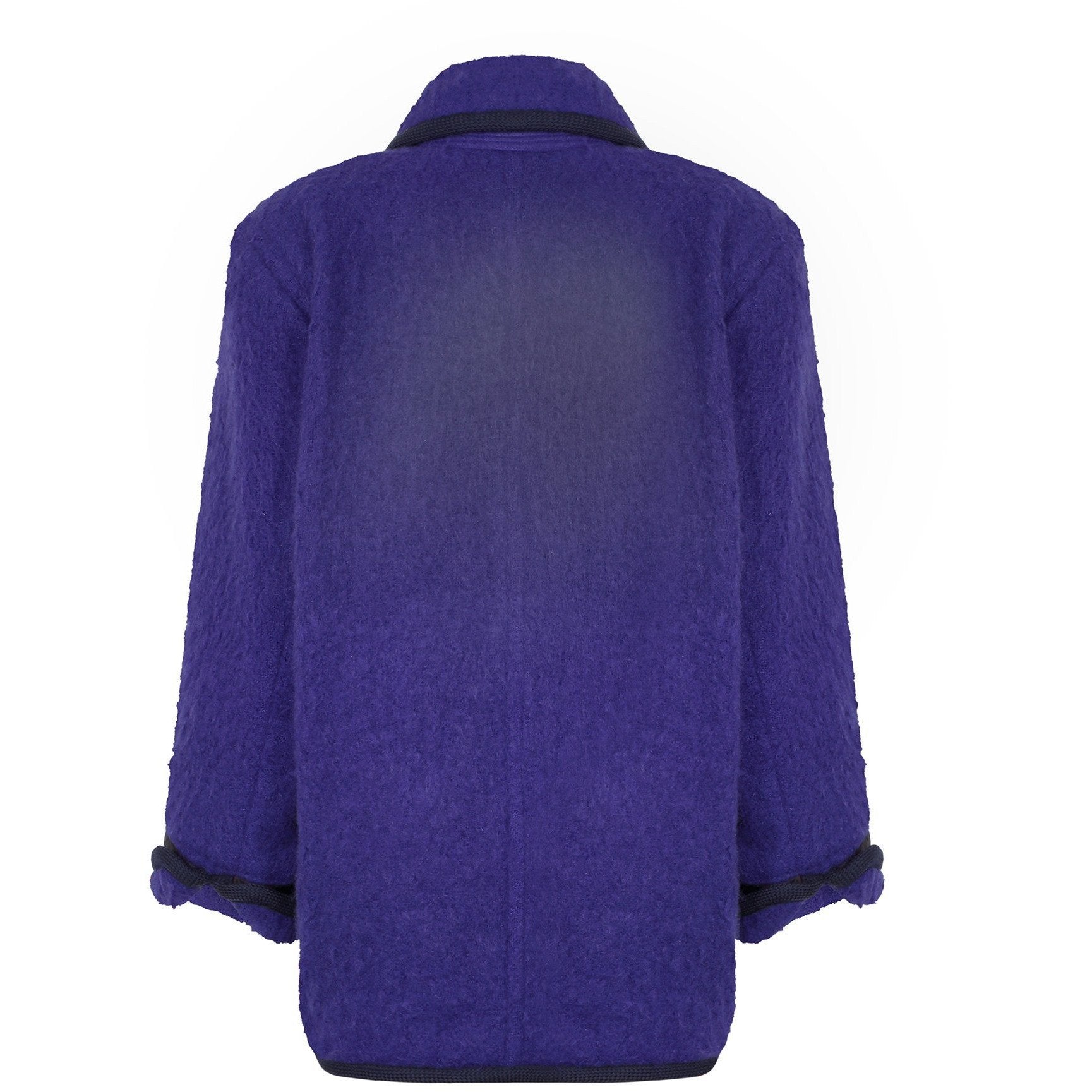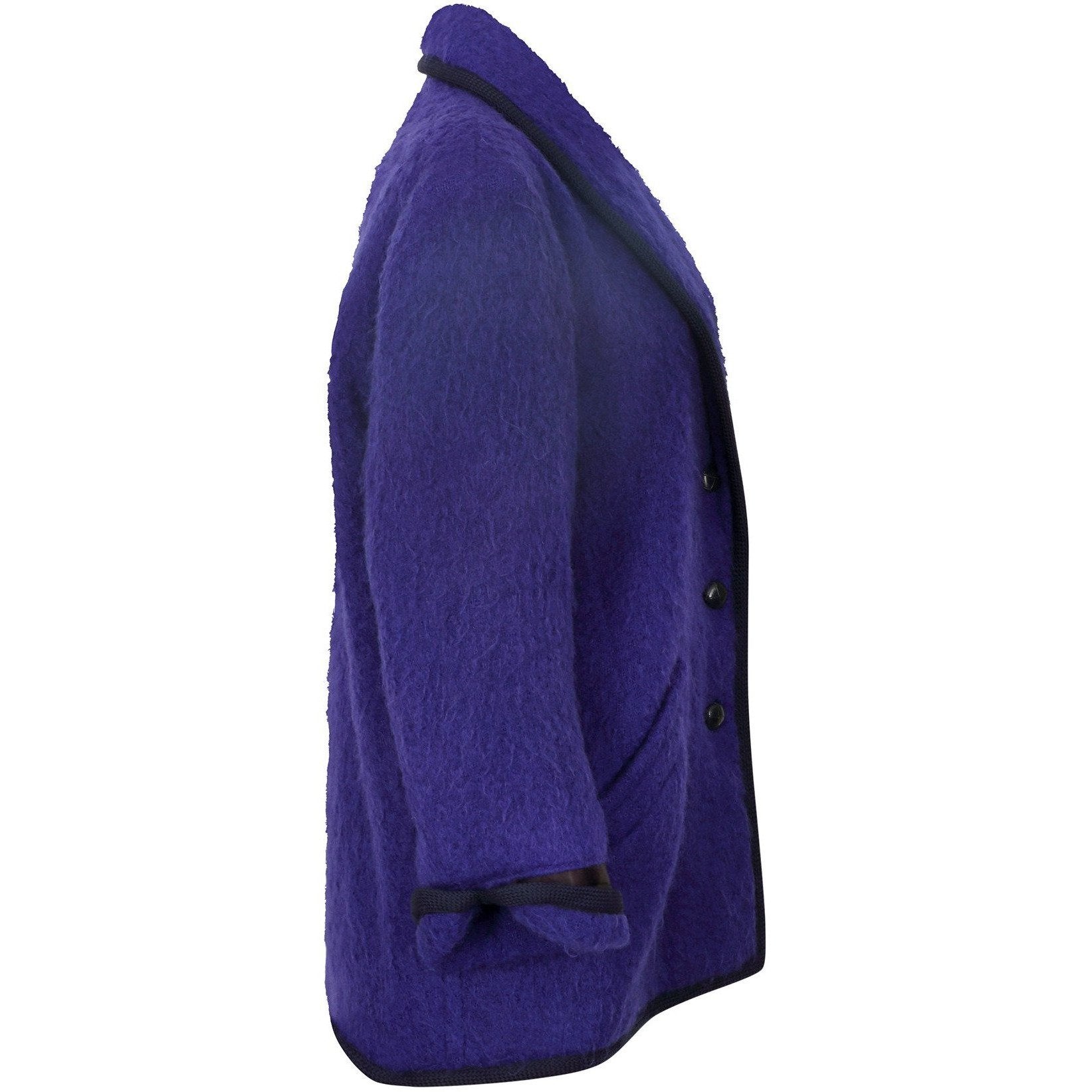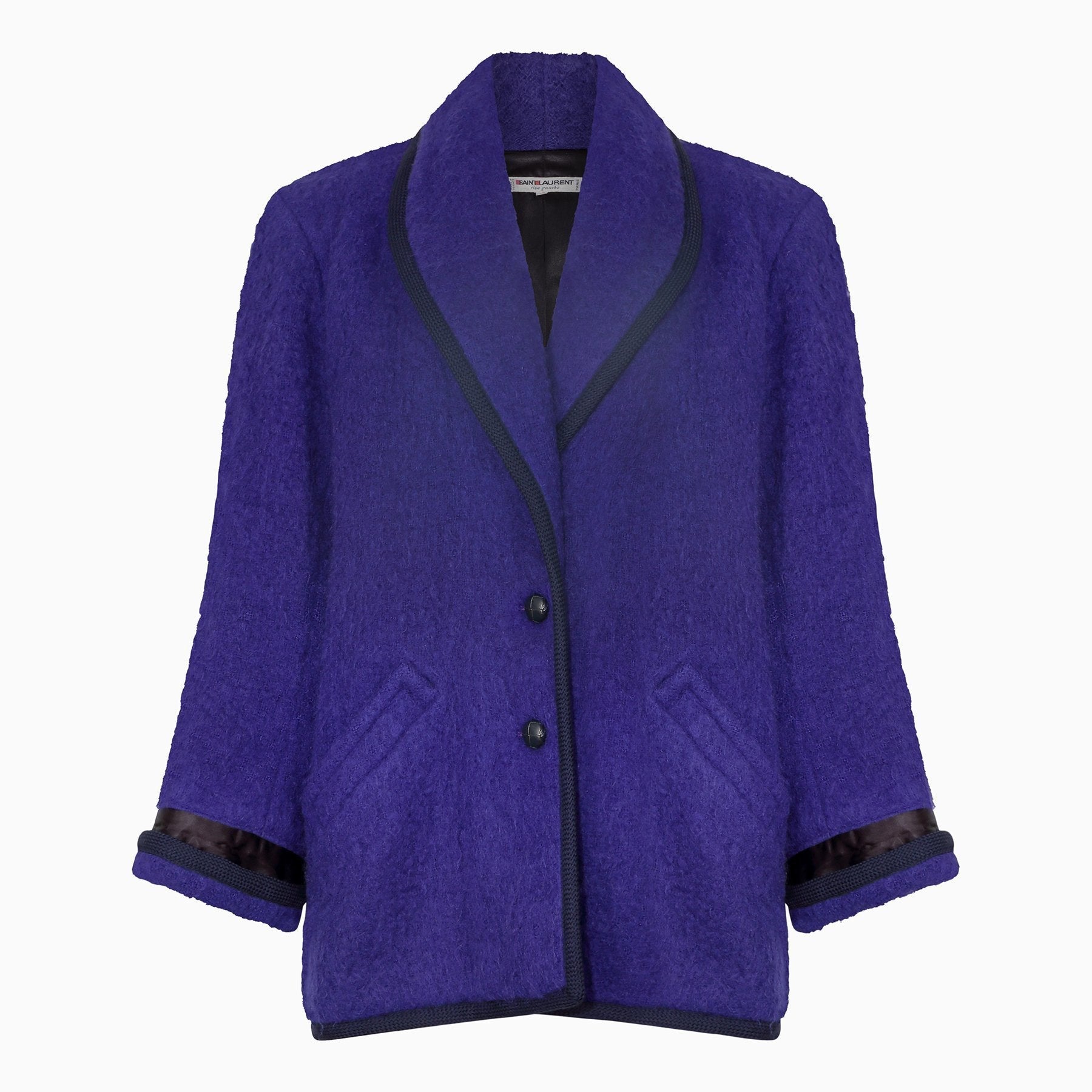 This late 1980s to early 1990s Yves Saint Laurent jacket is a great example of the relaxed 'boyfriend' cut that presided over fashion during this adjoining era. The fabric’s striking colour is a deep purple/blue lilac and although the composition label is no longer in the jacket, we believe this to be a mohair wool/nylon blend. The jacket has a rounded lapel collar that leads down to a central button stand with three leather platted buttons. There are two deep front facing pockets and the signature black trim is the archetypal woven cord used often by Yves Saint Laurent for jackets and skirts since the 1970s. The trim is present around the collar, the full length of the jacket opening and the folded over cuffs of the tapered sleeves. The jacket has a very square cut and is beautifully panelled to give it that boxy oversized look. It is lined in beautiful quality black sateen fabric. In really excellent vintage condition with no issues of any note and will fit all sizes up to a UK 14, US 10.