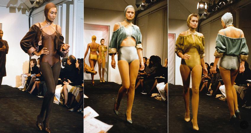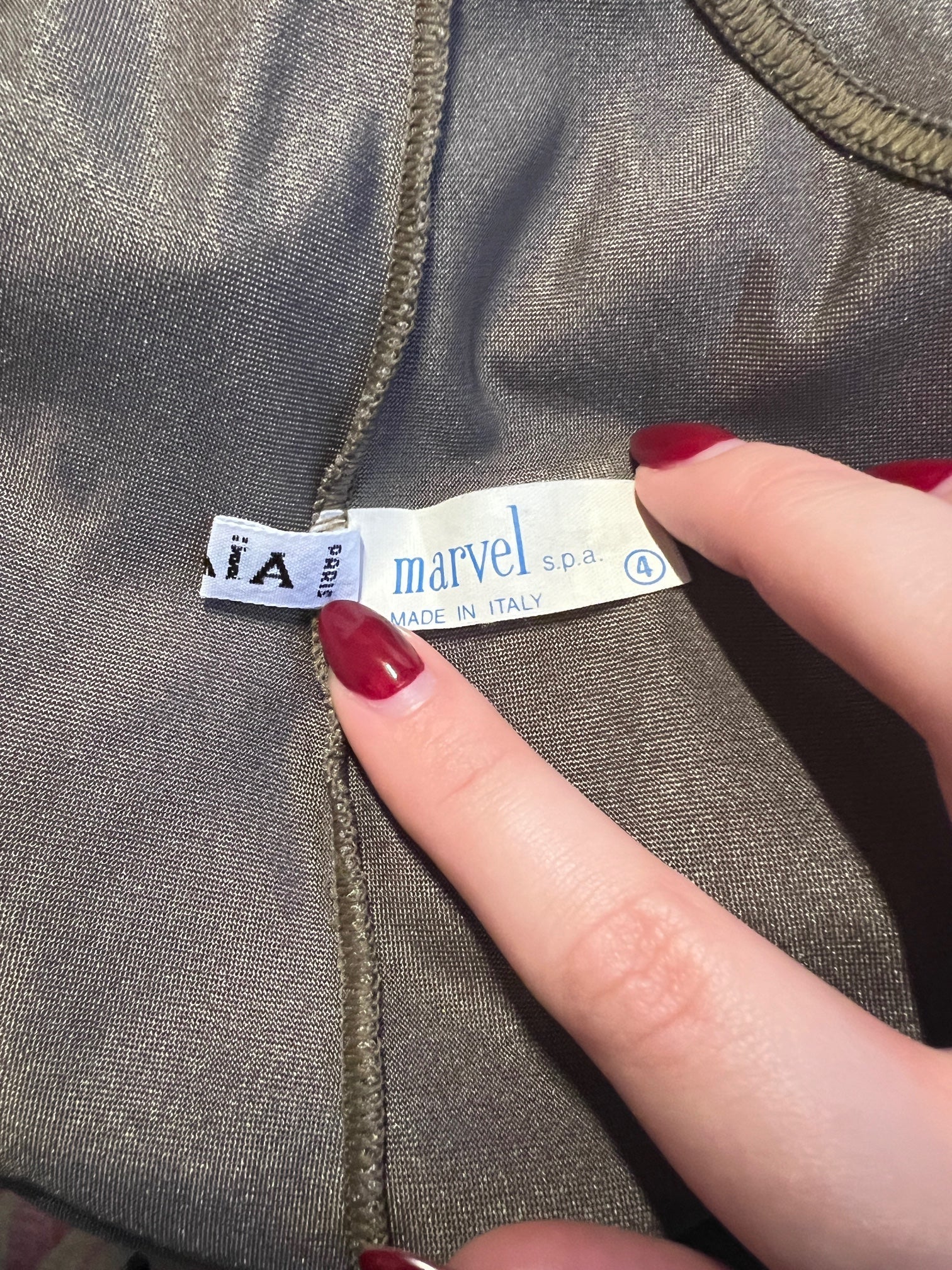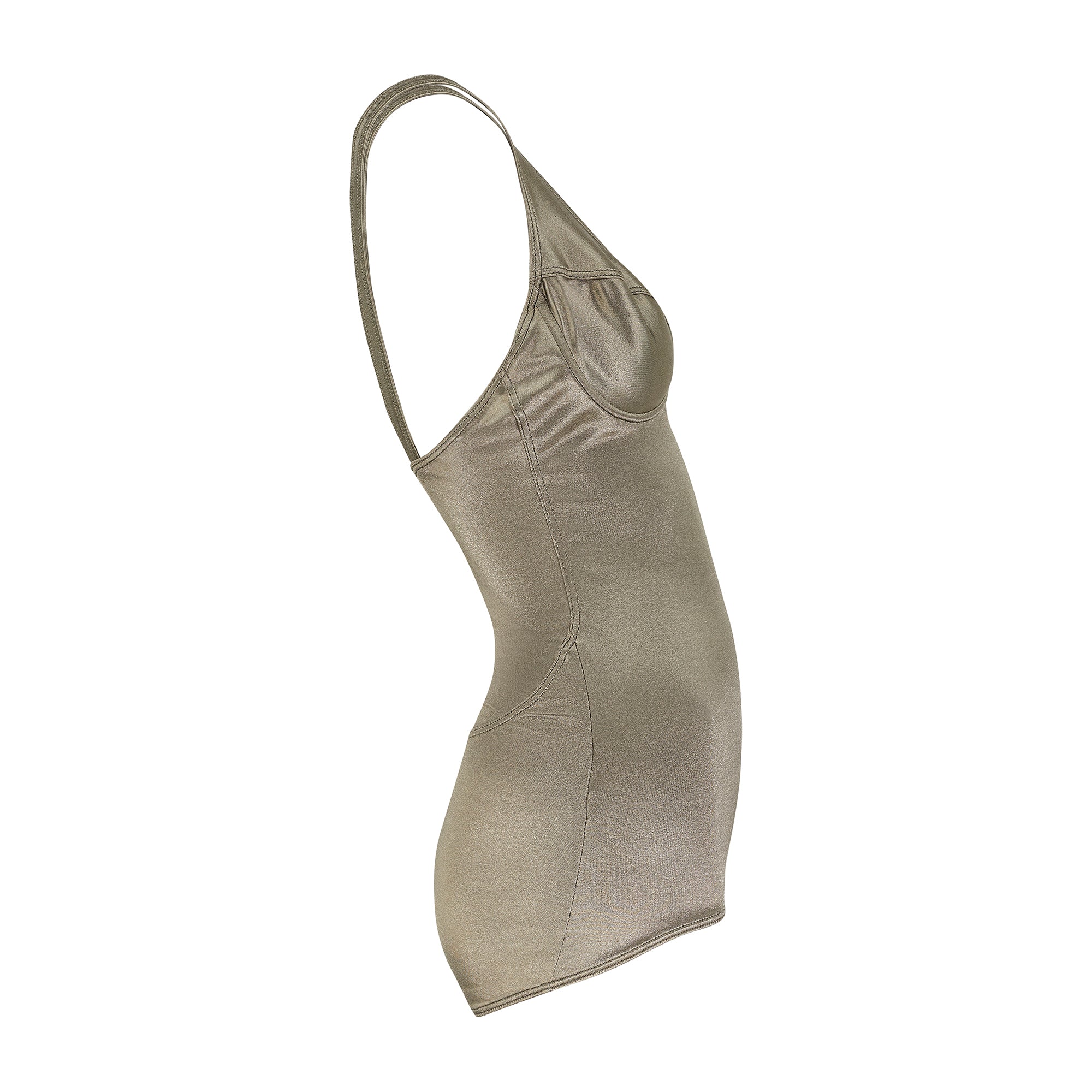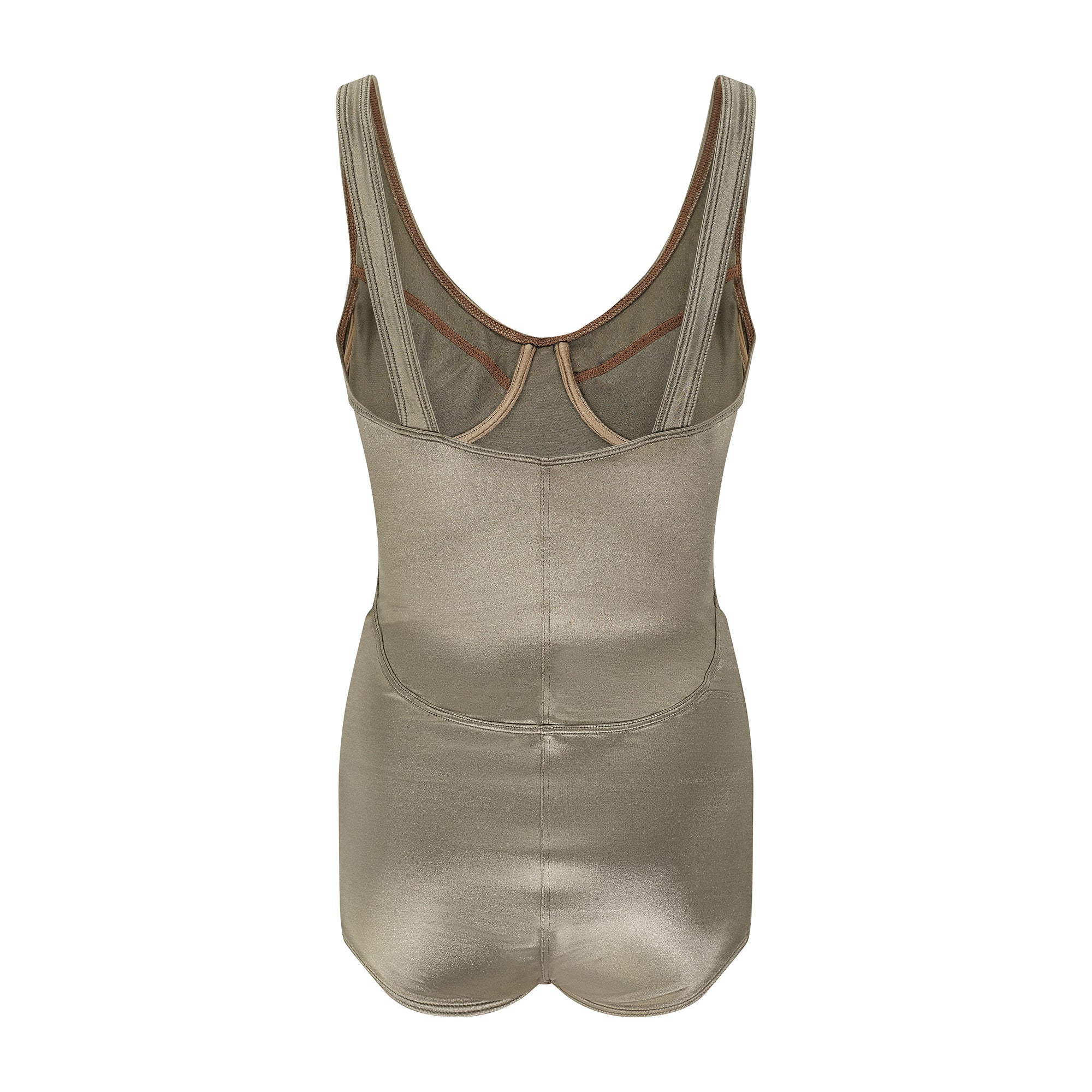 This important spring / summer 1987 runway documented Alaïa swimsuit is tailored from a stretch-cloth with a satin-like sheen. The green-gold pewter shade became a signature of the house. It is cut to a bra-like shape at the front and is underwired. There are wide, supportive straps. The back is lower, cut with curved seams to pull in the waist. This is where Alaïa’s talents lay; cutting to flatter the female form. The stitching is tonal and the swimsuit is unlined, except at the gusset which we have replaced so it is brand new cotton.