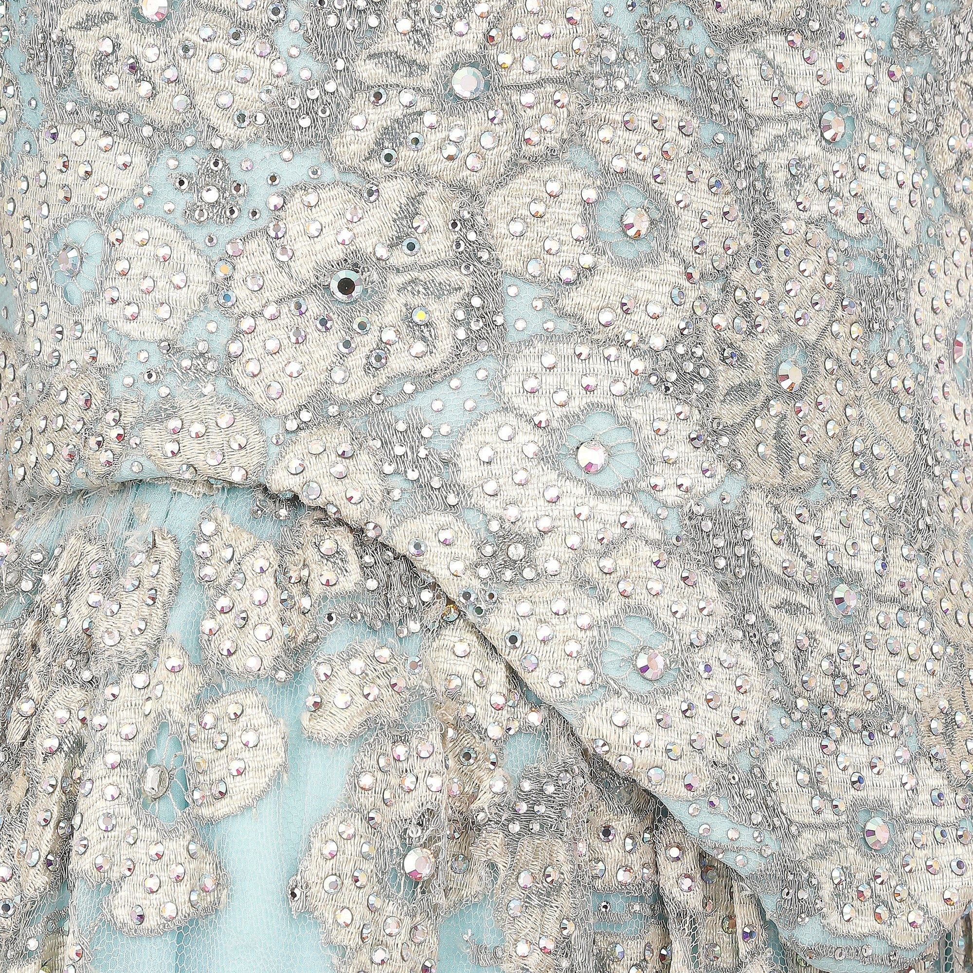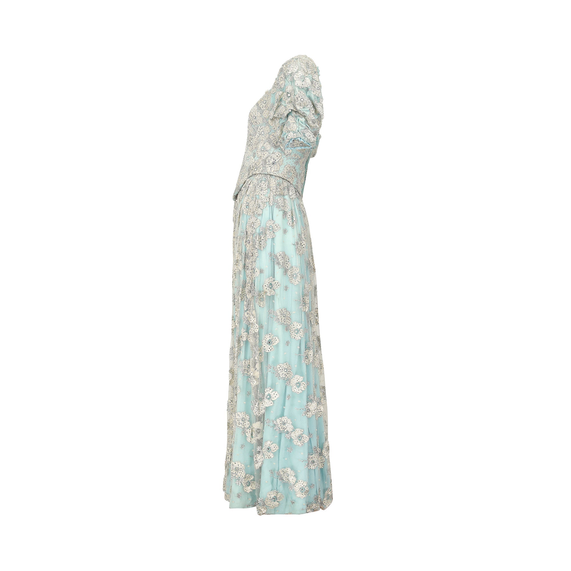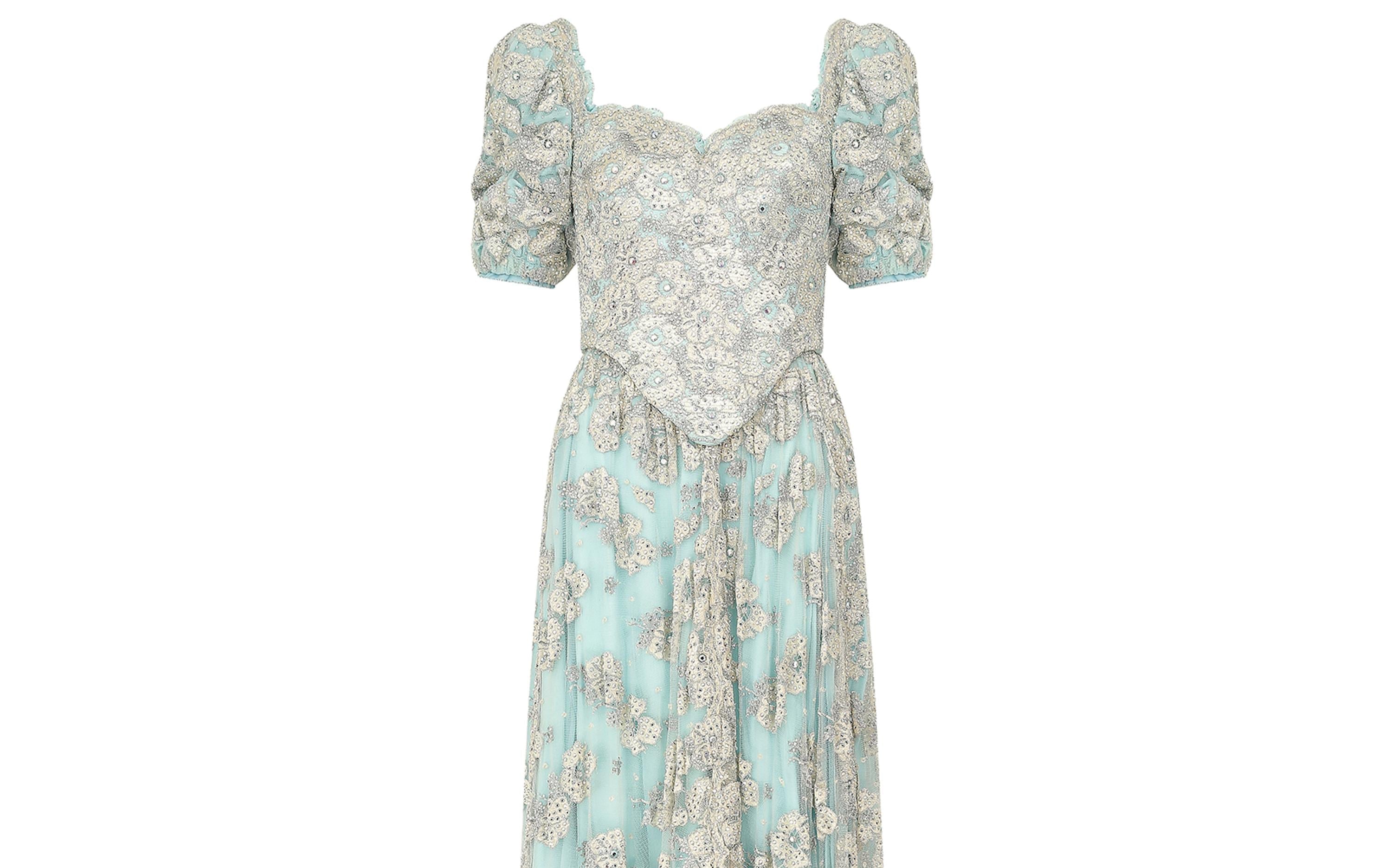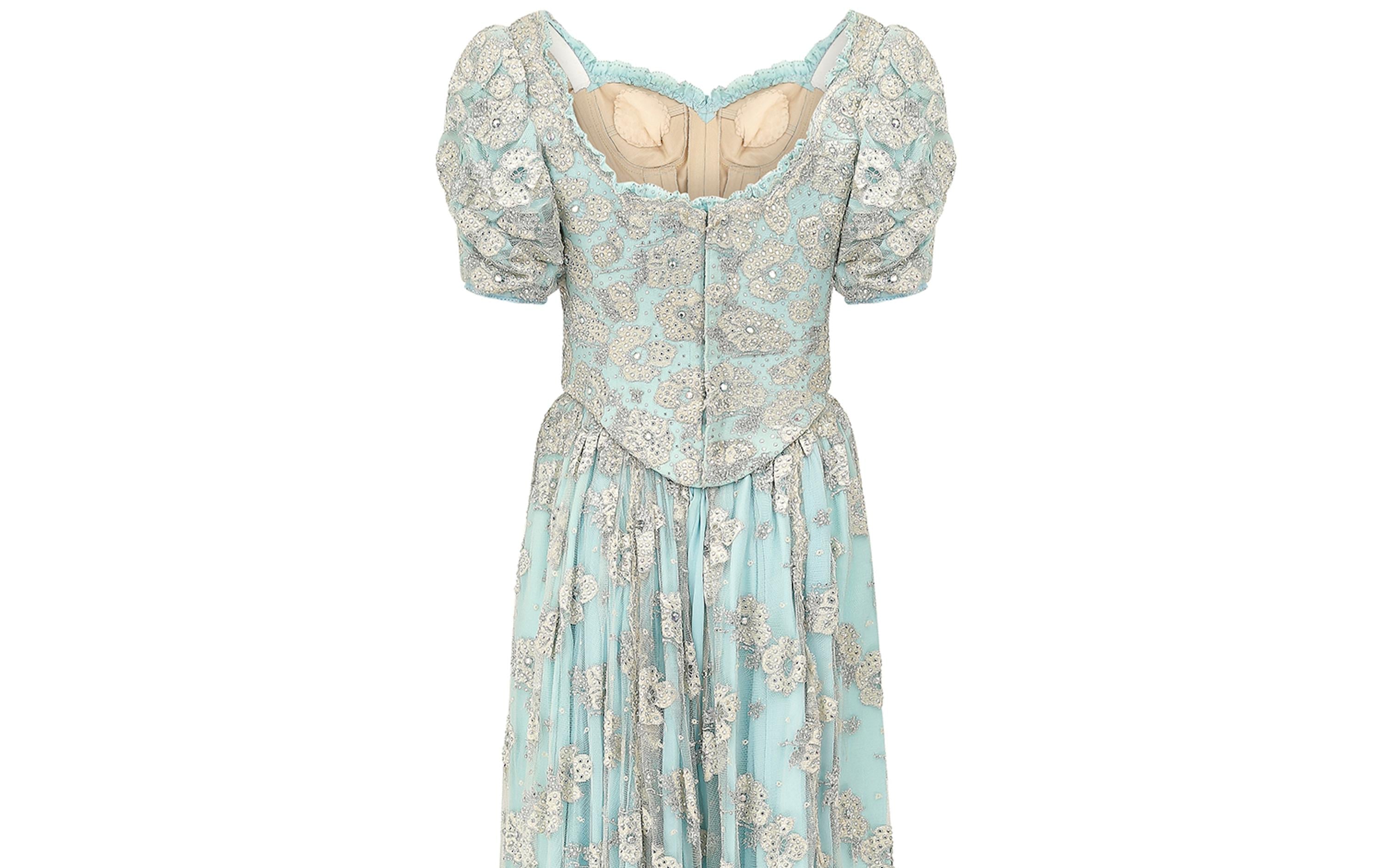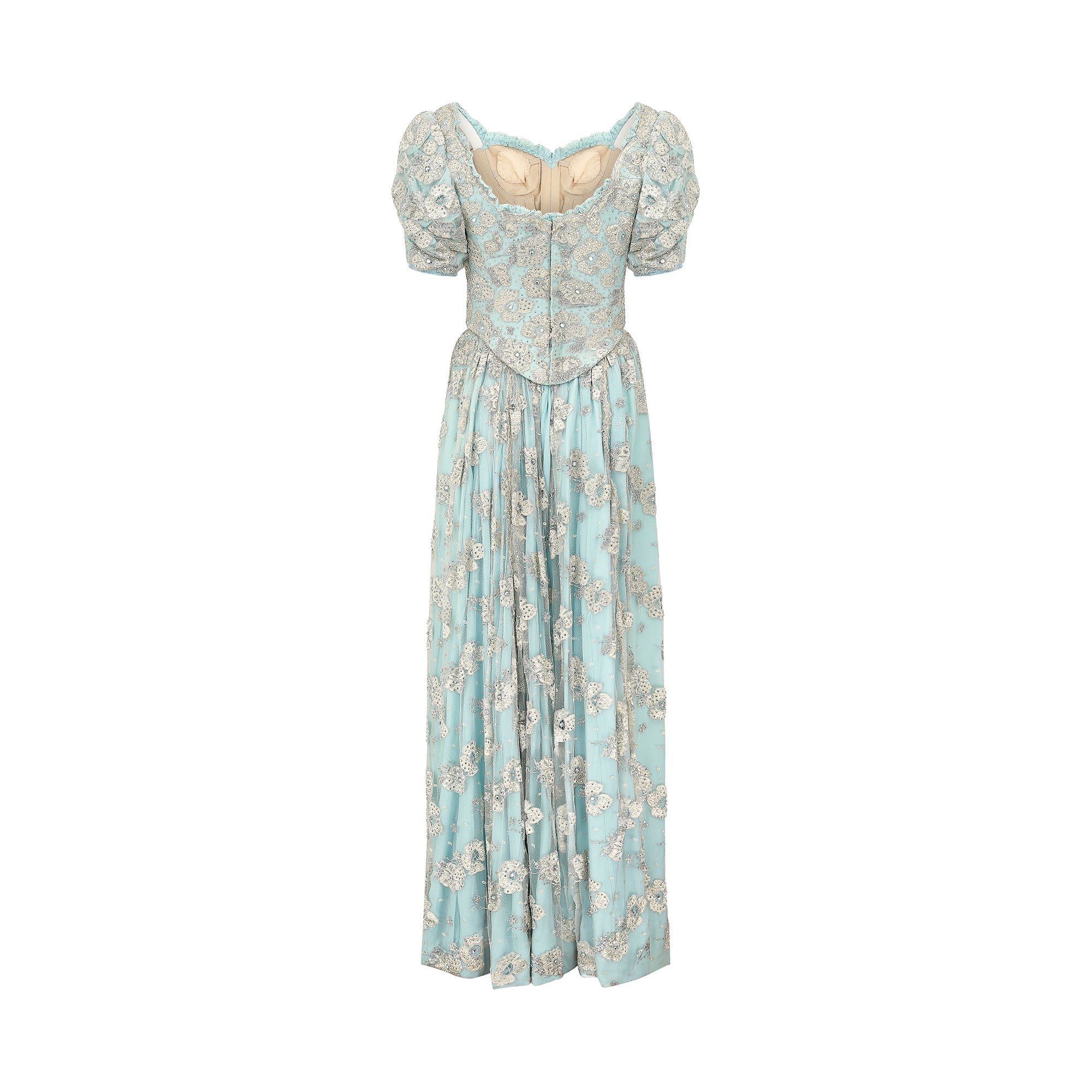 This magnificent 1990s bespoke made embellished lace and crystal dress is a fairytale dream. The top section features a heavily crystal studded lace and turquoise bodice which has an incredible internal structure, made up of heavy boning, shaped bust cups and a reinforced, neutral coloured lining. The puffed sleeves are lined with grip tape to ensure a seamless fit, and to prevent any slippage in the shoulder area. The dress is fastened to the centre back of the bodice, with eleven neatly concealed hook and eye closures. The skirt portion, which is internally attached to the bodice, is lined in a white, crisp polyblend fabric. The weight and impressive volume of the dress is created using a combination of this underlay, turquoise blue chiffon and an embellished mesh overlay which is embroidered using silver and iridescent champagne threads and sparkling diamantes. The neckline and sleeve cuffs are finished with turquoise ruffle trims, with rows of small diamante embellishments.