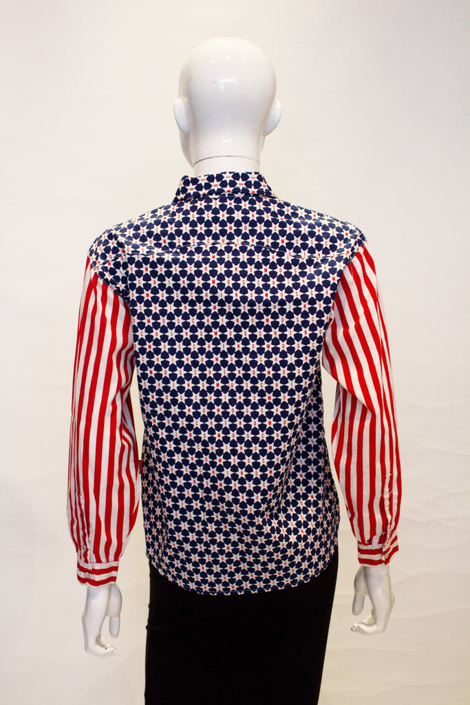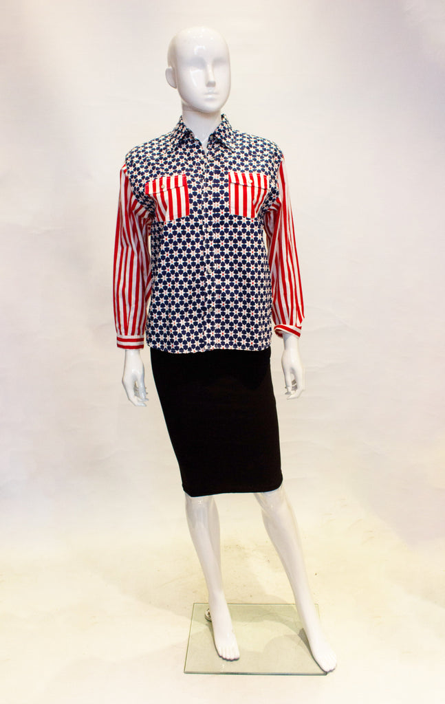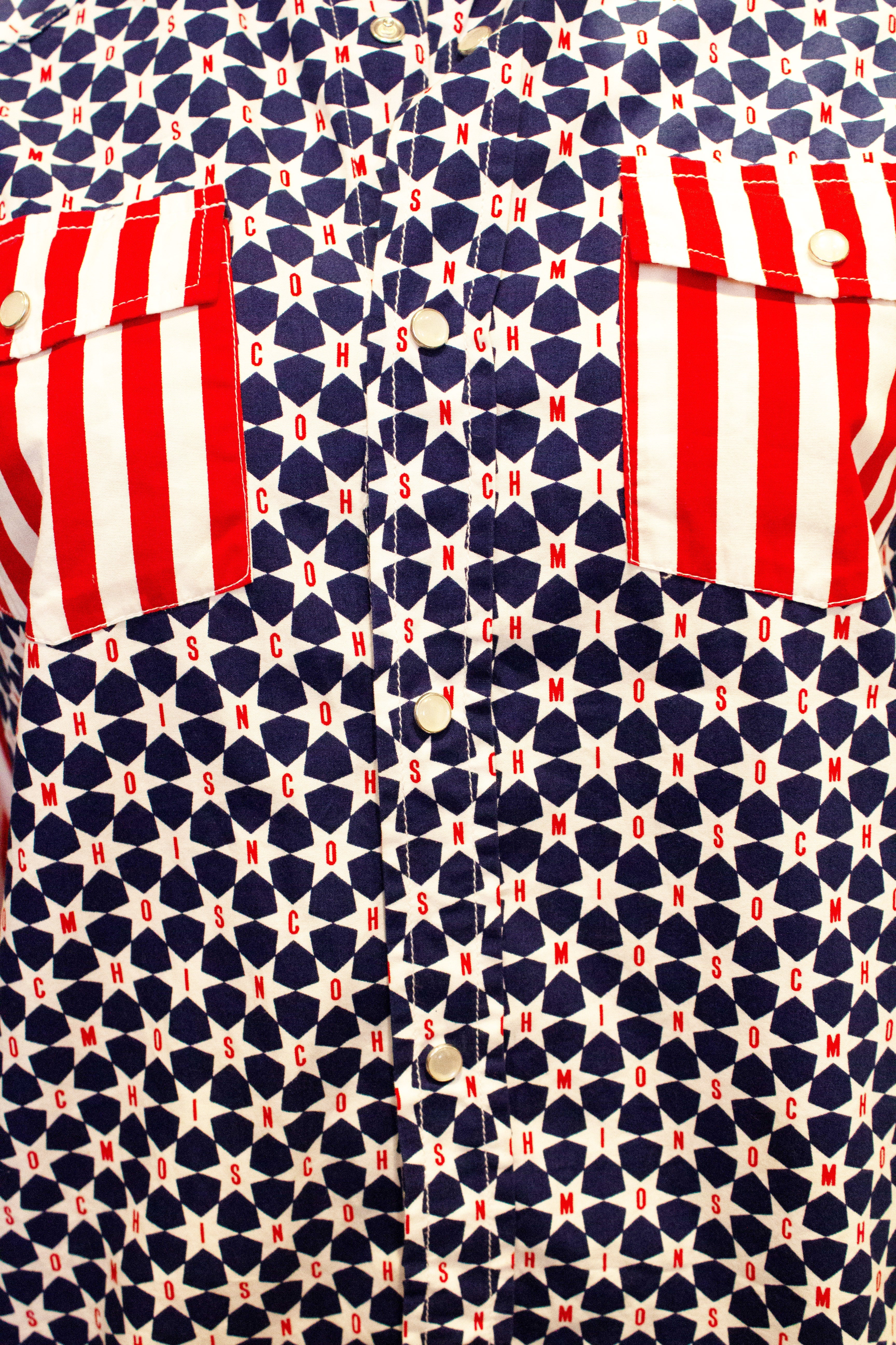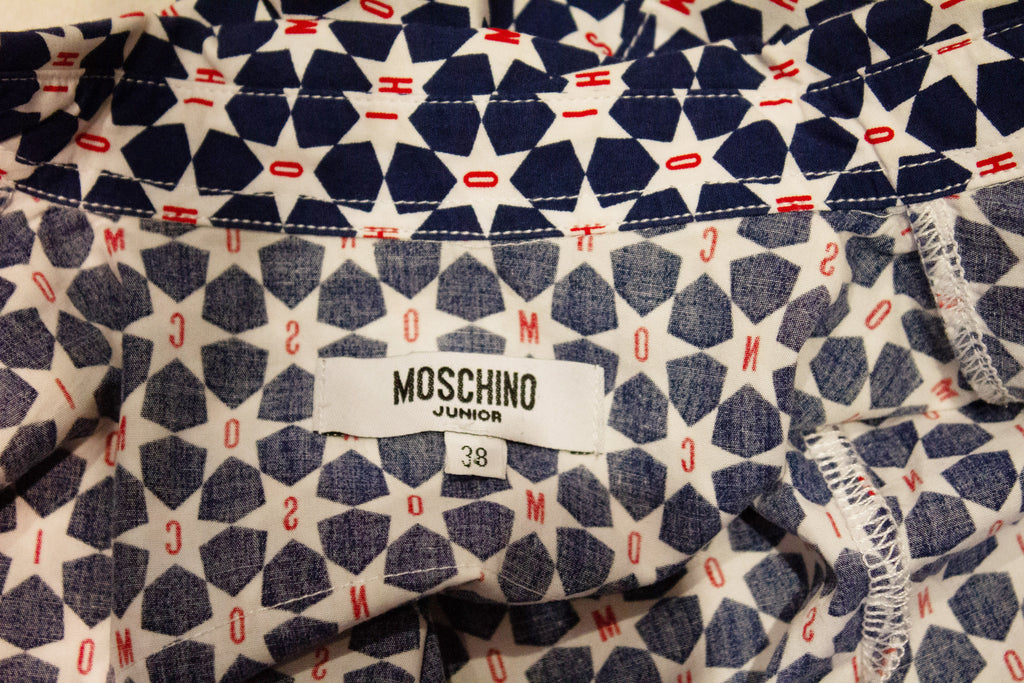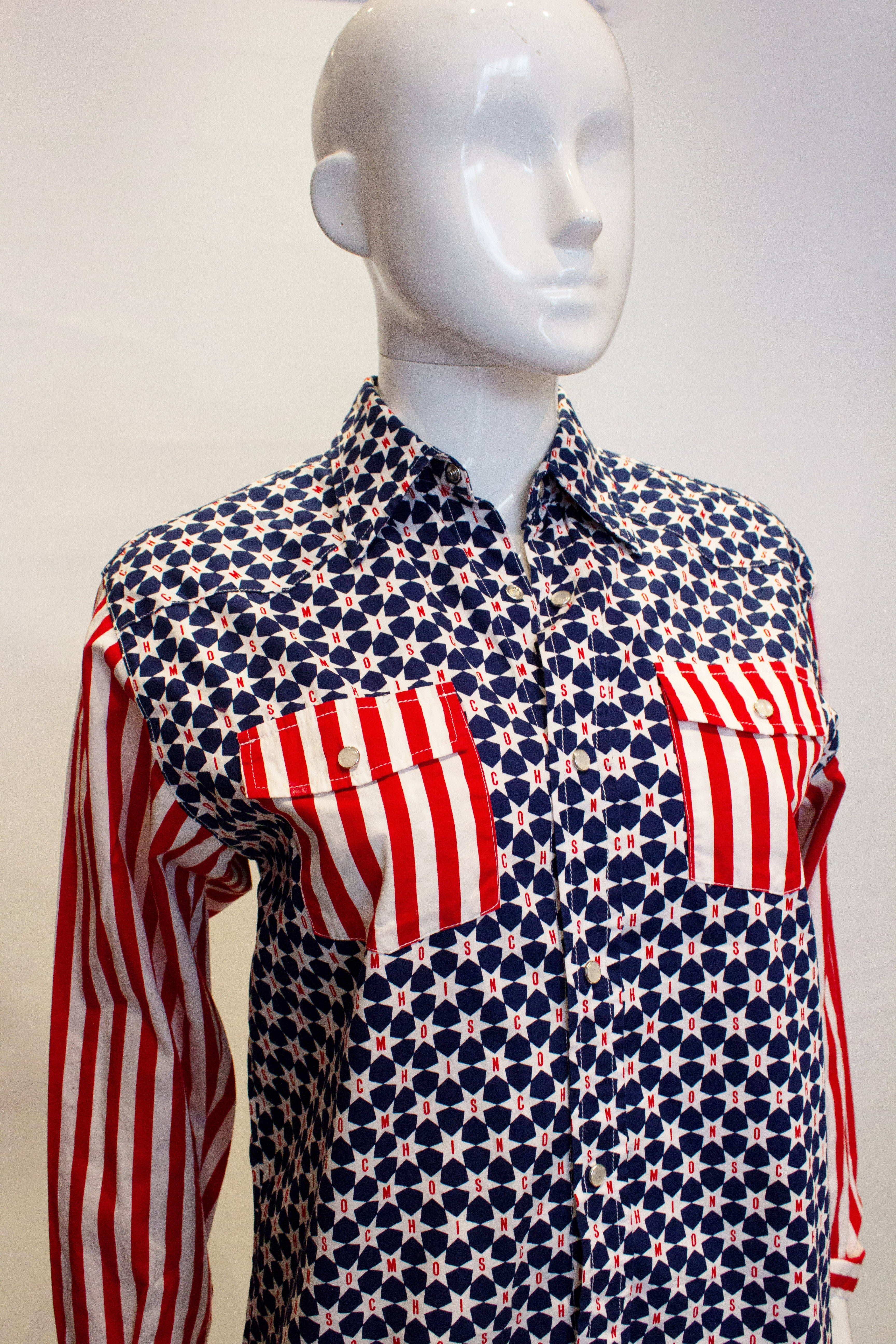 A fun shirt by Moschino. It is the junior line but will fit a UK 8/10. The cotton shirt is a great mix of print, and has a front popper opening and two pockets.Bust up to 36'', length 24''.