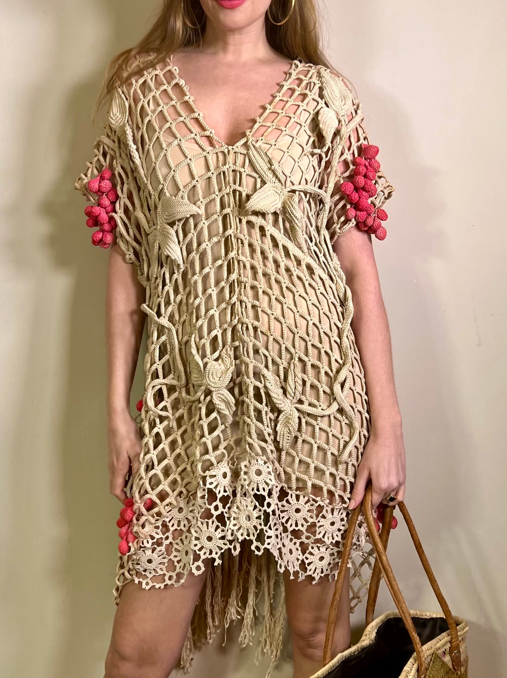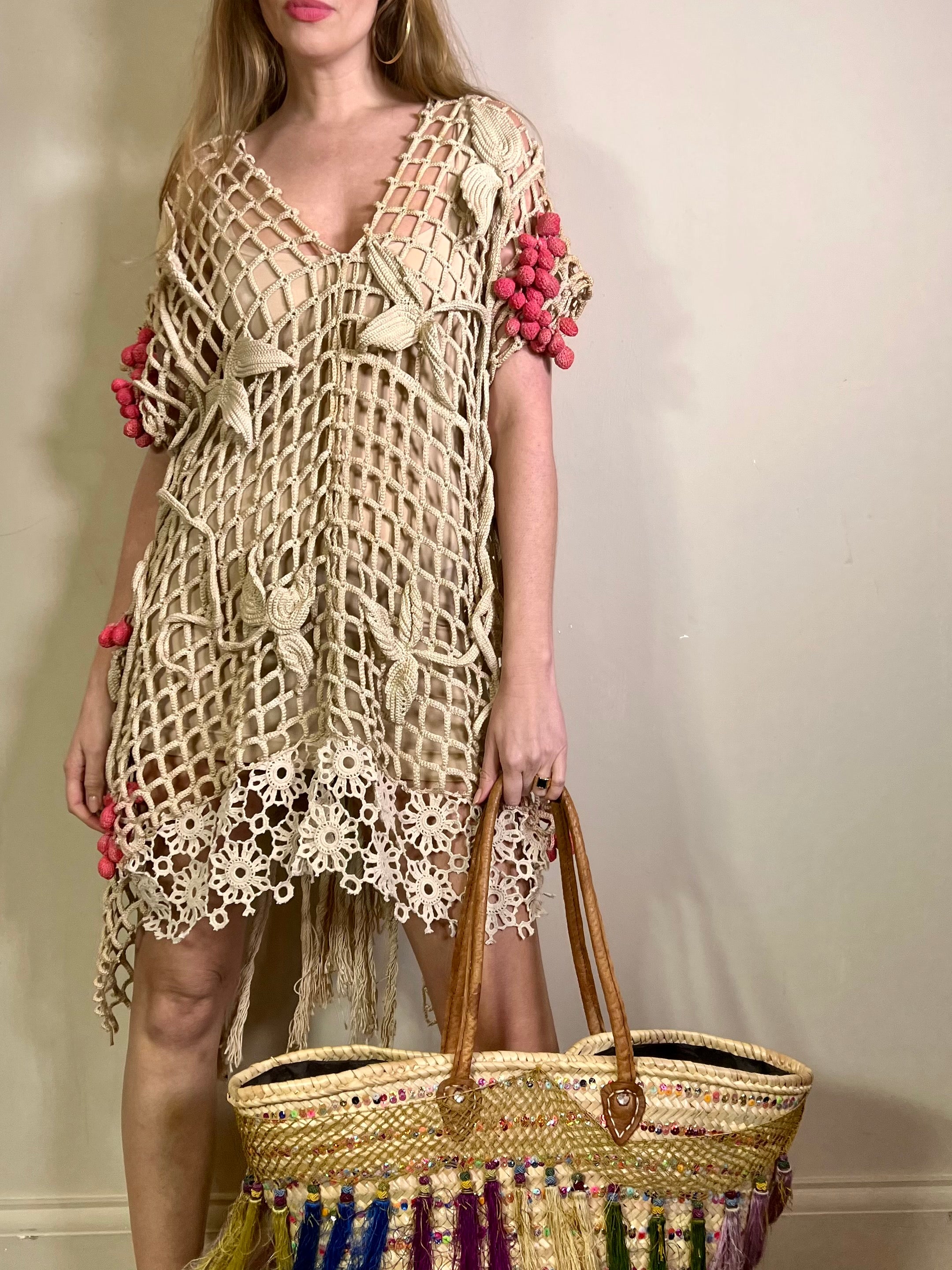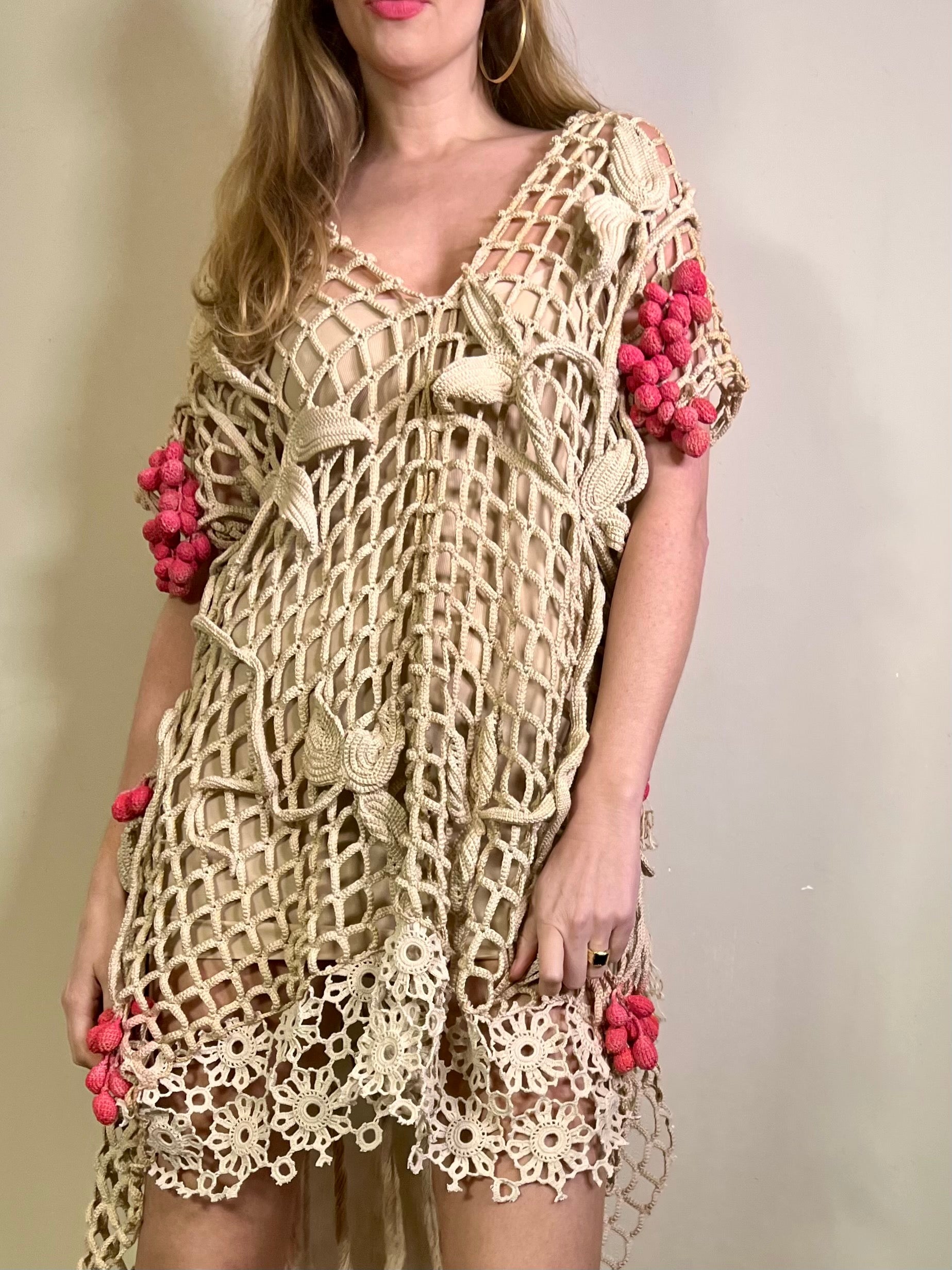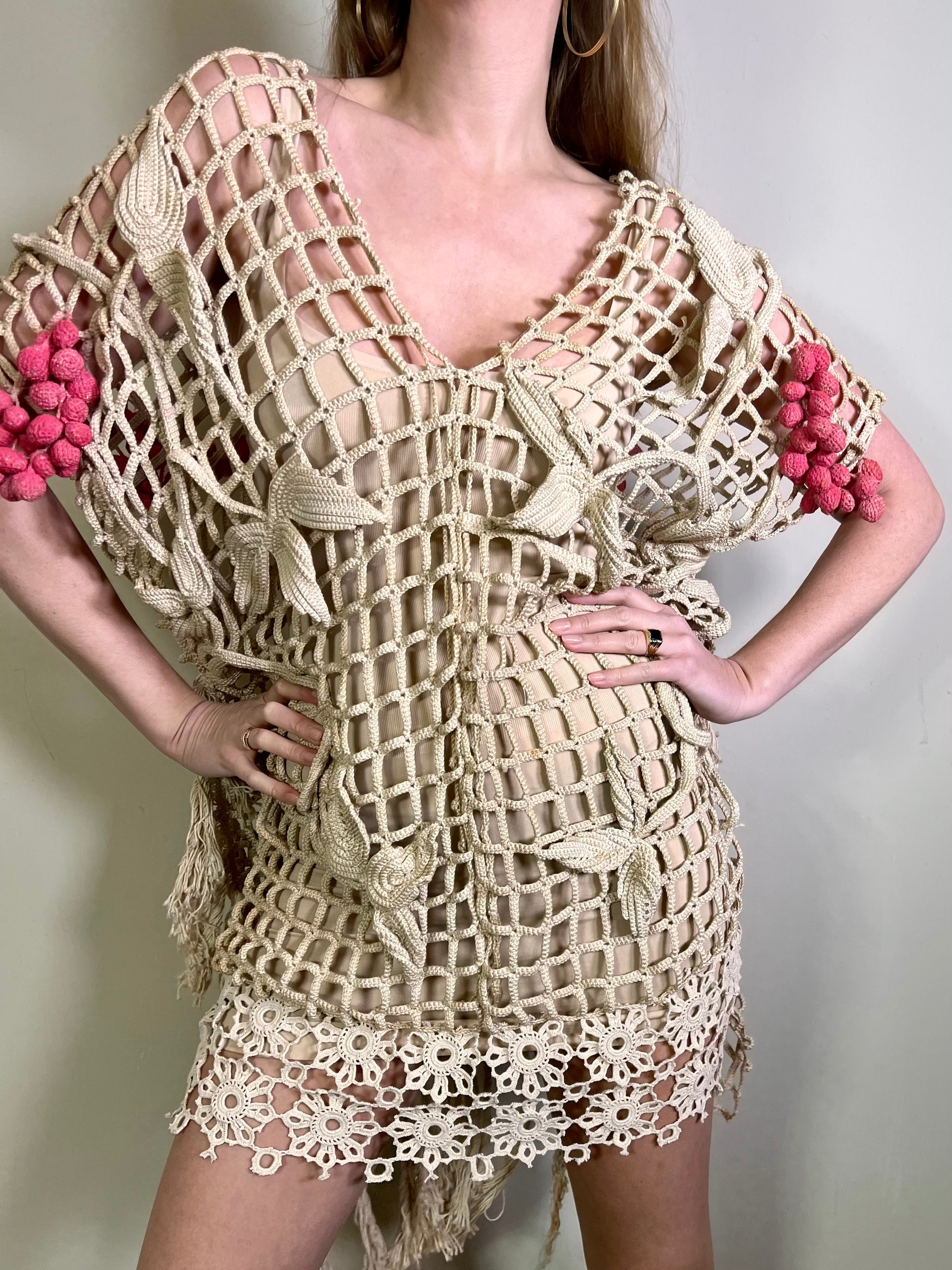 Gorgeous French net crochet beach covet up with  hanging vines. This is a true one-off piece, hand painted to create a magical textured cover up. Excellent condition.
