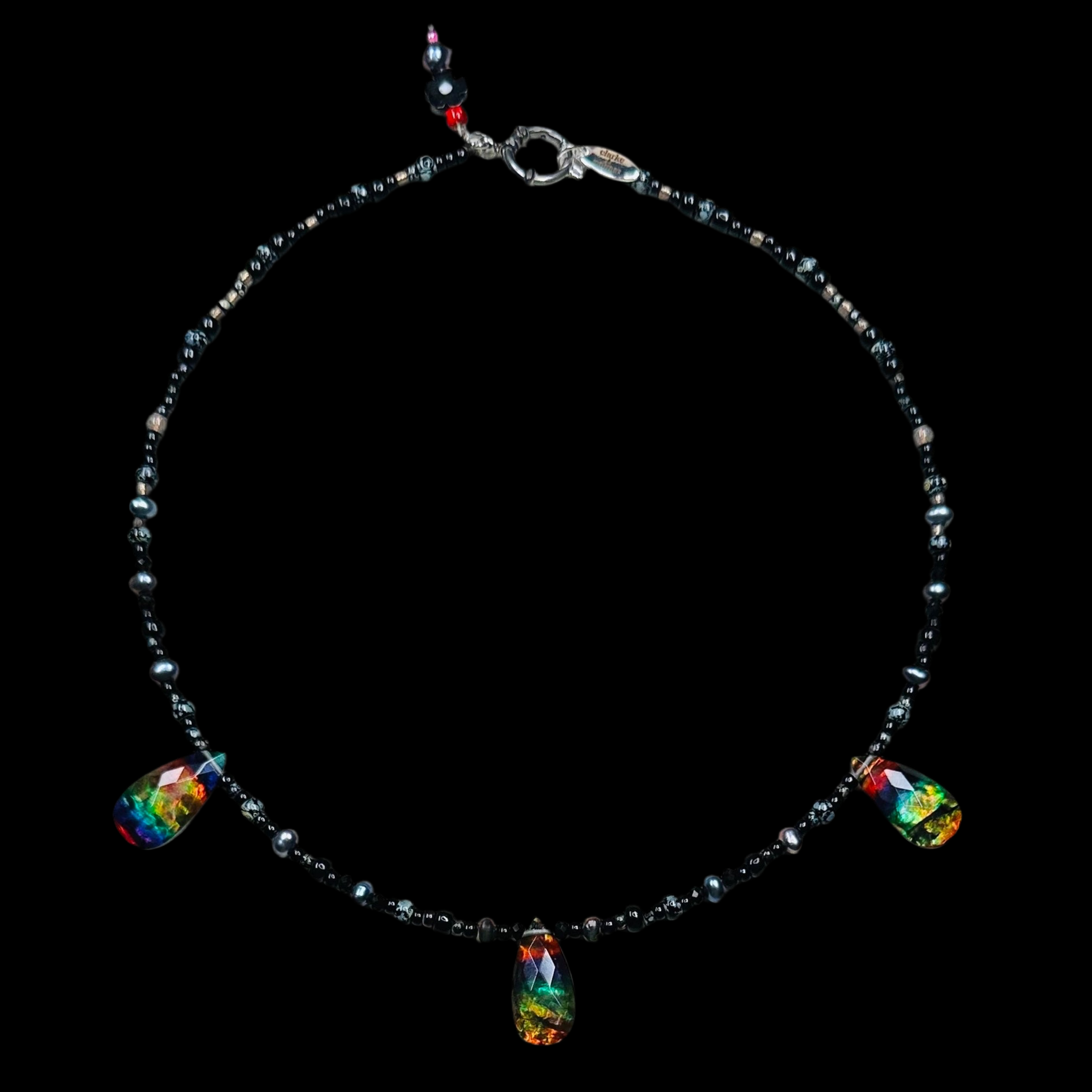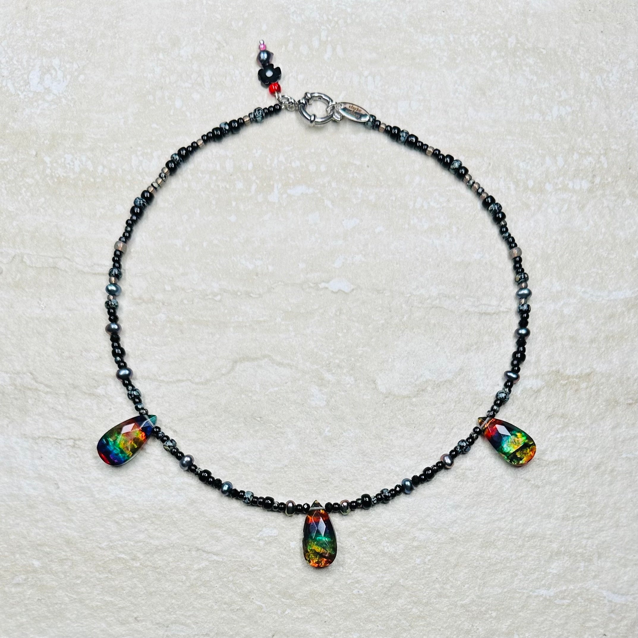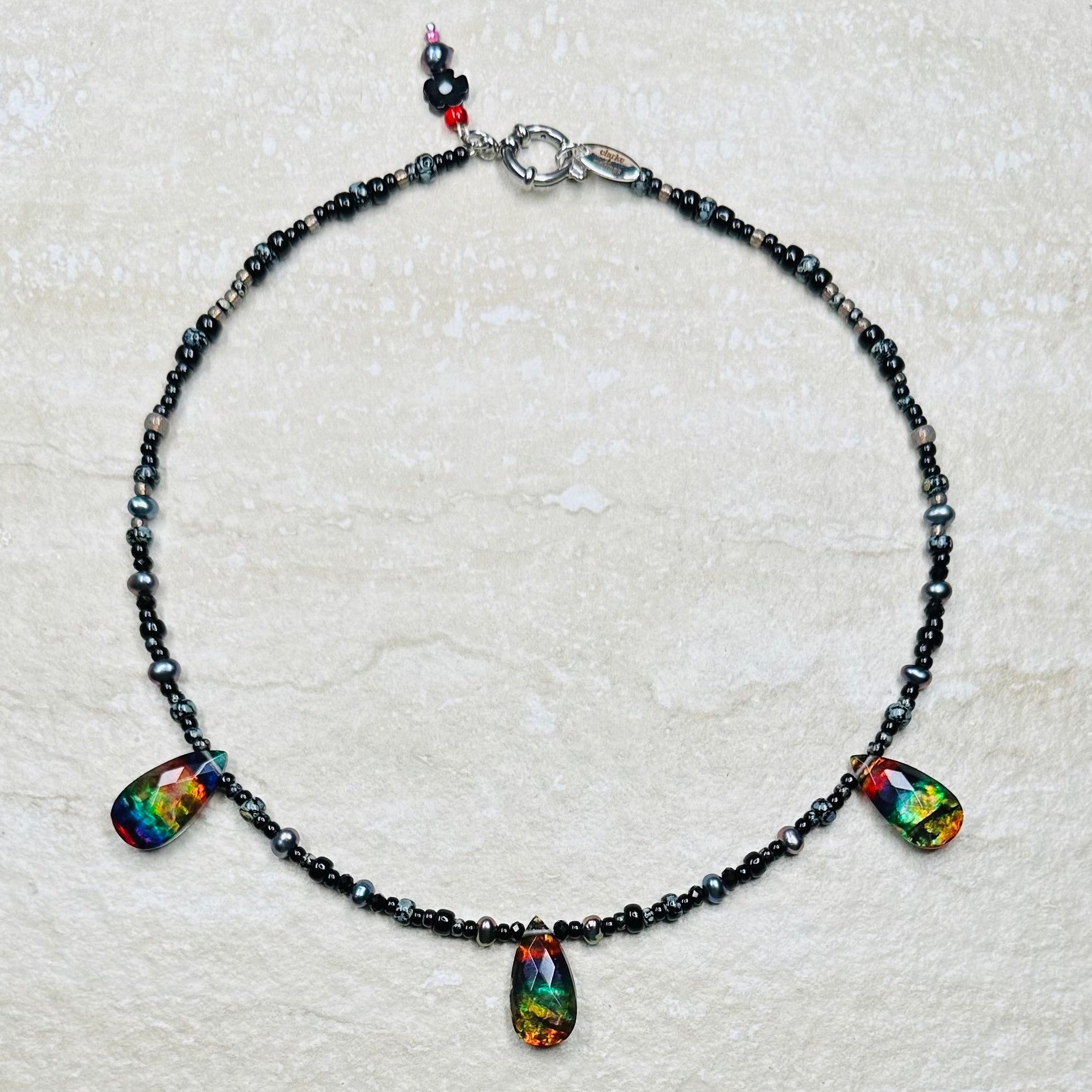 This beautiful necklace is handmade from plain and Picasso marbled black coloured glass Preciosa and Miyuki beads, peacock gray pearls, onyx, spinel, moonstone and agate handcut rondelles.  Centred by three large teardrop shimmering rainbow shell briolettes, it has a silver sailor clasp and flower hand made flower pearl charm.