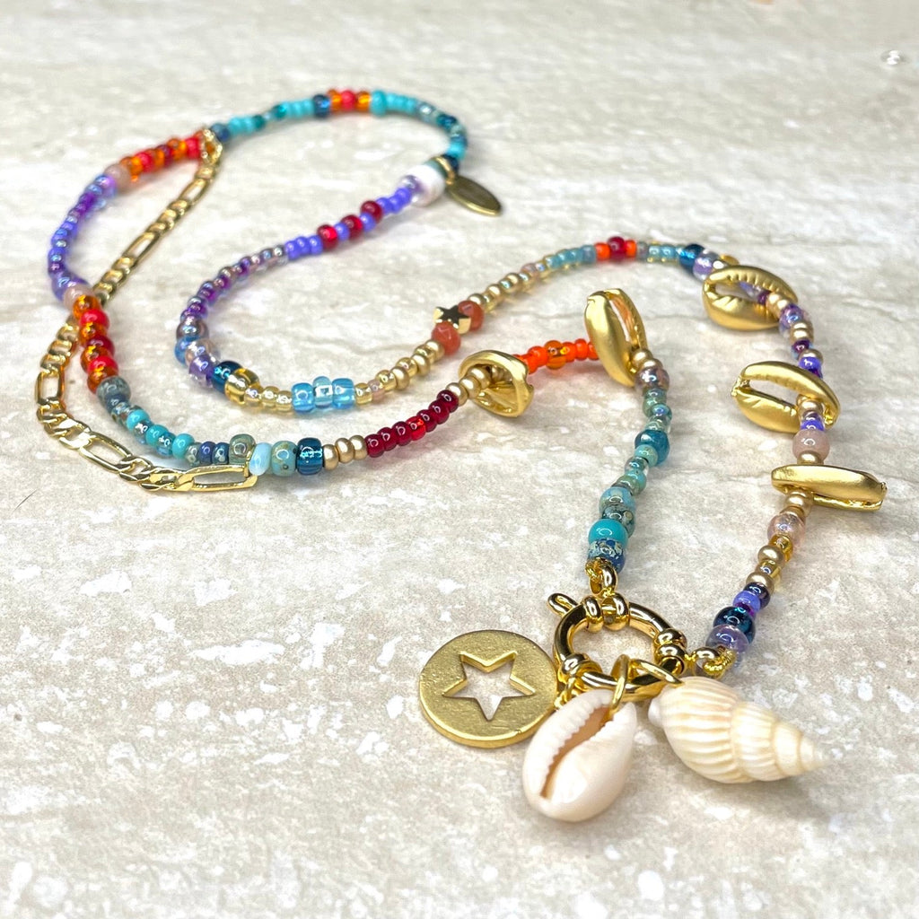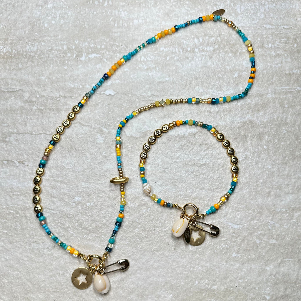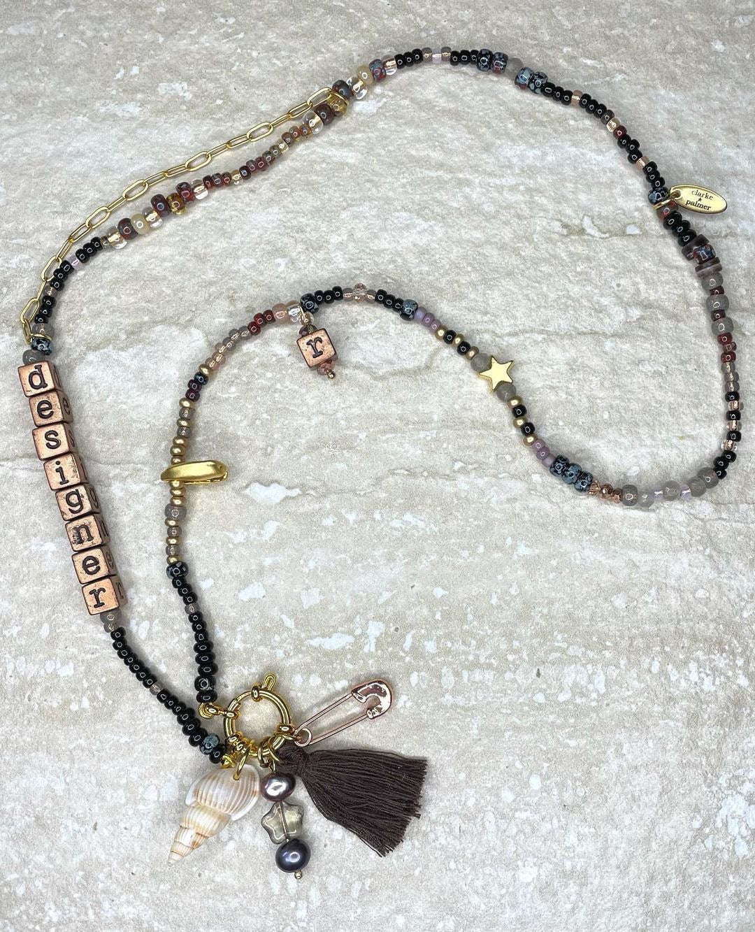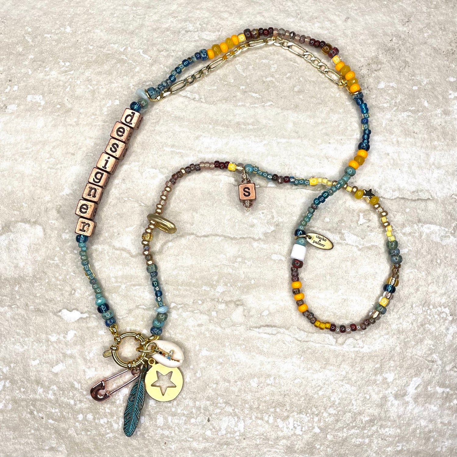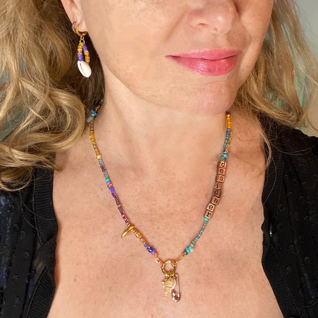 The 'Designer' clasp charm necklace is handmade from turquoise, yellow and purple shades of Preciosa, Miyuki glass beads, agate faceted rondelles and pearls with 24kt gold vermeil figaro chains, clasp and 3 charms of your choice. Choose your own shades and from choker length 40 cm, medium 45 cm and long 50 cm (pictured), 3 charms (price included) and upgrade to 24kt gold vermeil letters in the options.