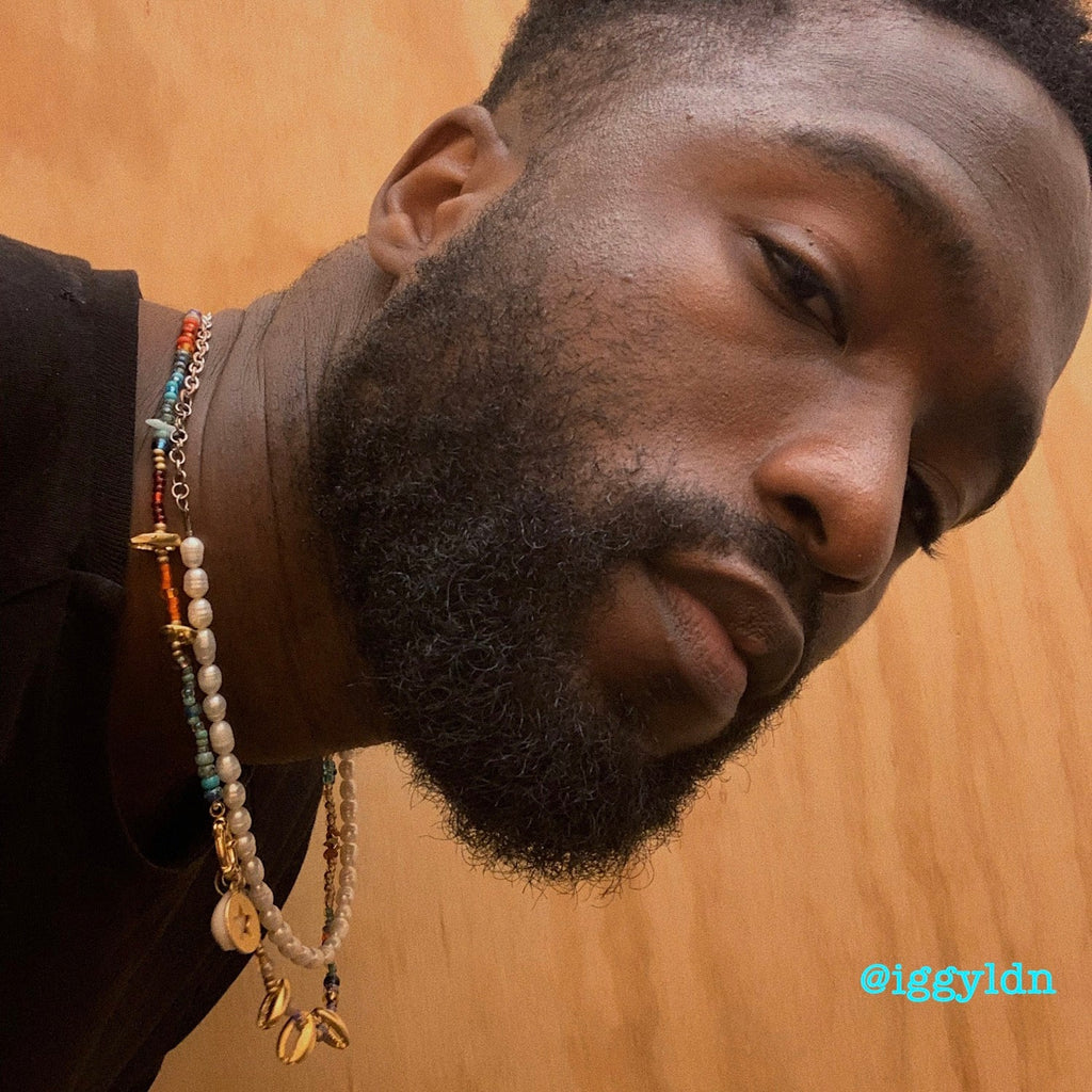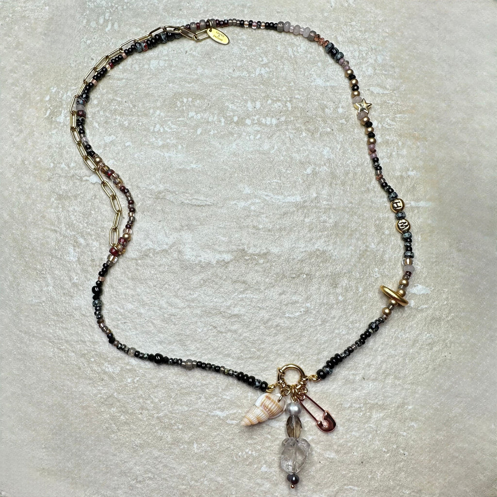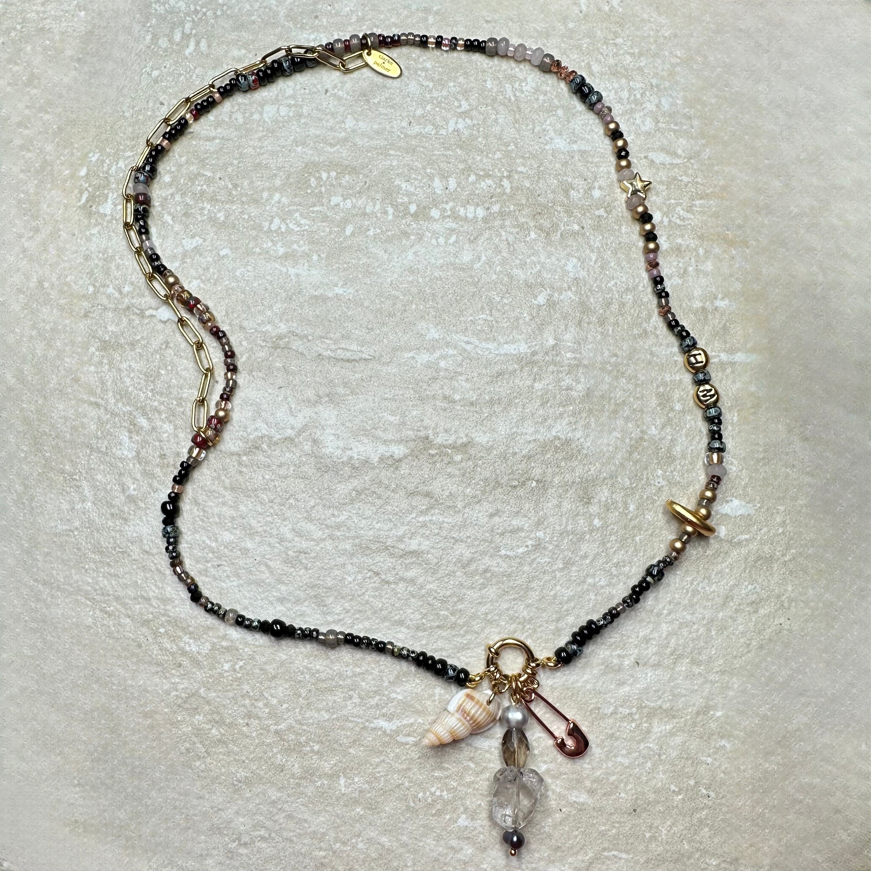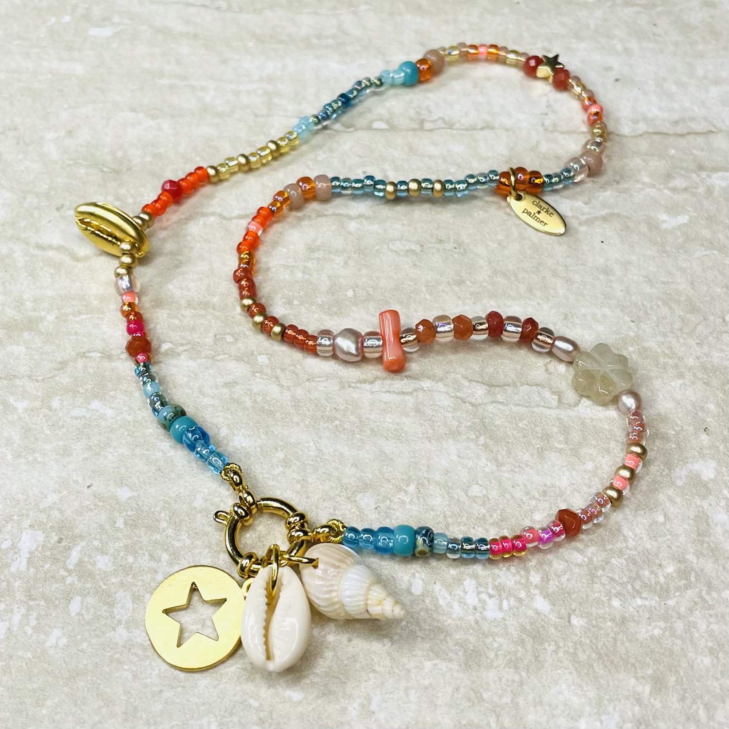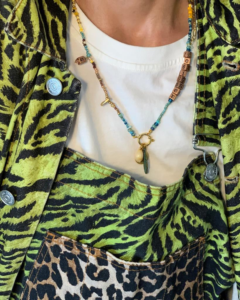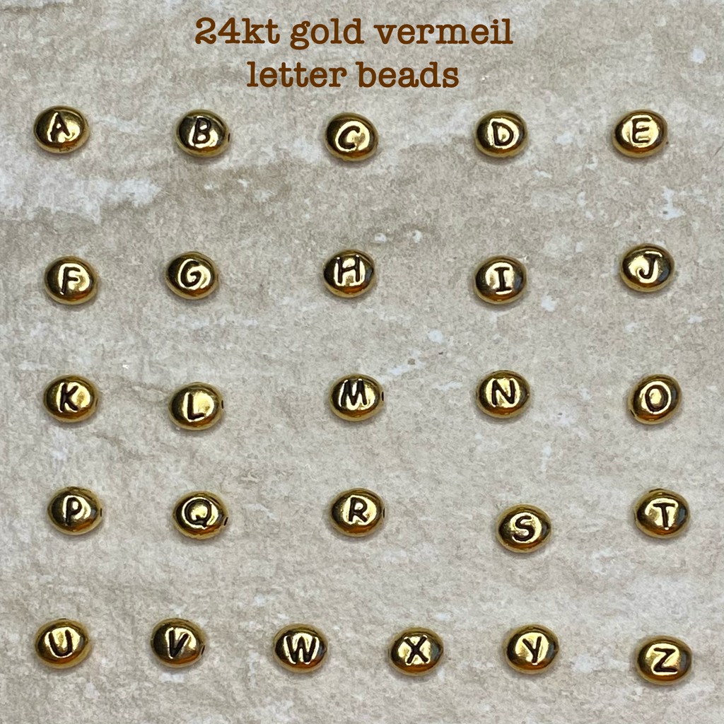 The 'Designer' clasp charm necklace is handmade from turquoise, yellow and purple shades of Preciosa, Miyuki glass beads, agate faceted rondelles and pearls with 24kt gold vermeil figaro chains, clasp and 3 charms of your choice. Choose your own shades and from choker length 40 cm, medium 45 cm and long 50 cm (pictured), 3 charms (price included) and upgrade to 24kt gold vermeil letters in the options.