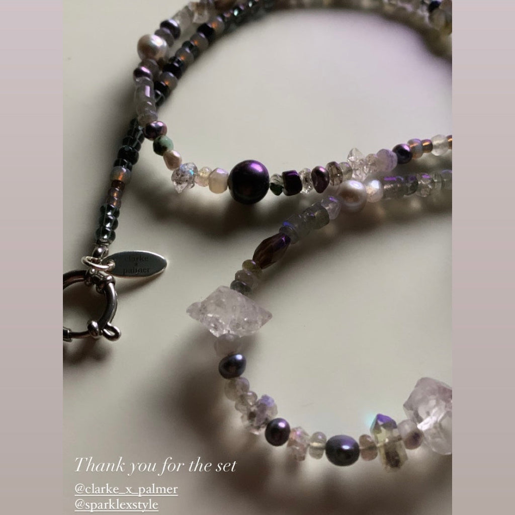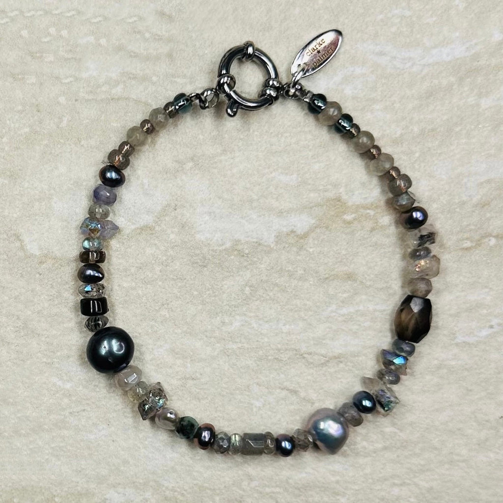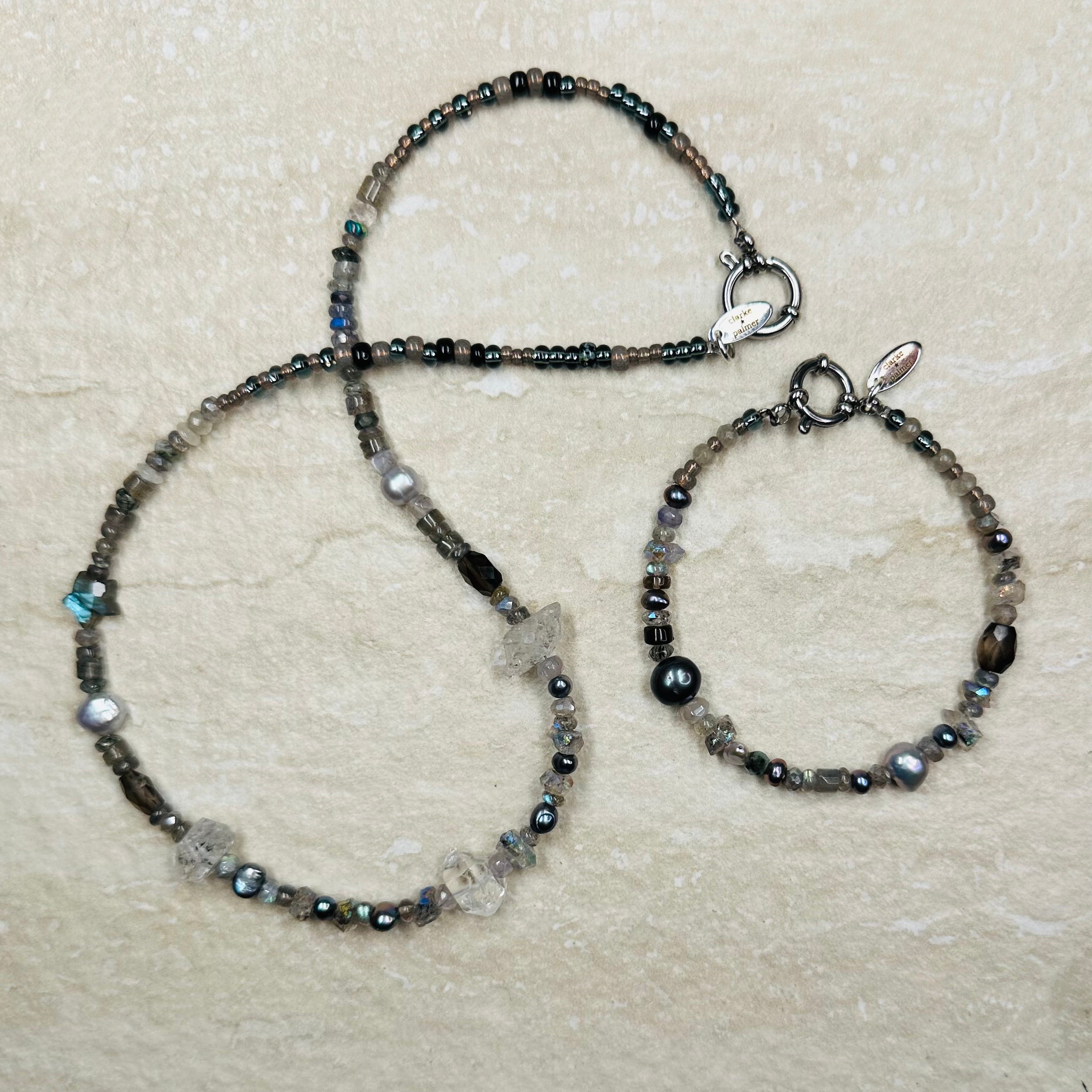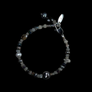 A brand new edition and a perfect match to our Diamond in the Dirt necklace designed especially for Ralph Pemberton aka RPEMZ, this blends ombré shades of Ethiopian opal, labrodite, black Pearl, moonstone, smoky quartz, herkimer diamonds, grey and black pearls. It features a silver vermeil clasp. Each bracelet is unique and all are slightly different. Choose your preferred length in the options.