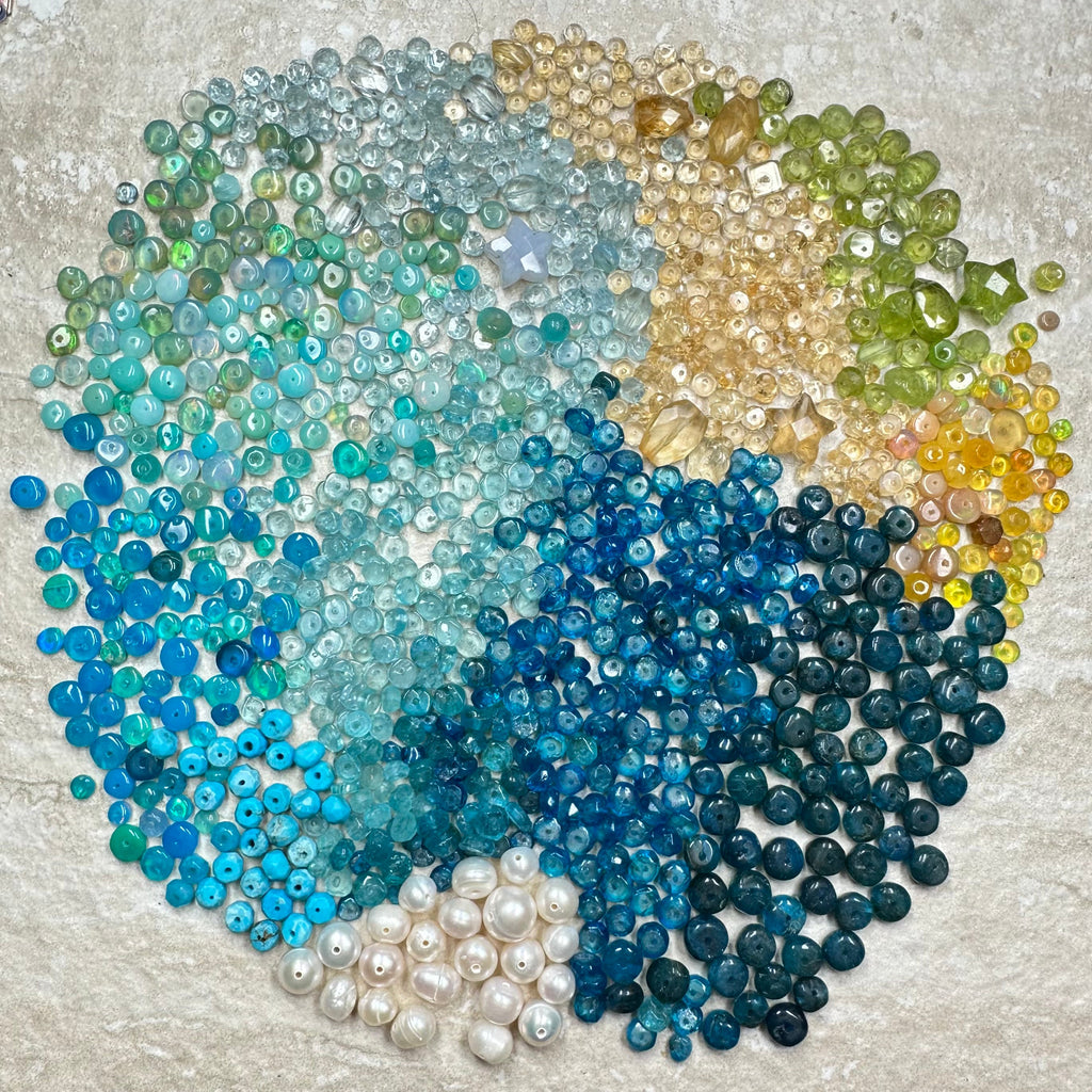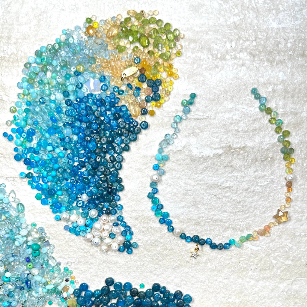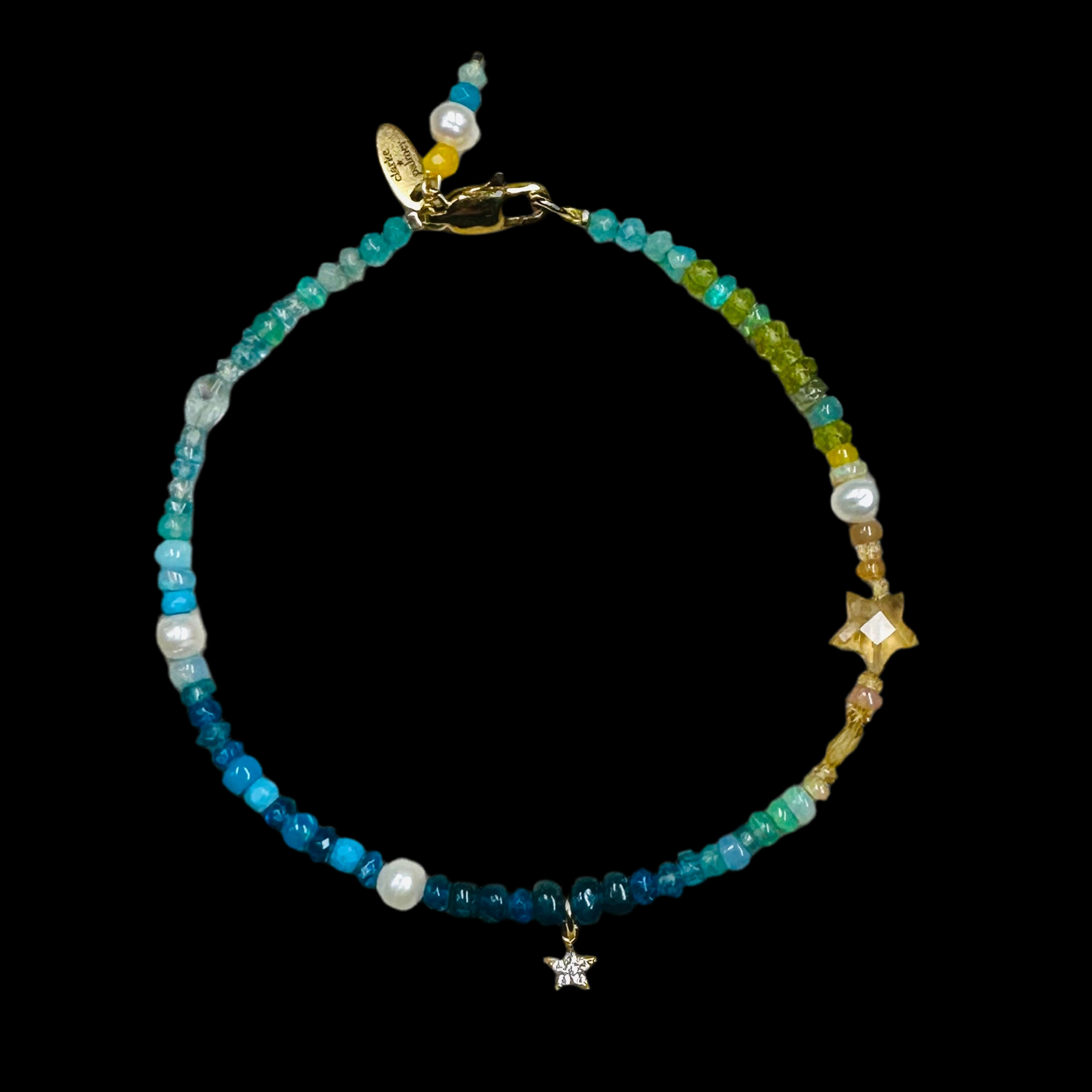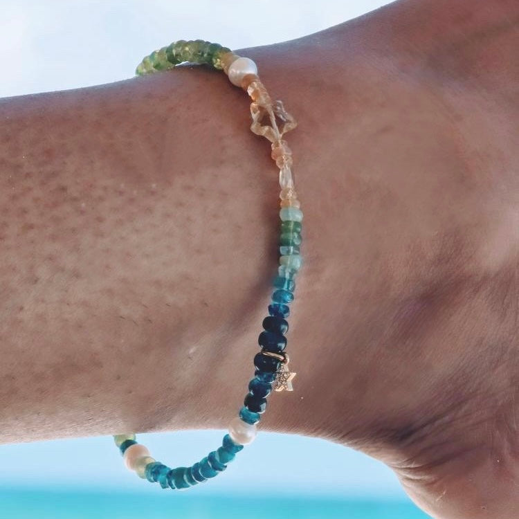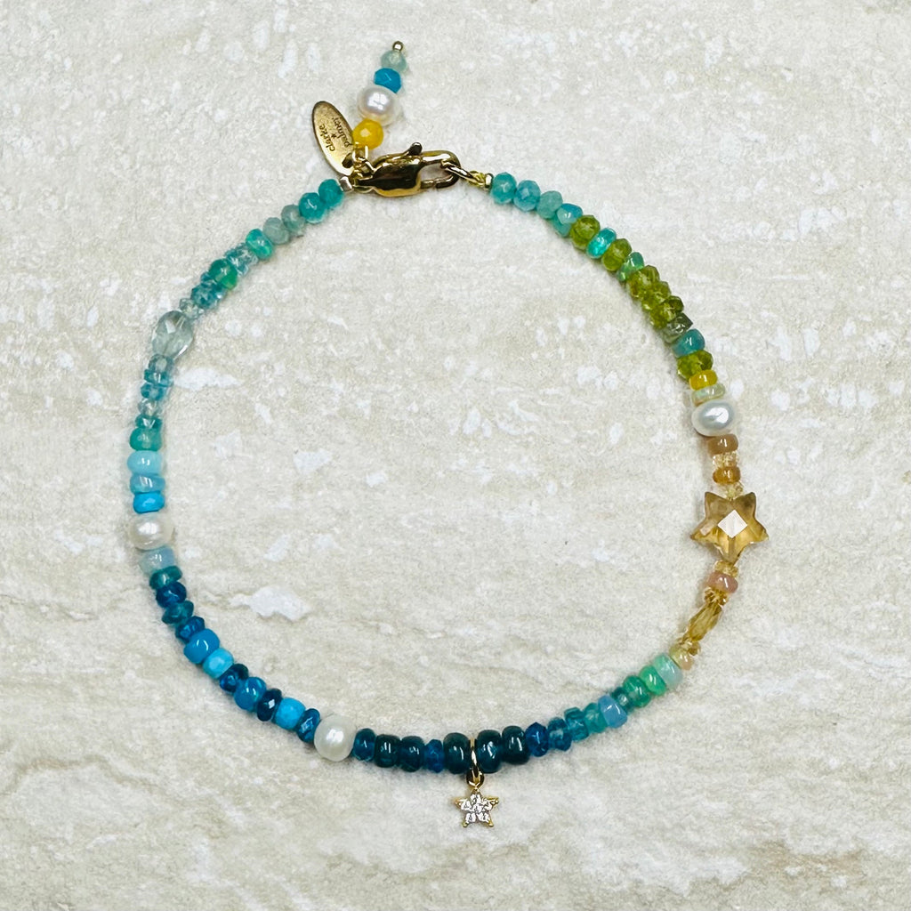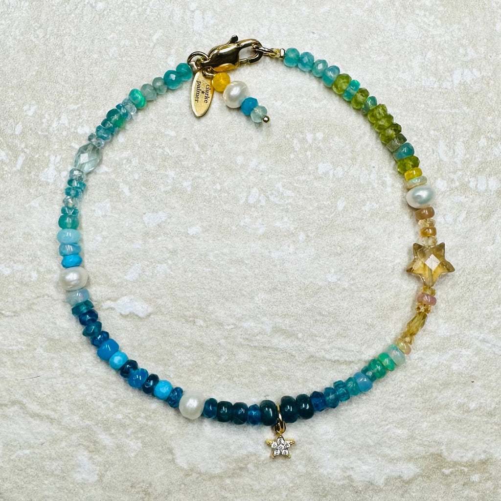 Our stunning Dream Beach Anklet is handmade from ombré shades of sustainably sourced gemstones.  It includes hand cut citrine star and opal, aquamarine, apatite, citrine, topaz, pearl, peridot and pearl rondelles. It has a 22 kt gold vermeil cz star charm and a pearl and gemstone charm.