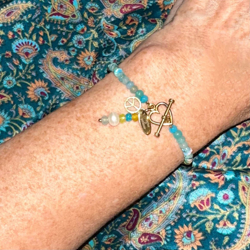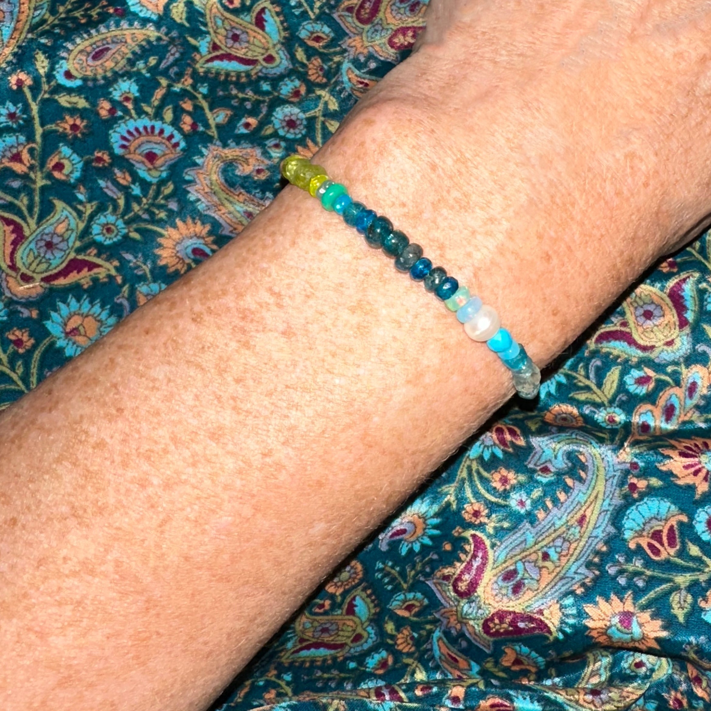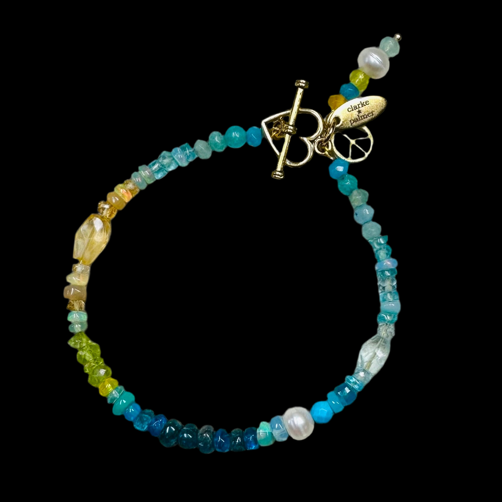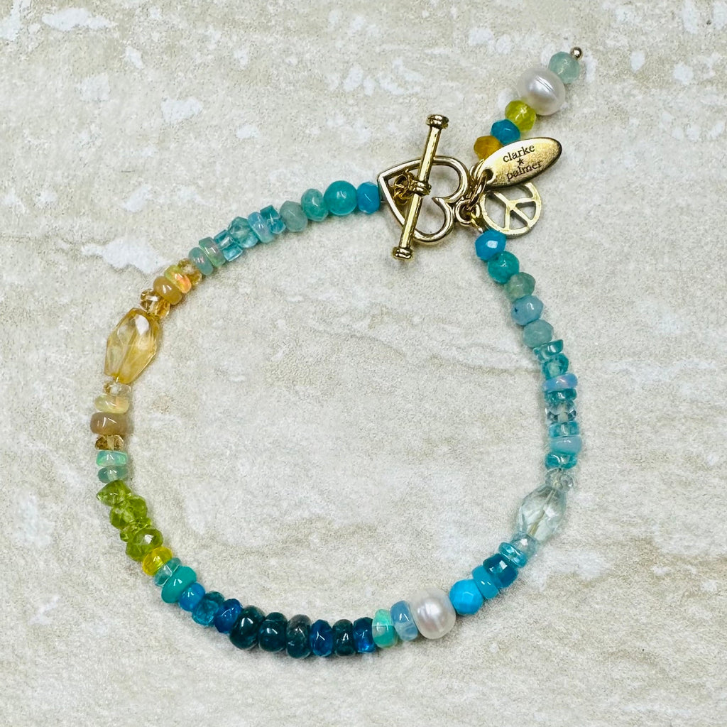 Our stunning Dream Beach Bracelet is handmade from ombré shades of sustainably sourced gemstones.  It includes hand cut opal, aquamarine, apatite, citrine, topaz, pearl, peridot and pearl rondelles. It has a 22 kt gold cz star and a pearl and gemstone charm.
