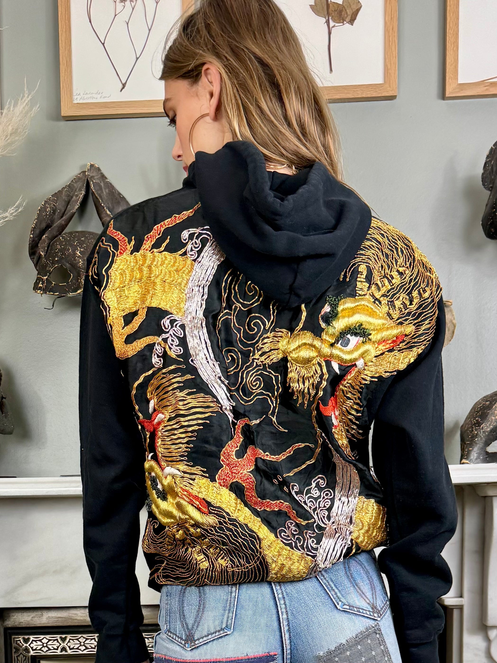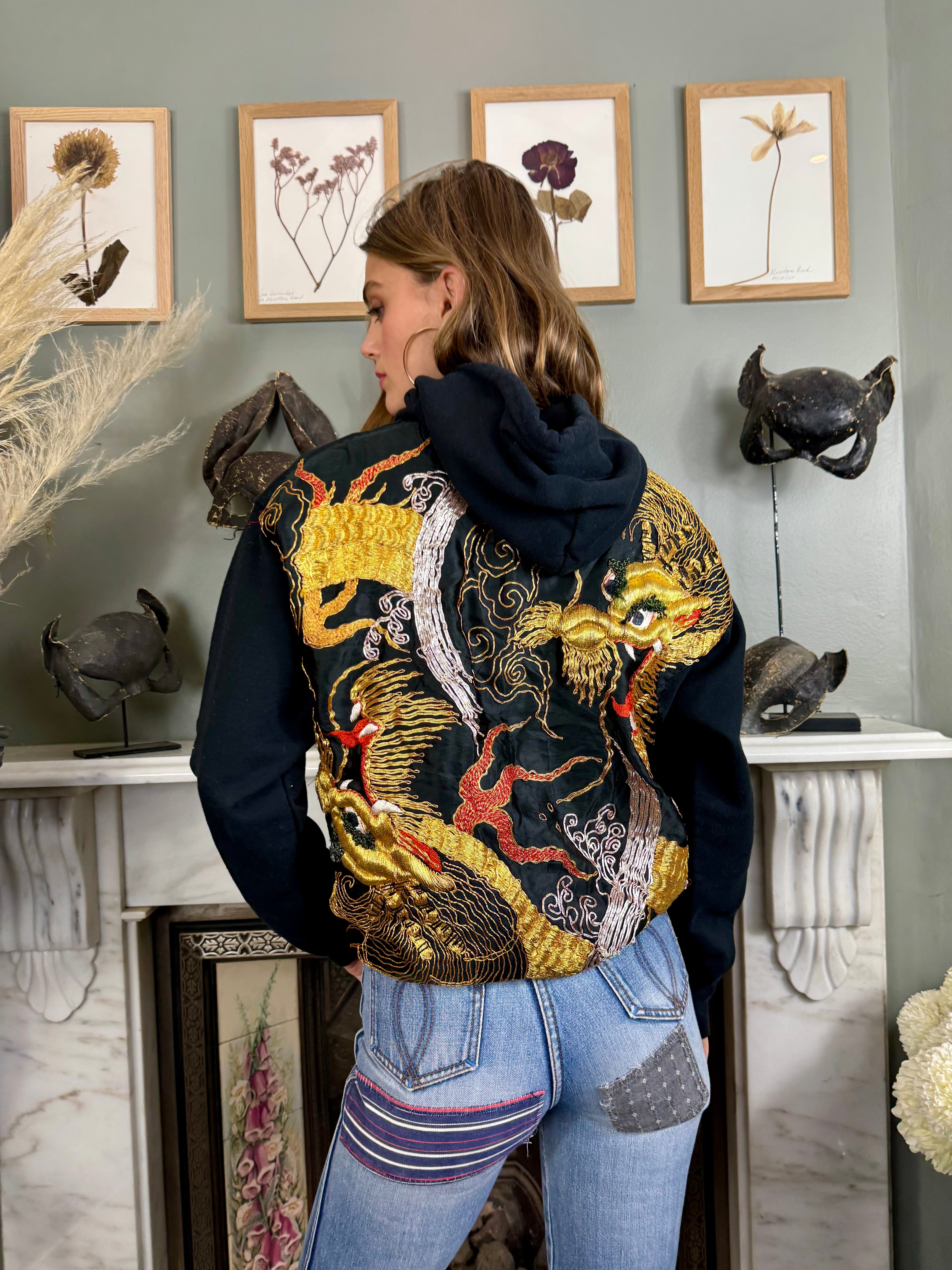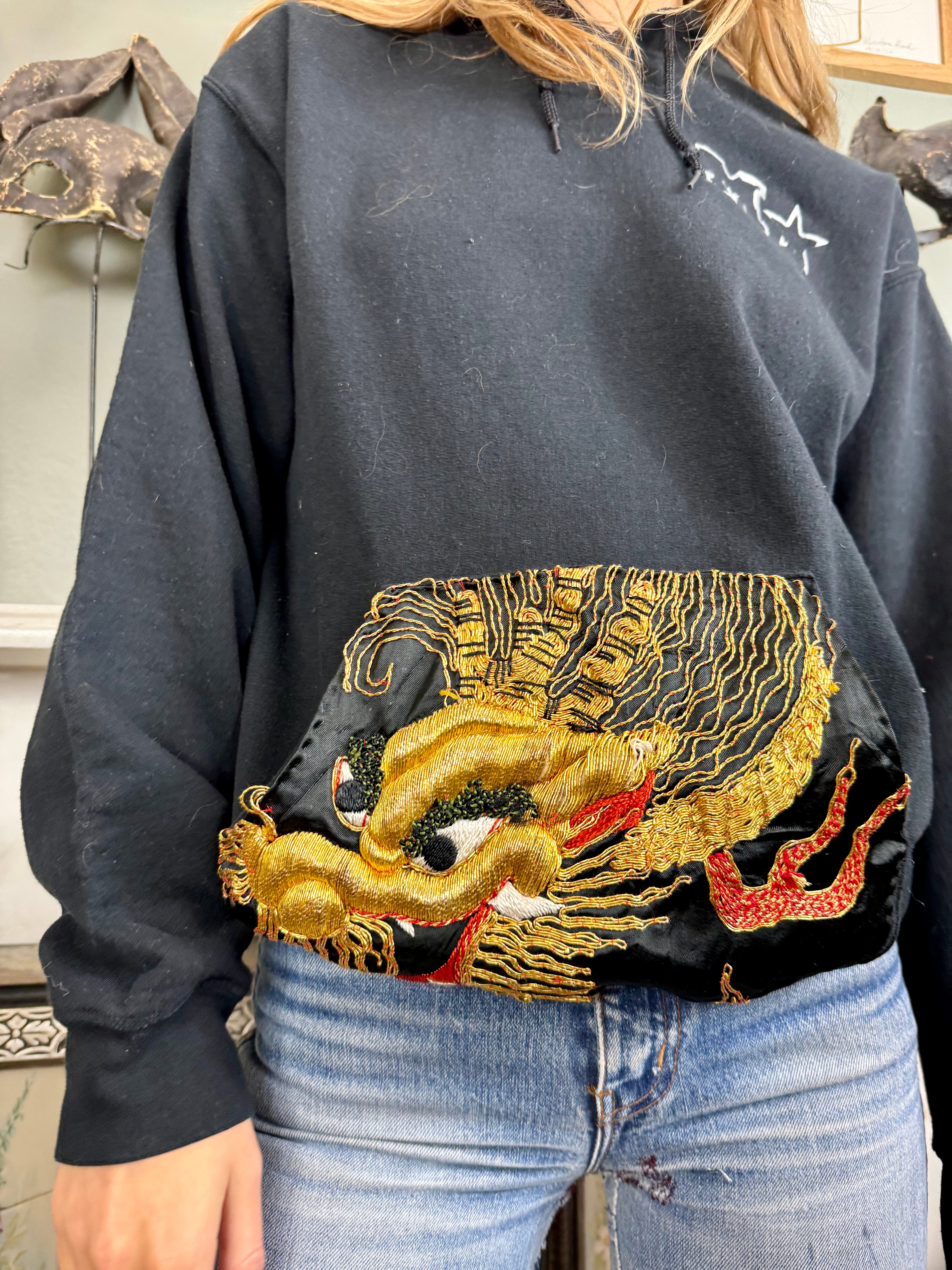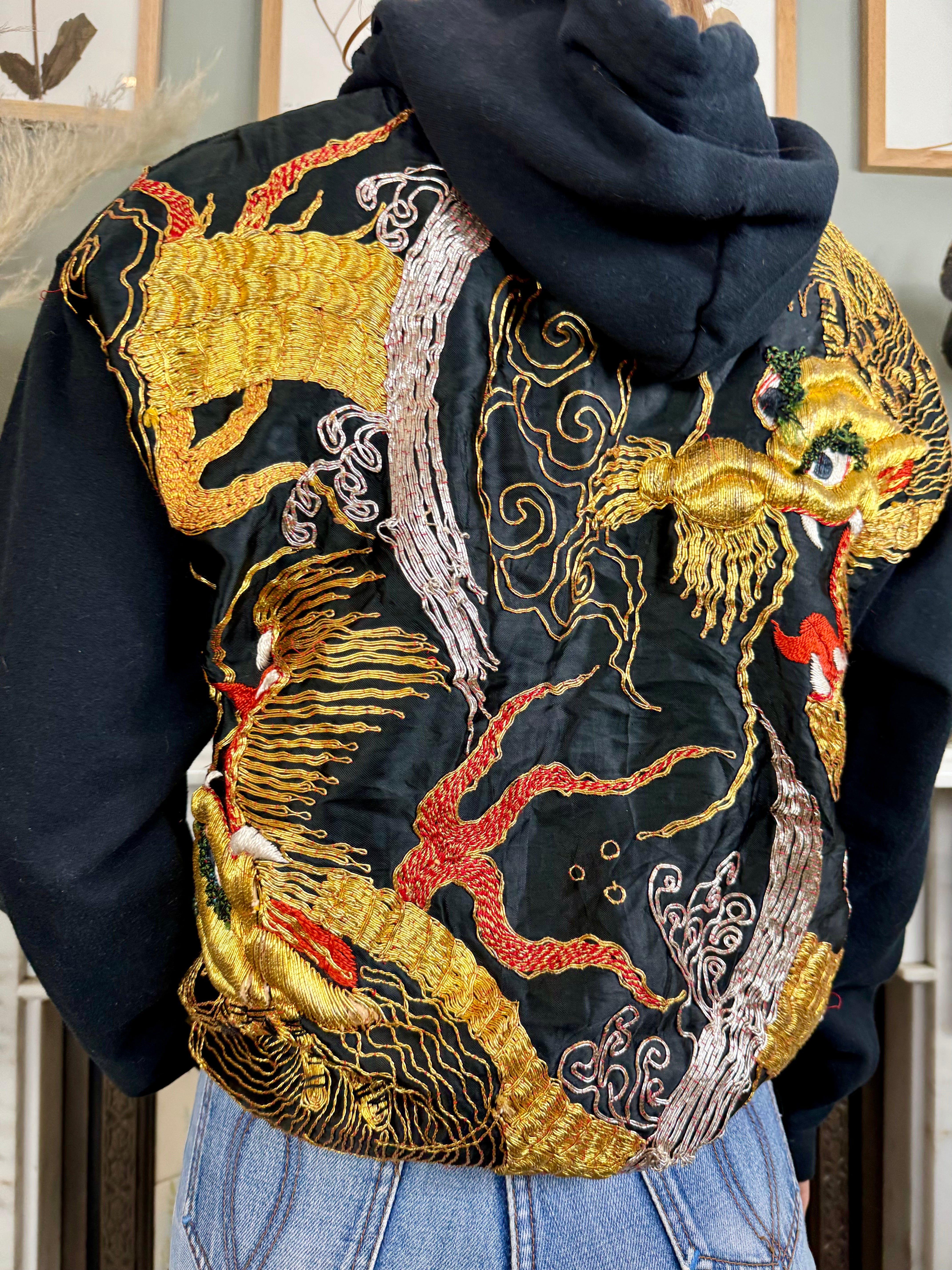 This vintage black sweatshirt boasts a unique touch with a reworked 40s silk back and pocket featuring intricately embroidered dragons in gold thread. Stay warm and stylish with its long sleeves, hood, and front pocket. Perfect for those who appreciate vintage and high-quality craftsmanship wishing to uplift their casual wear.