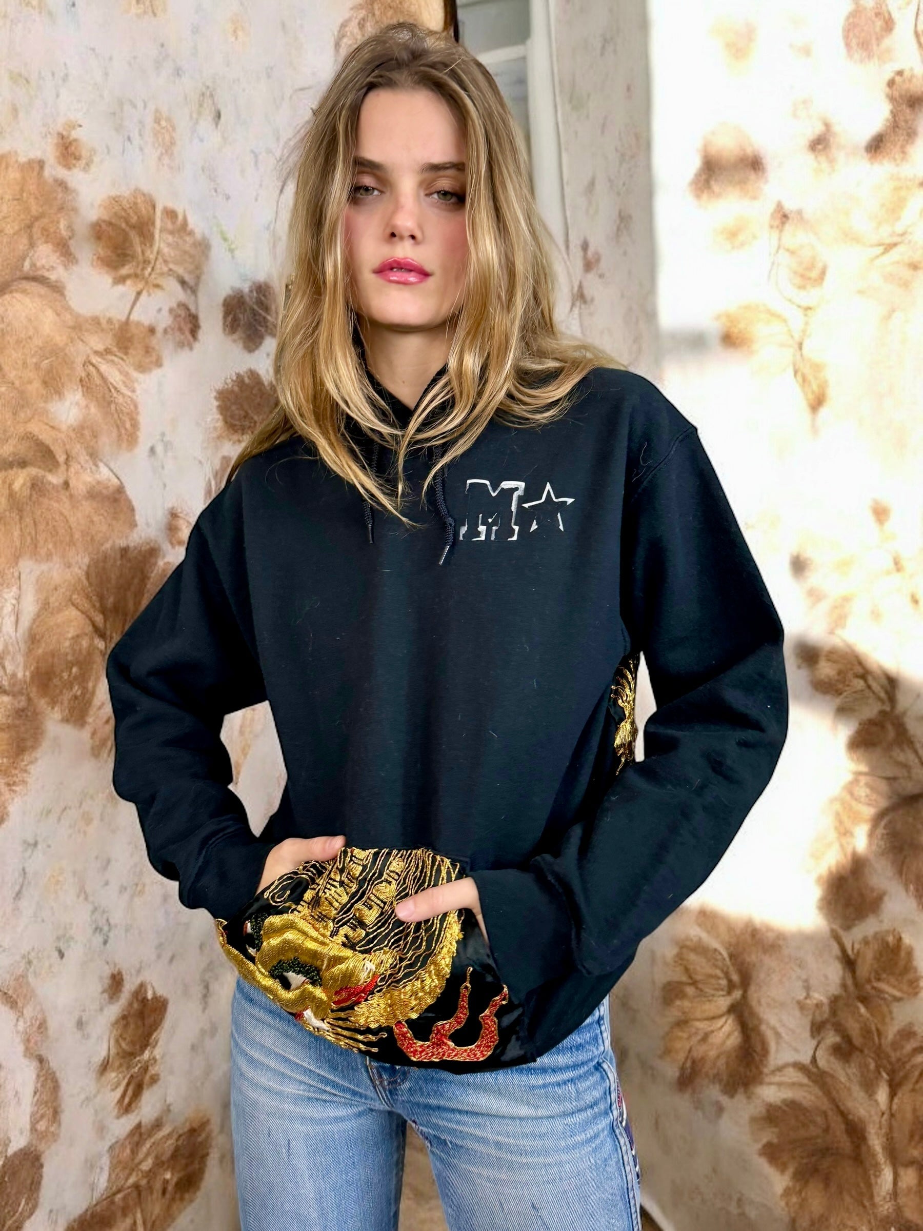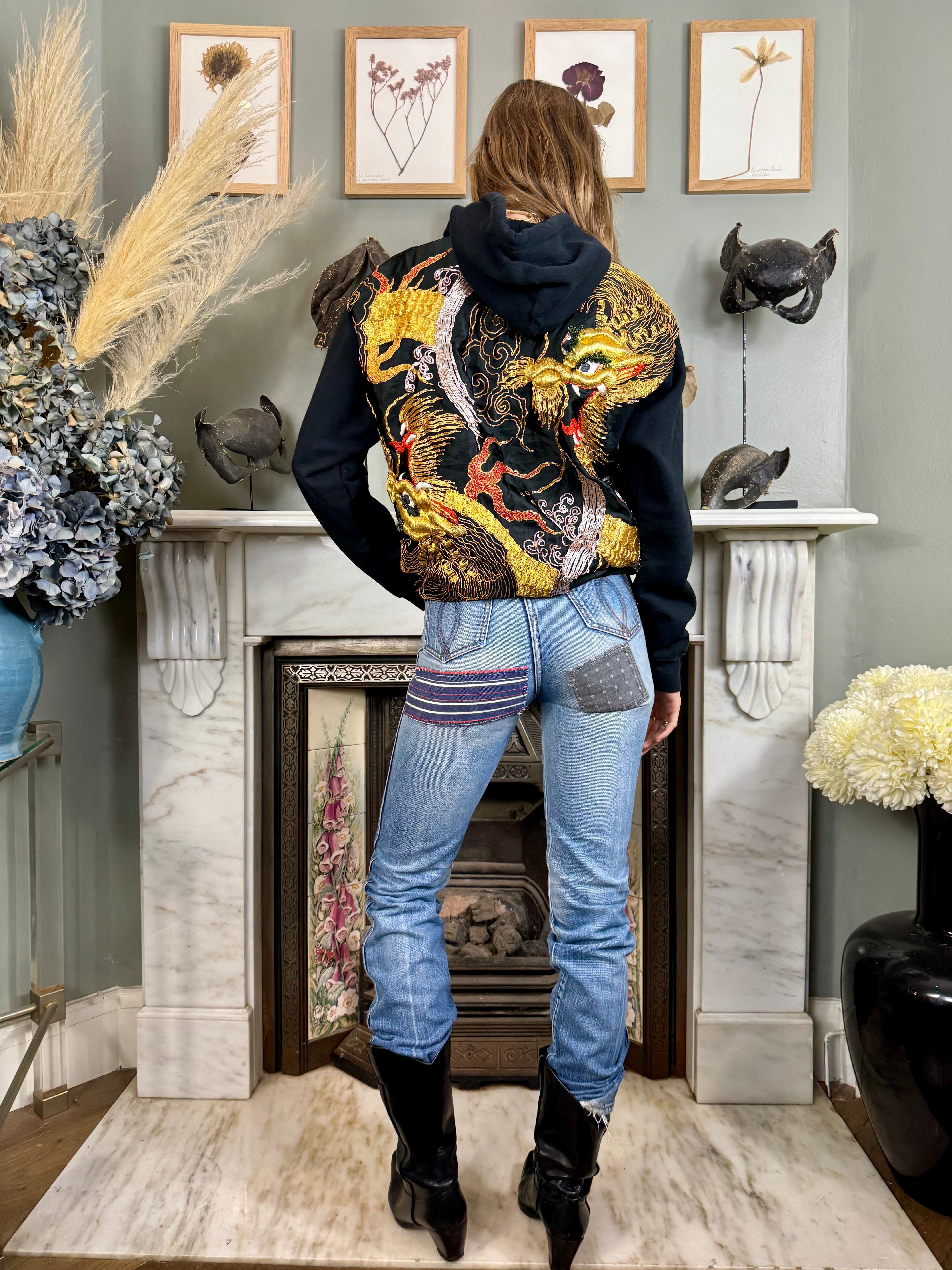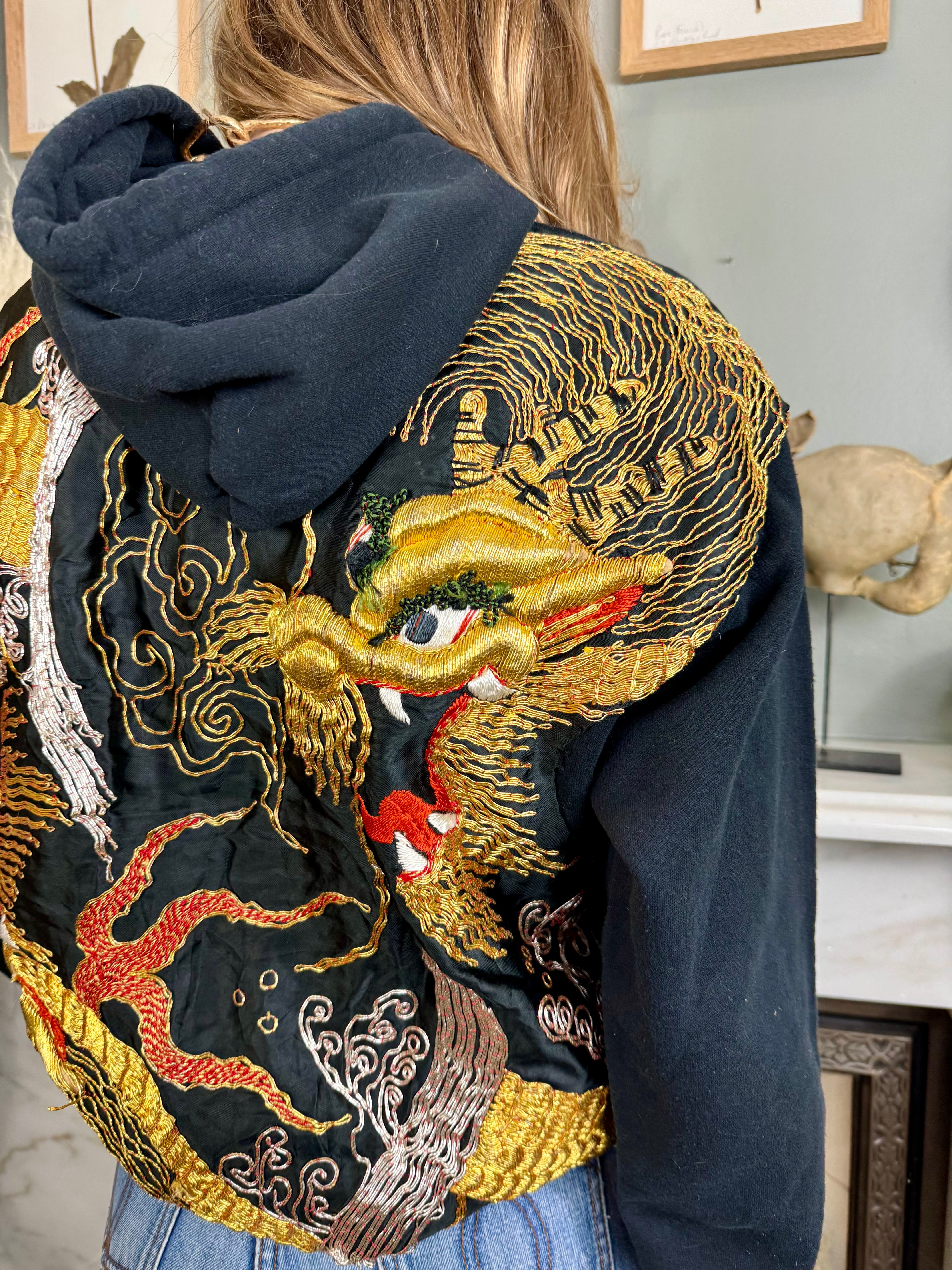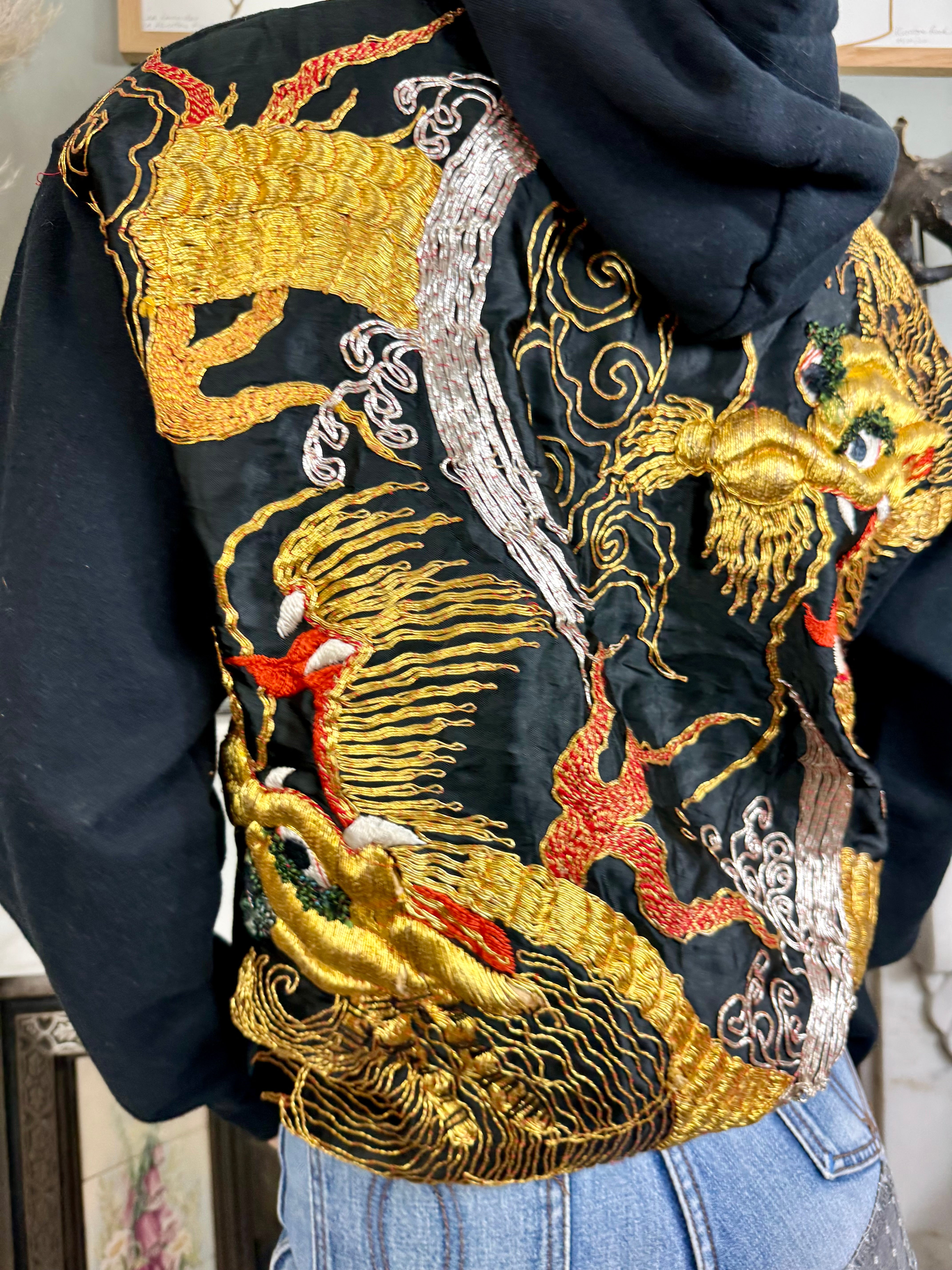 This vintage black sweatshirt boasts a unique touch with a reworked 40s silk back and pocket featuring intricately embroidered dragons in gold thread. Stay warm and stylish with its long sleeves, hood, and front pocket. Perfect for those who appreciate vintage and high-quality craftsmanship wishing to uplift their casual wear.