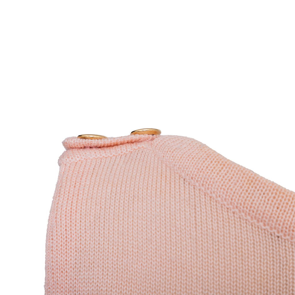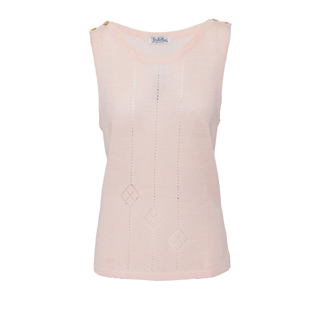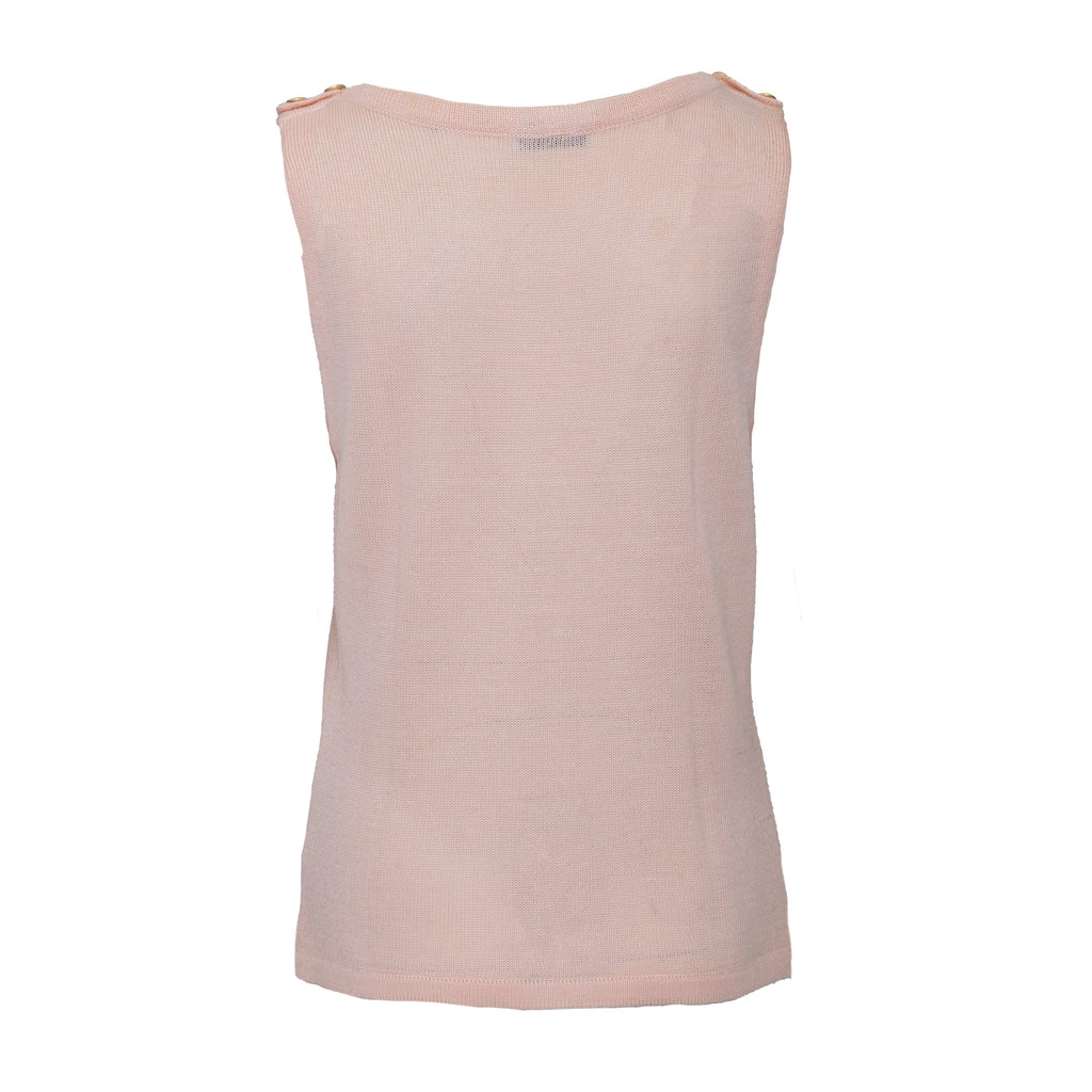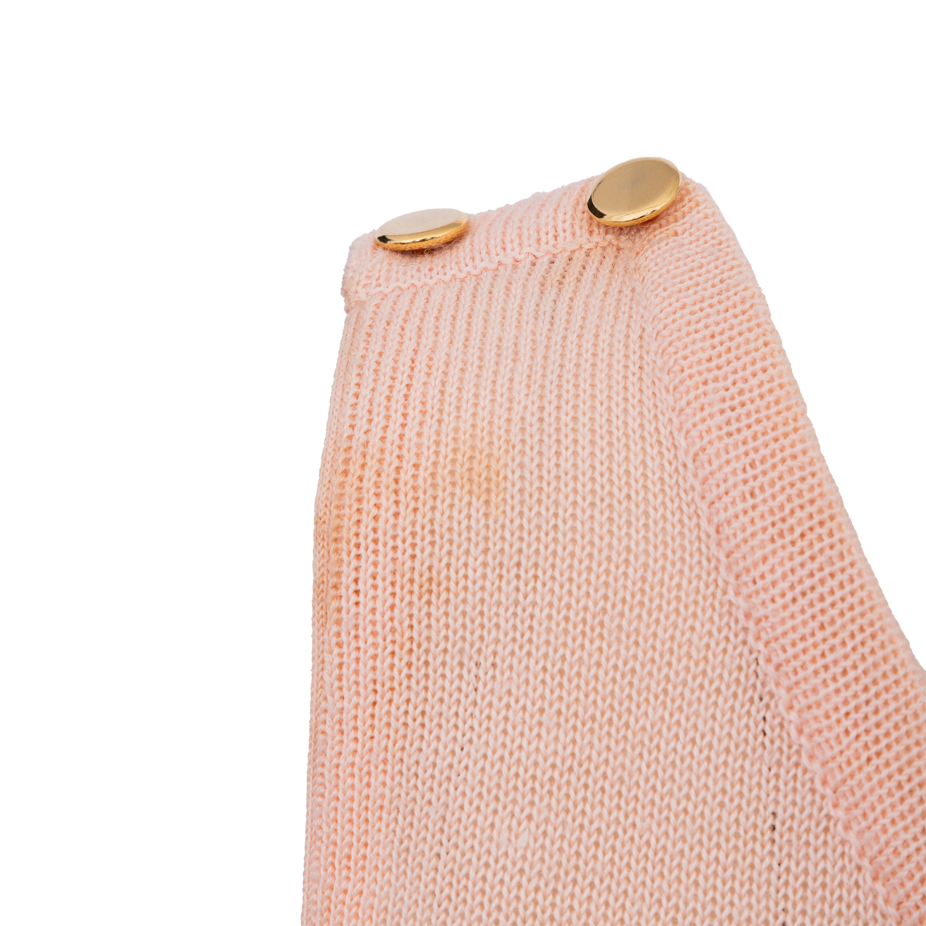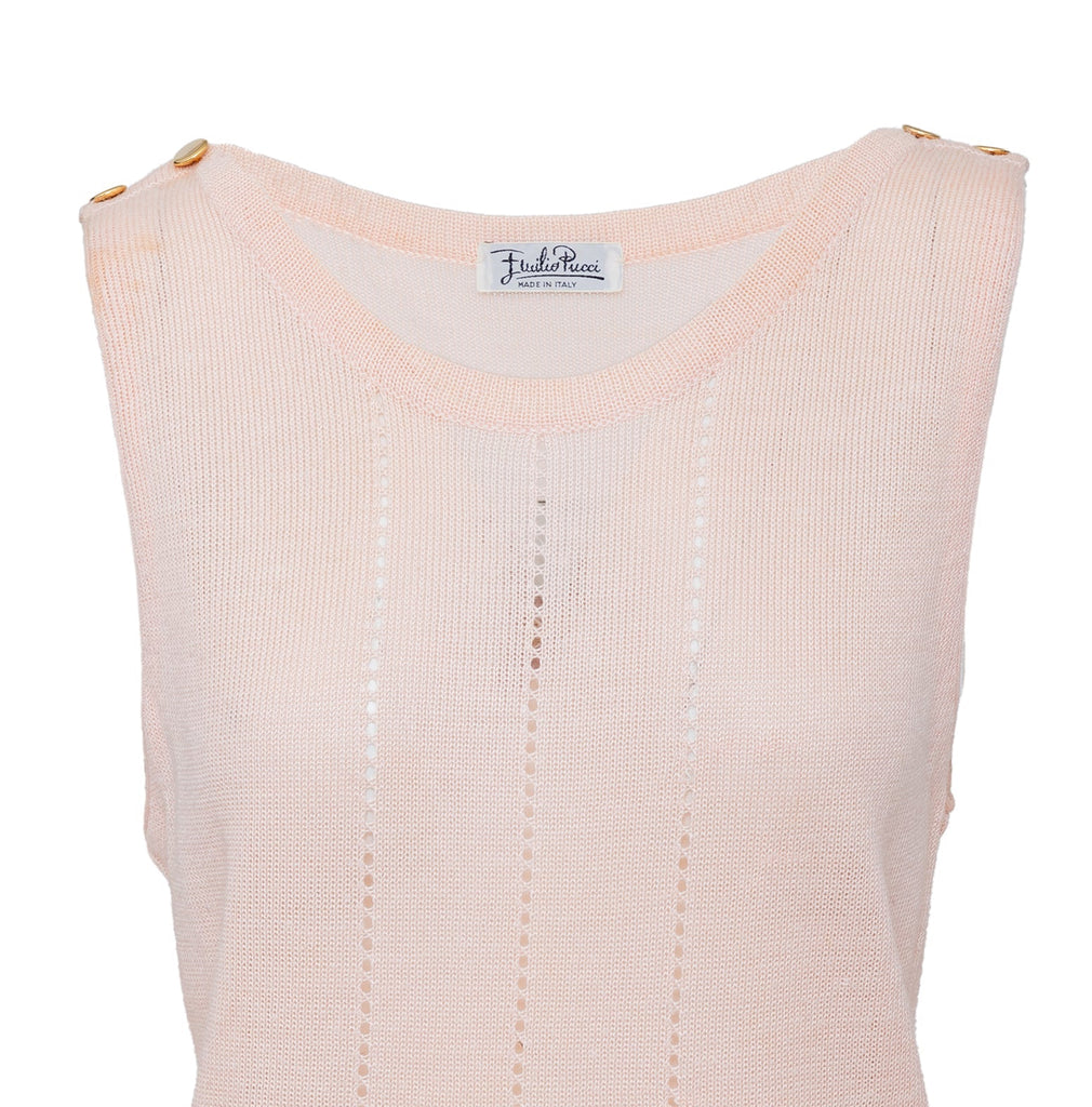 Add a touch of vintage charm with this Emilio Pucci knit top from the 70s. Crafted from Ramie, a natural linen-like fiber, it features a delicate light pink color. The sleeveless boatneck design features a unique perforated pattern on the front and decorative golden buttons on the shoulder.