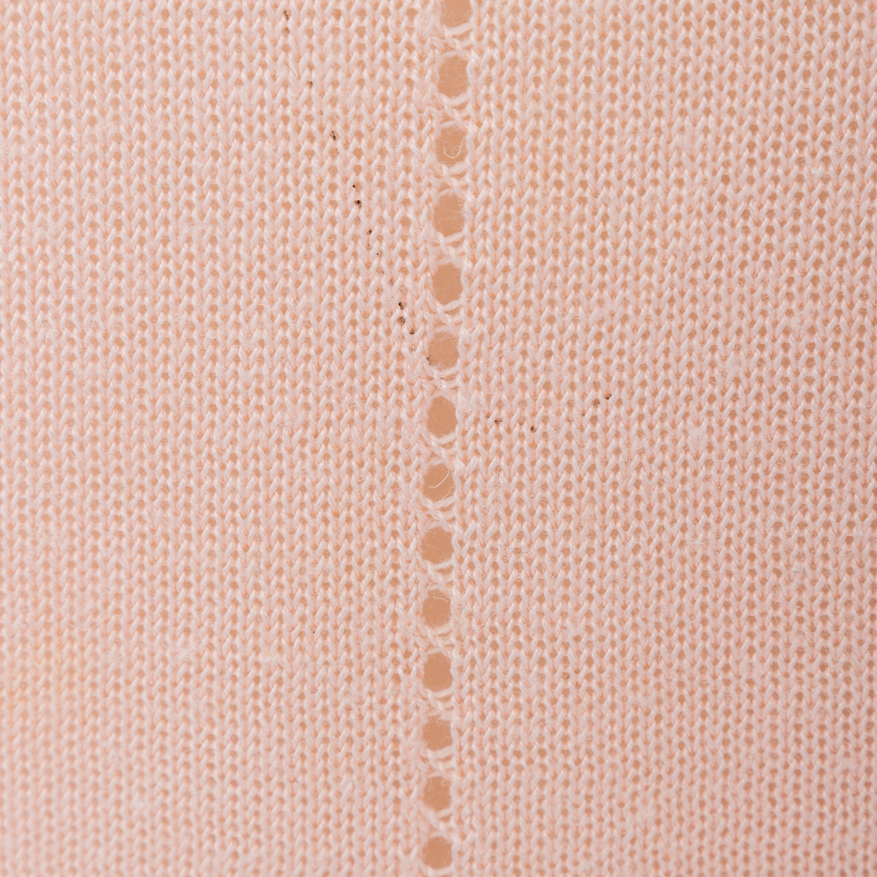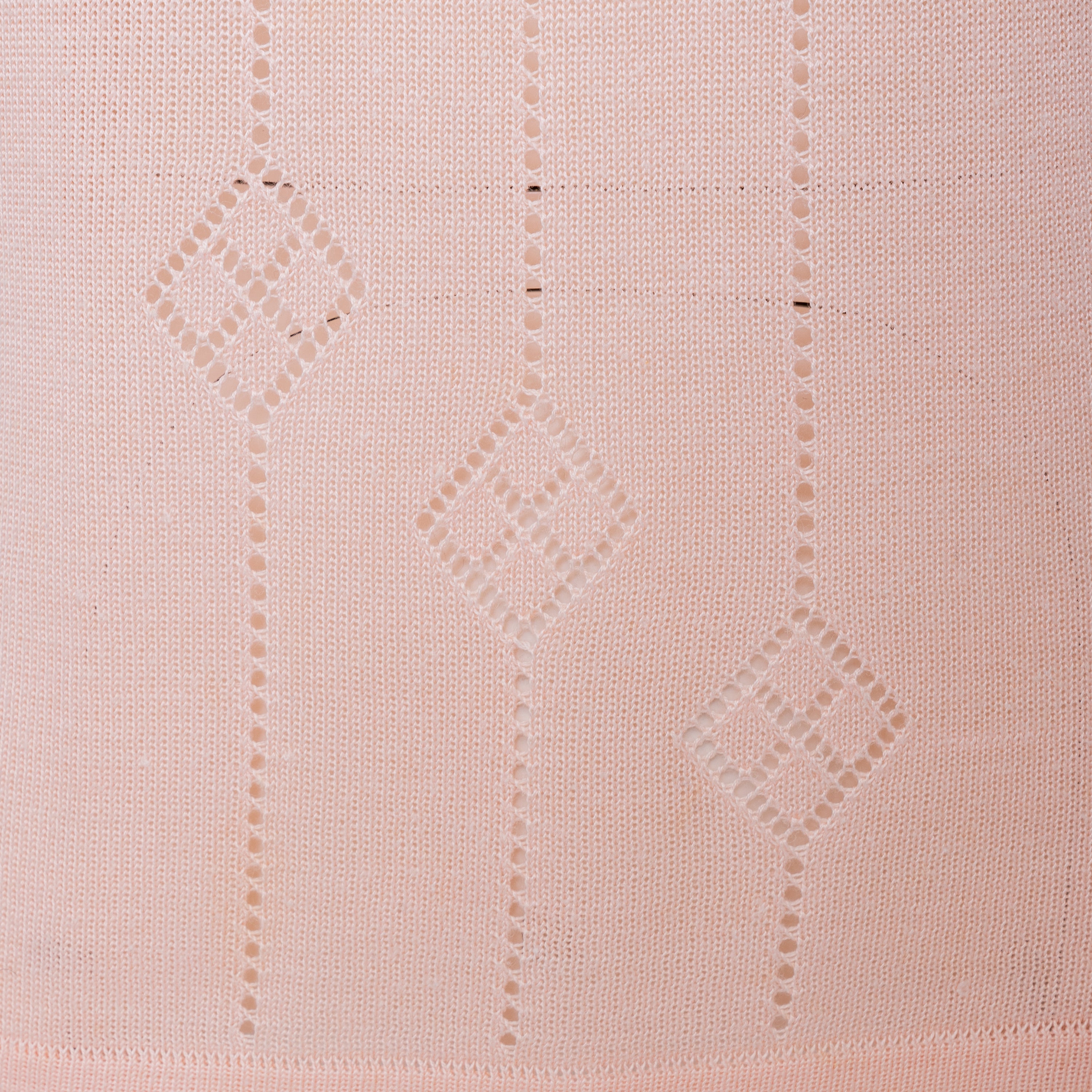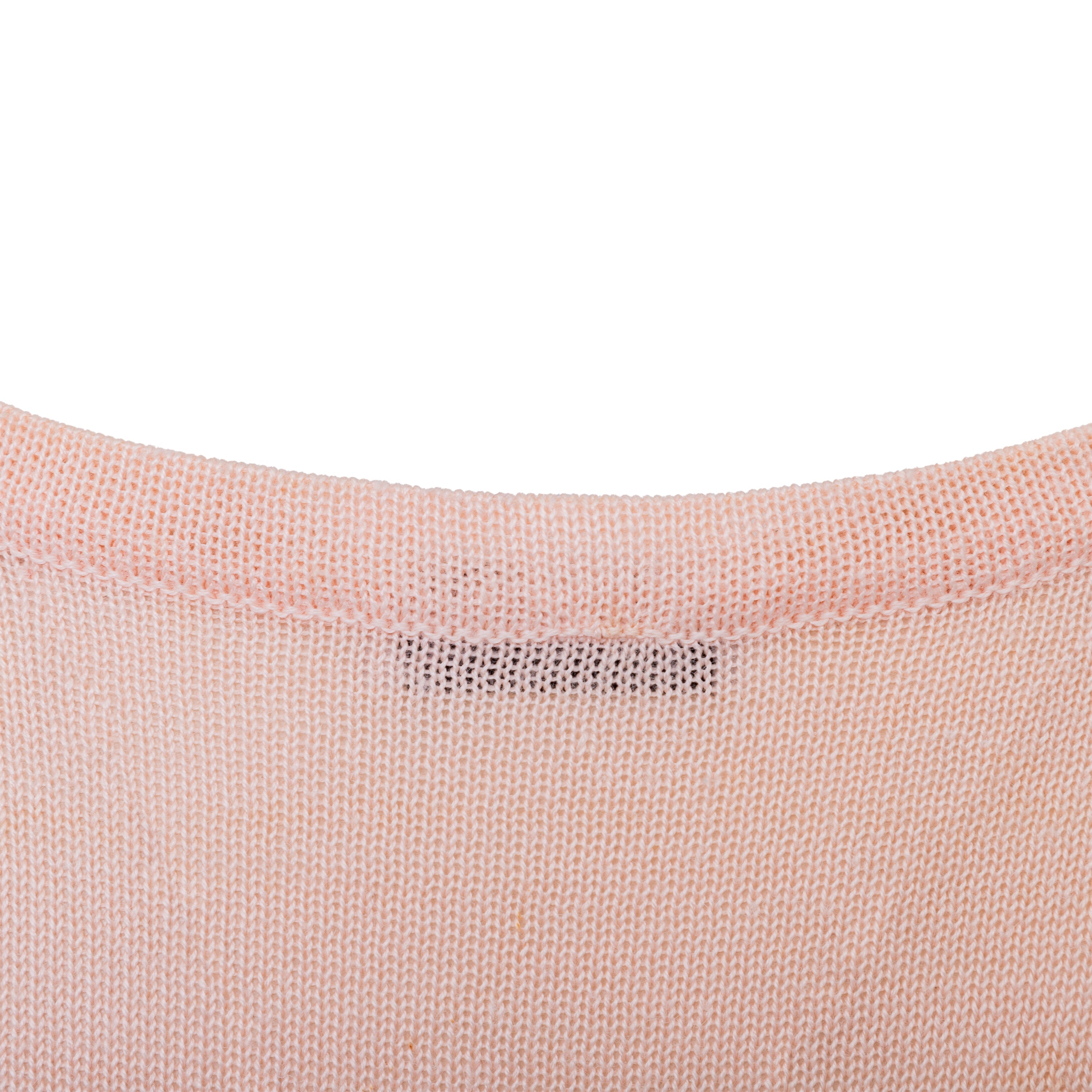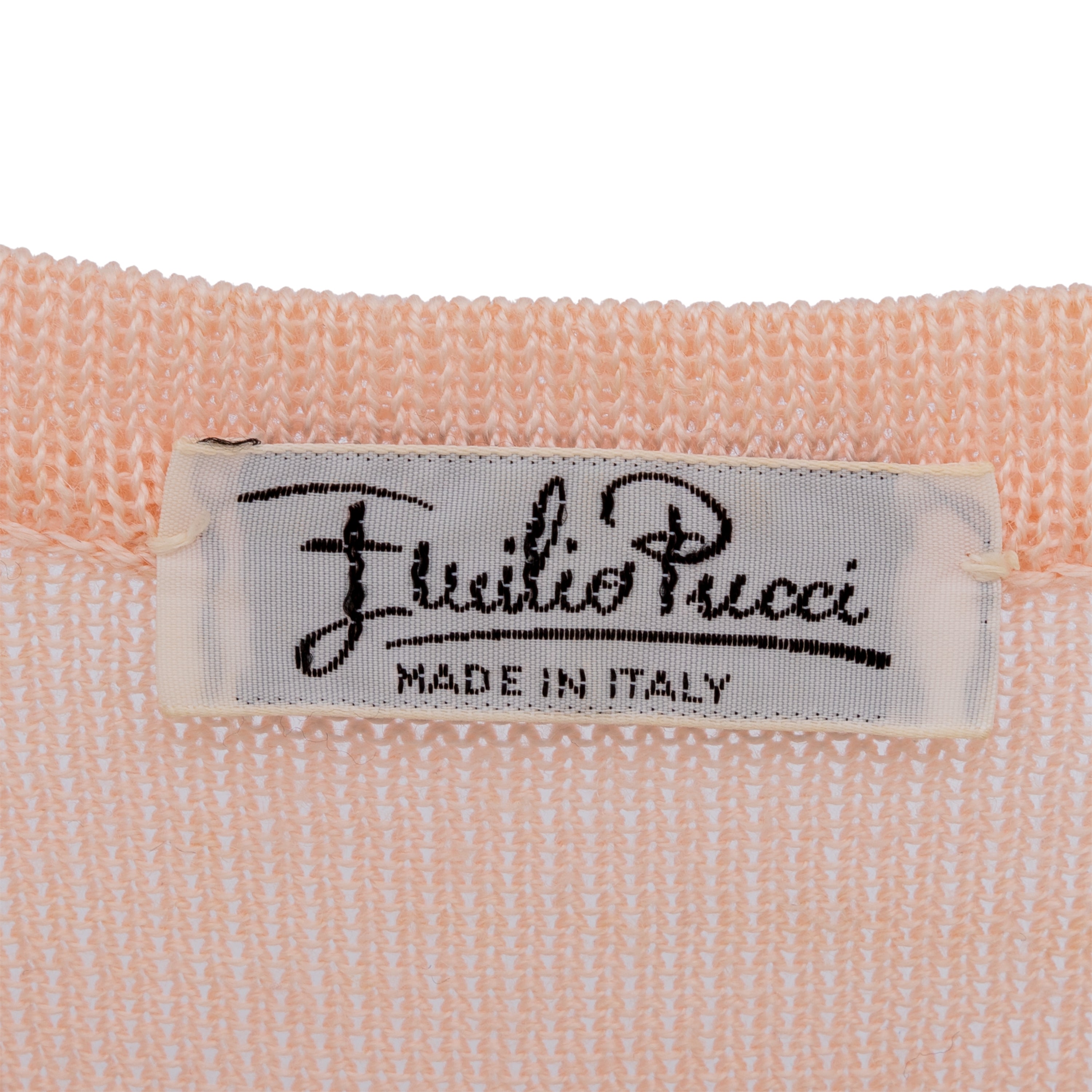 Add a touch of vintage charm with this Emilio Pucci knit top from the 70s. Crafted from Ramie, a natural linen-like fiber, it features a delicate light pink color. The sleeveless boatneck design features a unique perforated pattern on the front and decorative golden buttons on the shoulder.