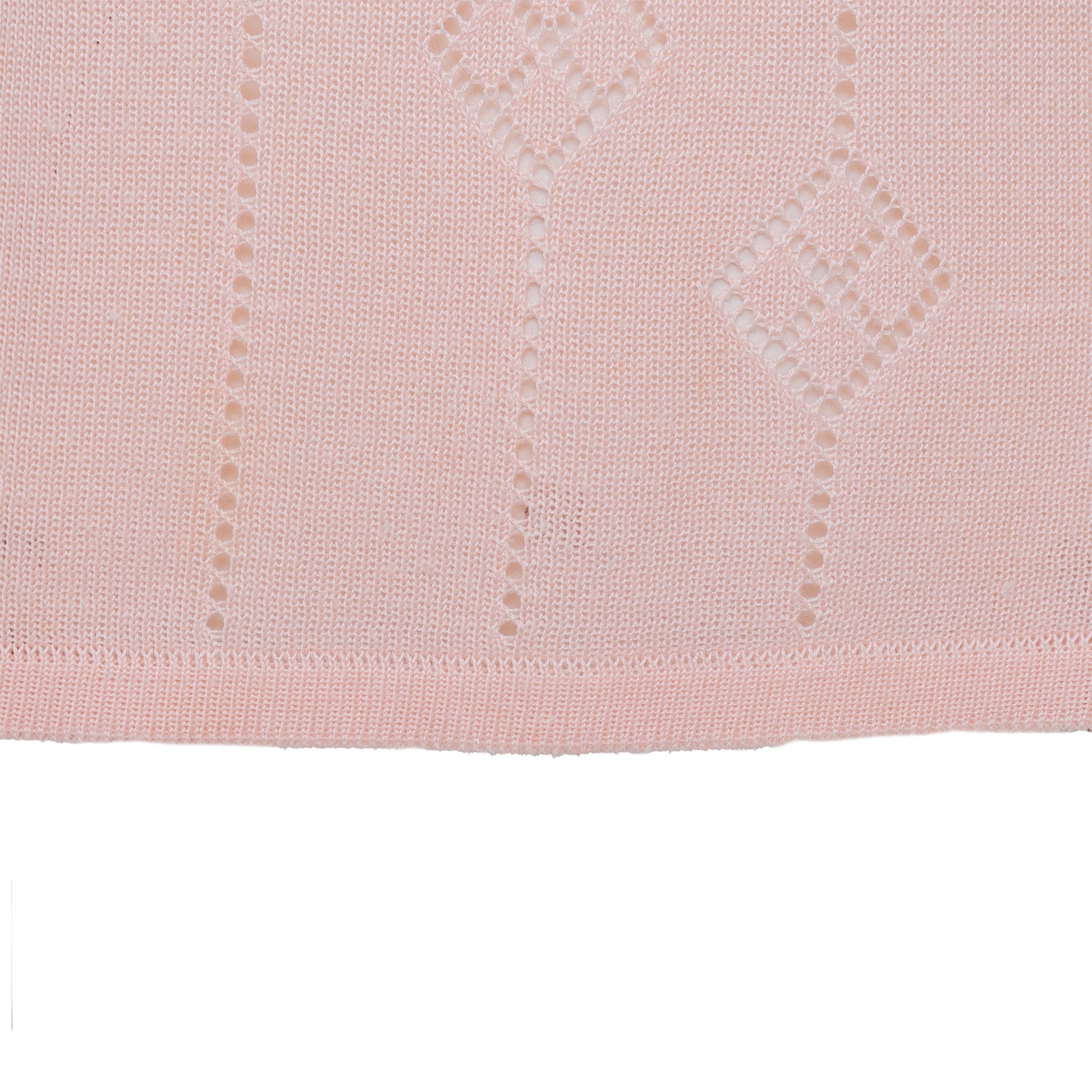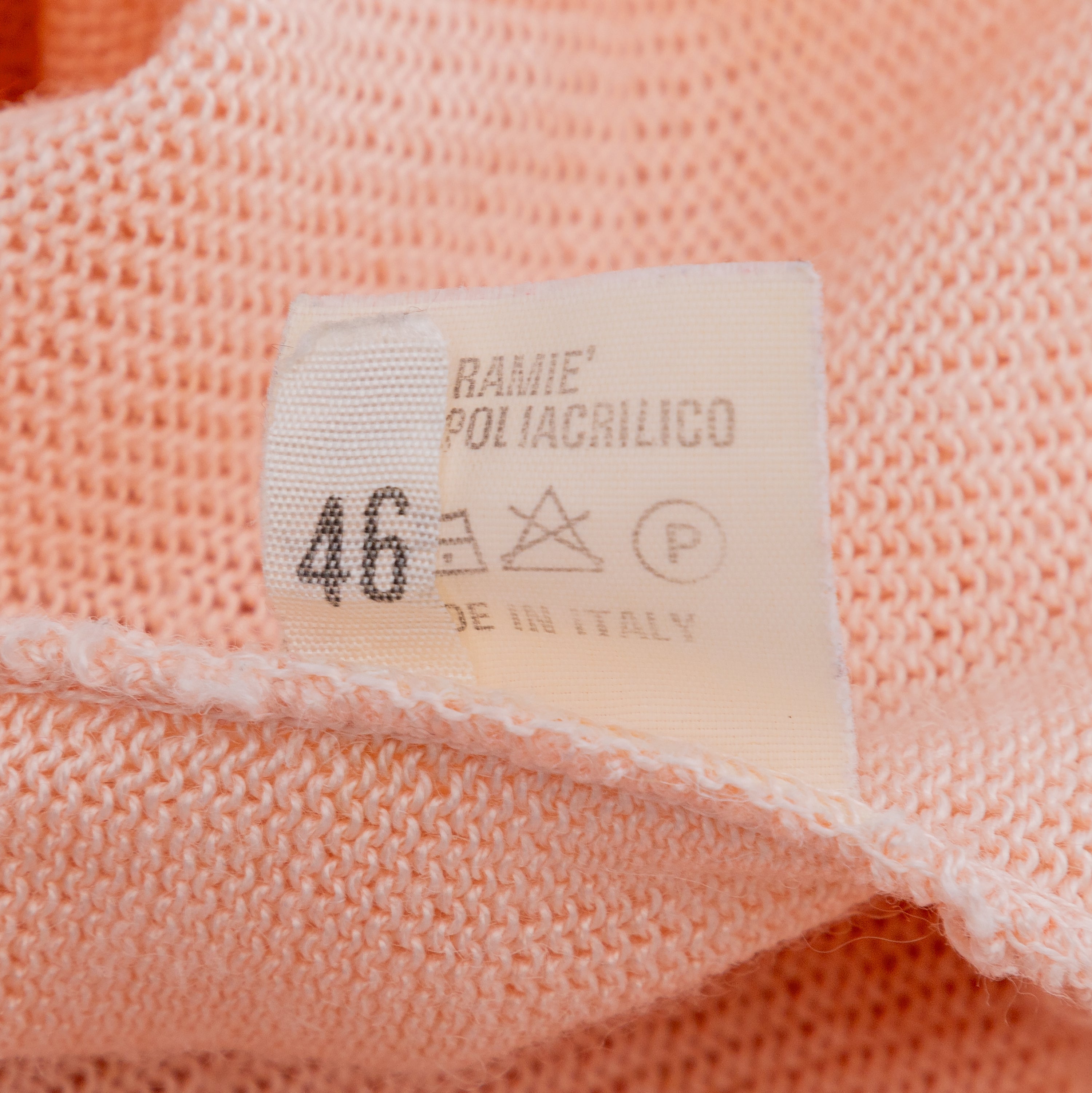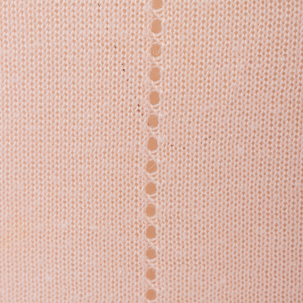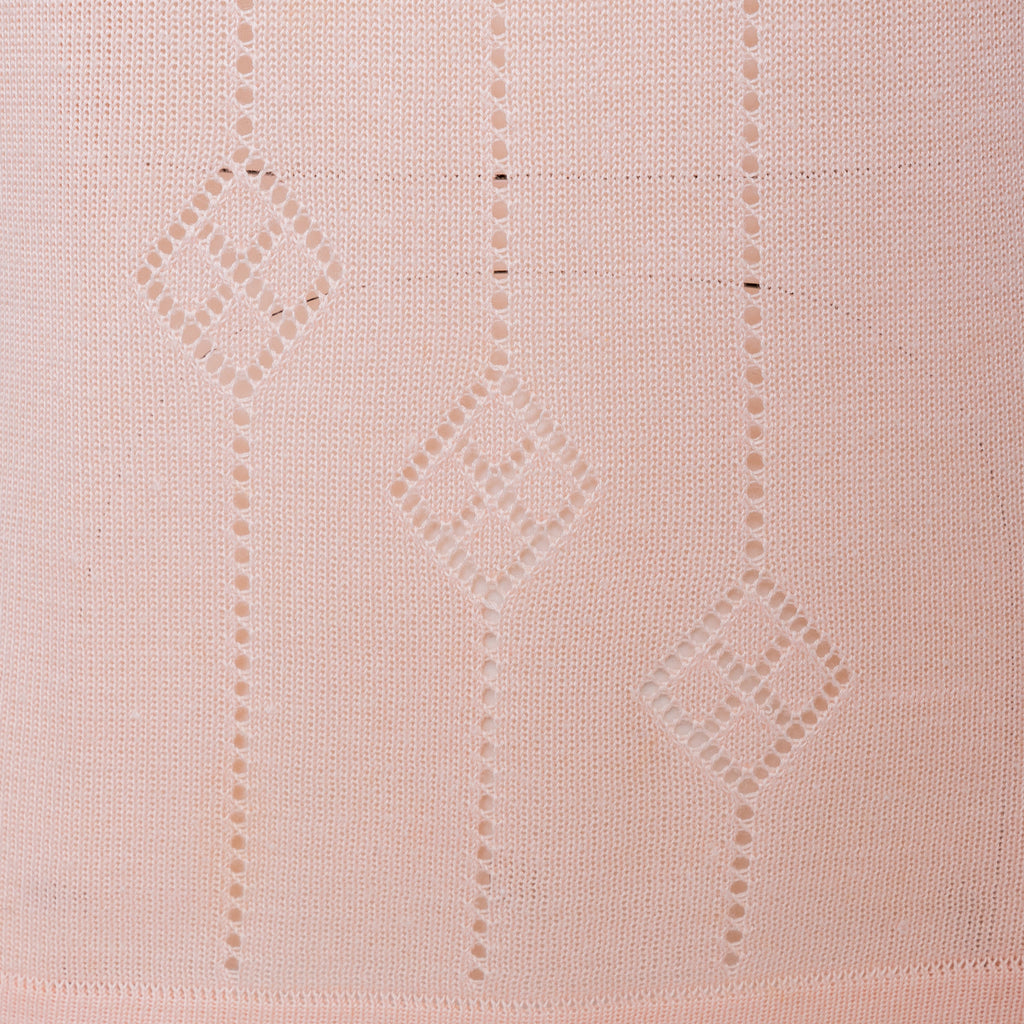 Add a touch of vintage charm with this Emilio Pucci knit top from the 70s. Crafted from Ramie, a natural linen-like fiber, it features a delicate light pink color. The sleeveless boatneck design features a unique perforated pattern on the front and decorative golden buttons on the shoulder.
