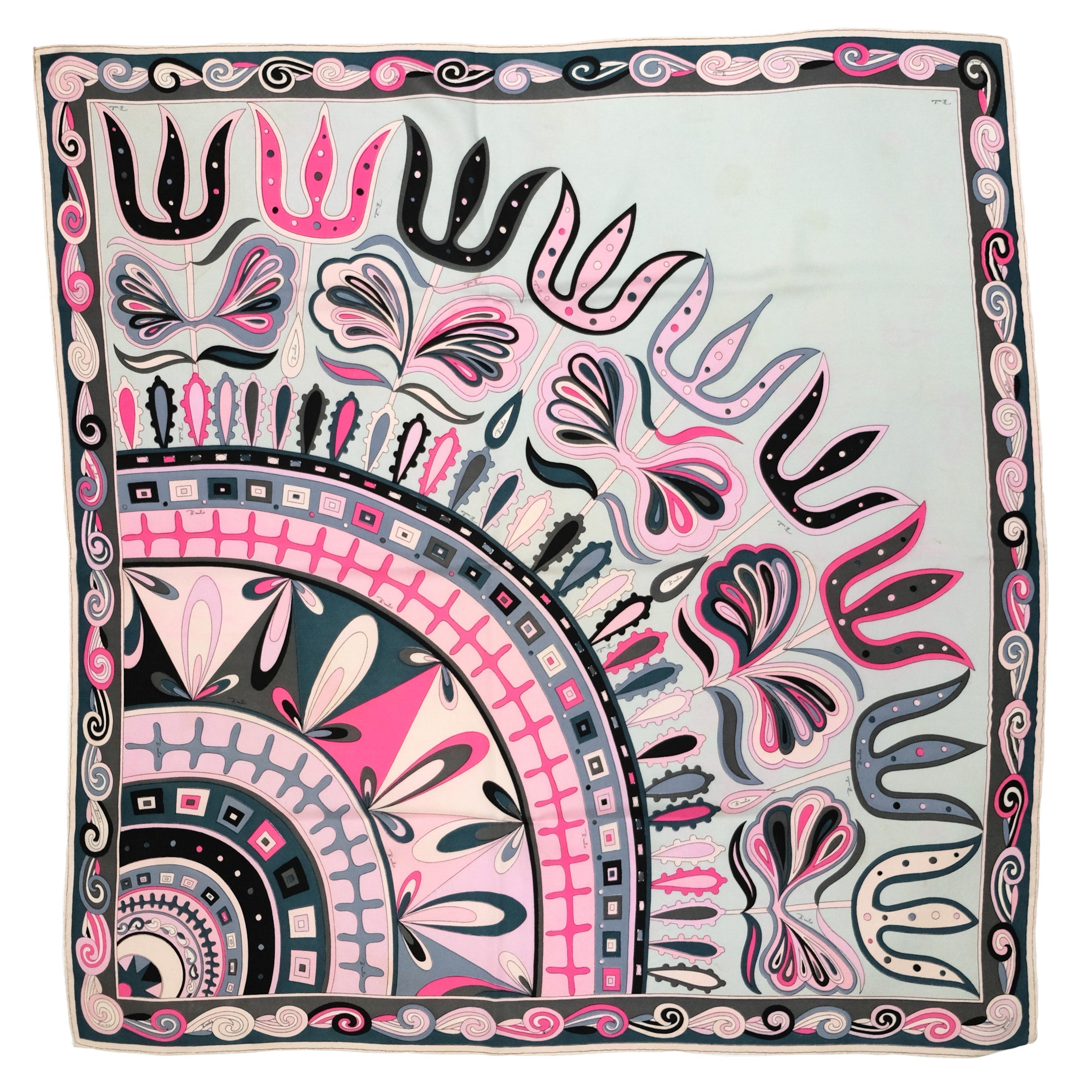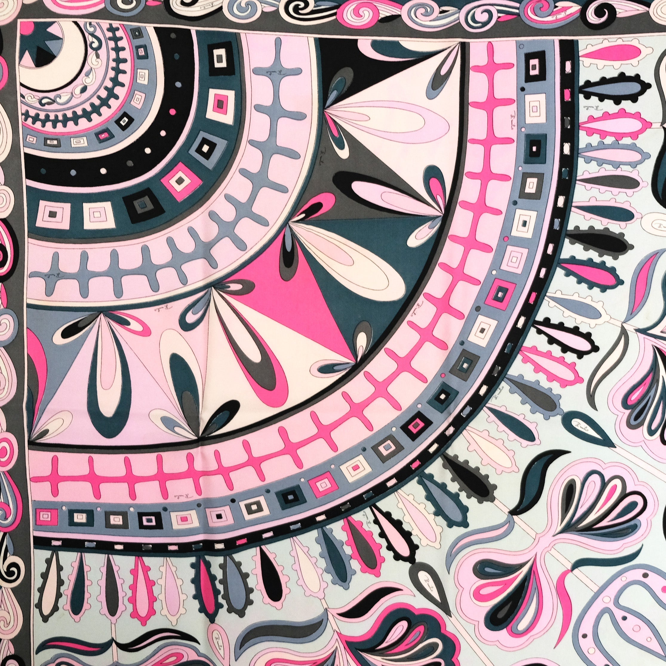 A wonderful 1960s vintage silk square by Emilio Pucci, in soft pale grey with fabulous geometric design in pale pink, fuchsia and black. Hand rolled hems.