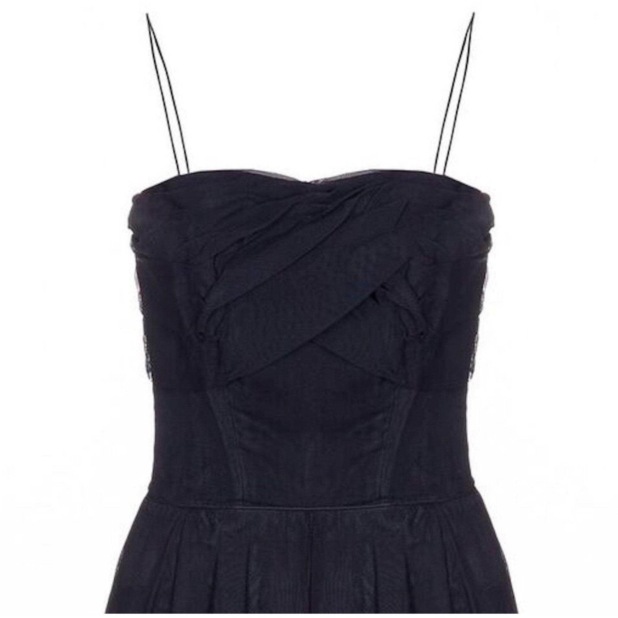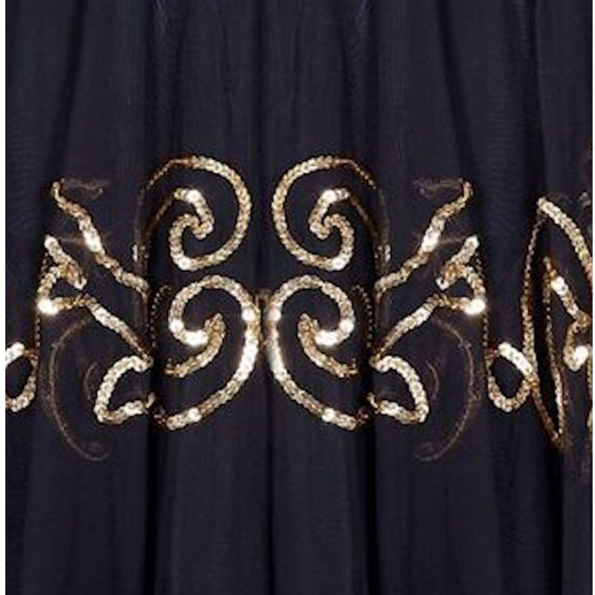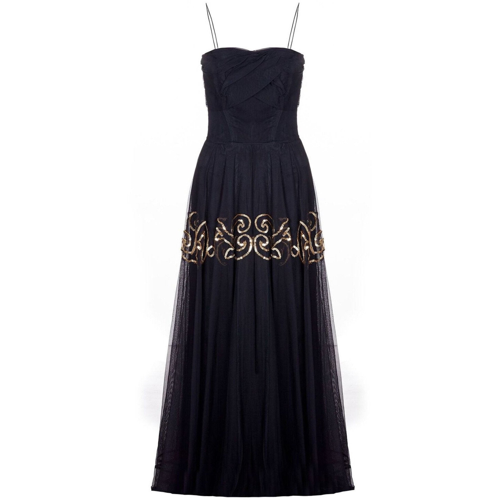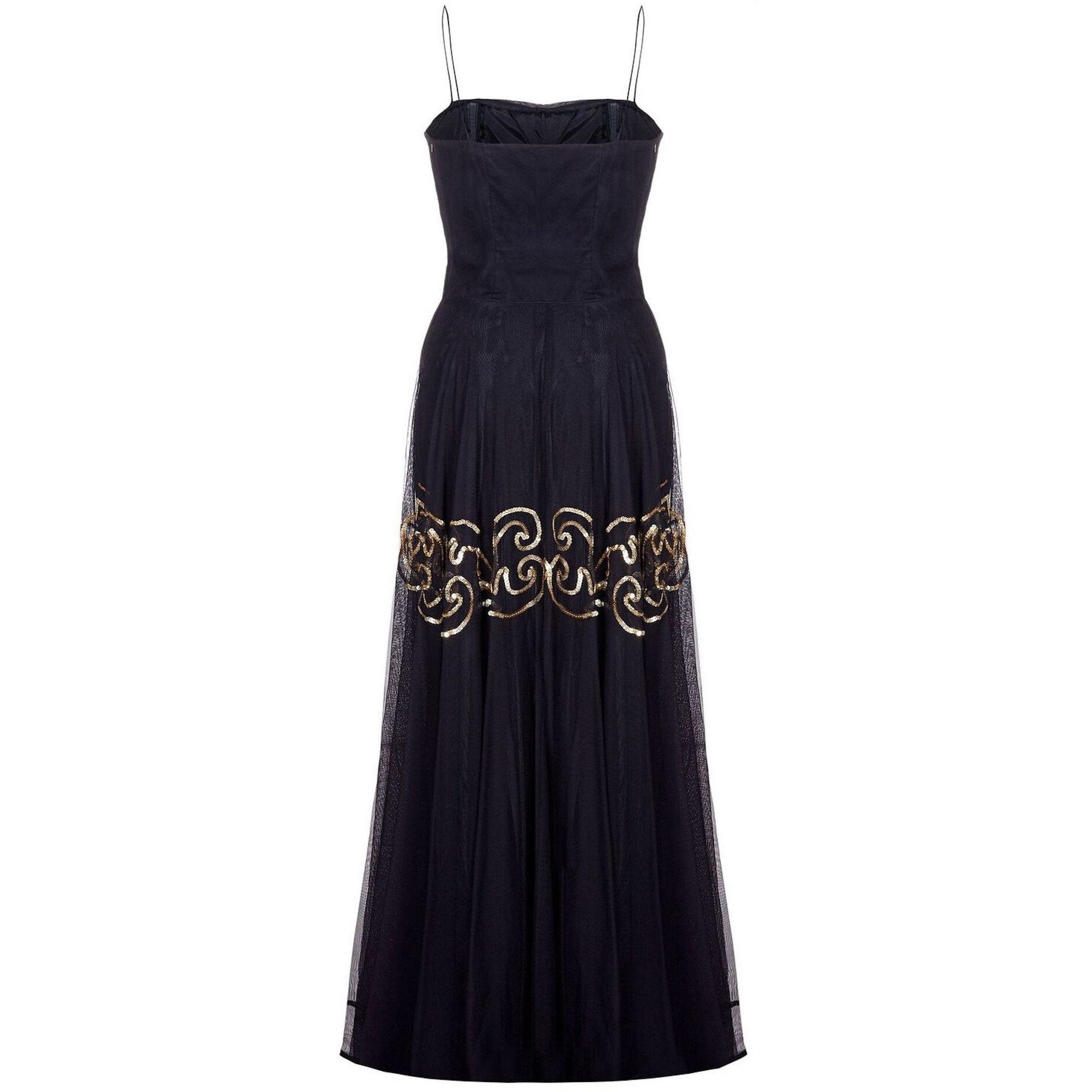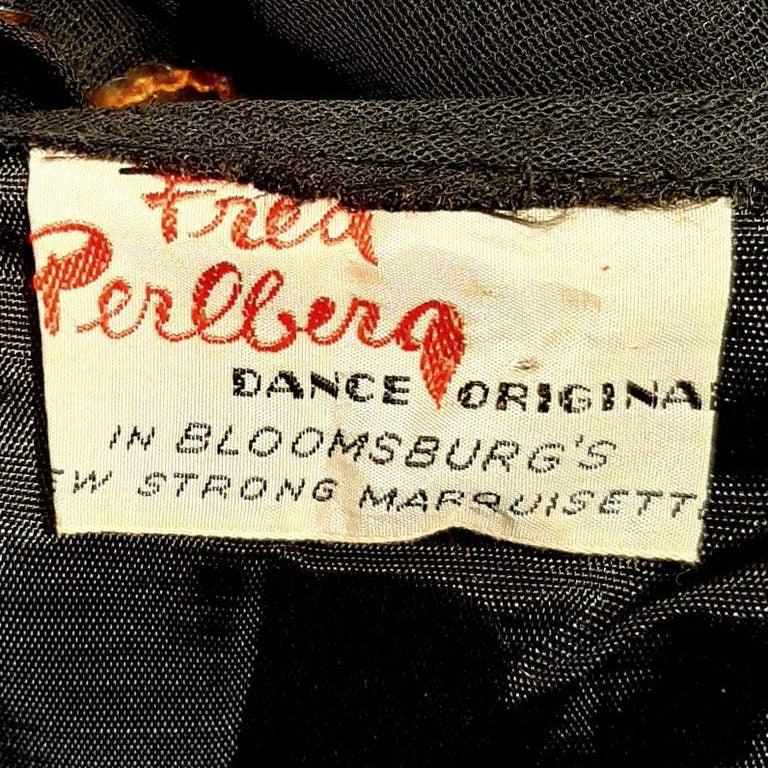 This arresting Fred Perlberg 1940s black chiffon evening dress with matching gloves is designed to turn heads on the dance floor. Part of it's creator's lovingly titled range of party and dance dresses "Dance Originals", the emphasis on movement and show stopping glamour is evident in this piece. Thin spaghetti straps support a dramatic horizontal neckline , which is softened by chiffon arranged attractively over the bust line in a cross-over fashion. The bodice is corseted to accentuate the fairytale waistline, which details a simple piped seam before falling away dramatically into the floor sweeping skirt. The high-waisted skirt is fully lined, with a full-circle chiffon overlay. The fabric features a panel of gold sequin embellishment that comes into play just above the knee and runs parallel to the hem. There is a concealed zip fastening to the left of the bodice with a hook and eye closure. The sheer chiffon gloves that accompany the gown are stylishly designed to cover the back of the hand, leaving the fingers exposed. They fold over at the wrist in a pirate style cuff, embellished with a gold sequin trim. The dress is in wonderful condition with no notable flaws. A generous length and would suit a taller silhouette; best fit for a US size 2, UK size 6.