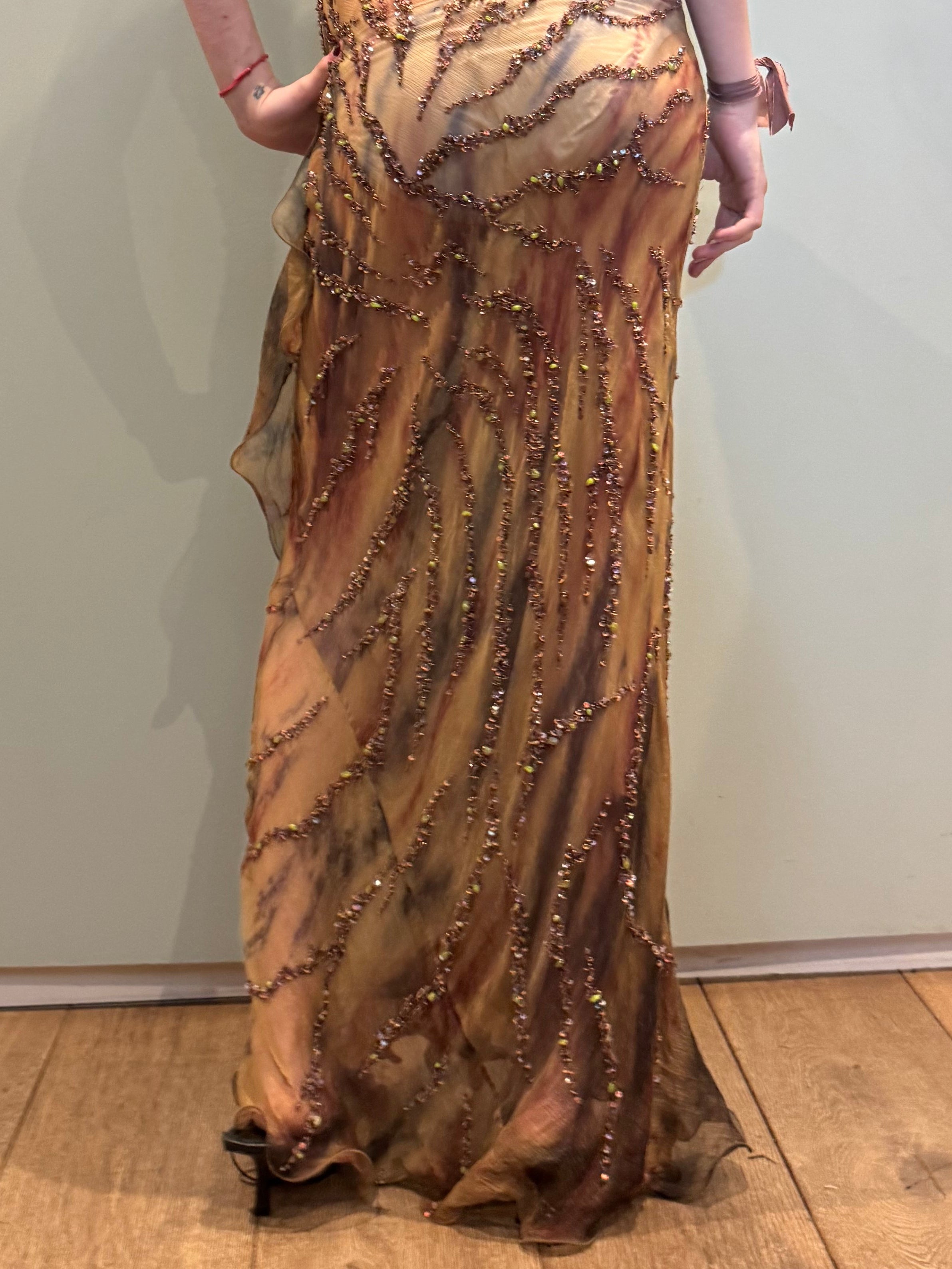 Unleash your wild side with this vintage animal print beaded long Galliano-esque dress. This flattering design features a body hugging silhouette and a front V-neck line, accented by a side frill. The low back adds a touch of sexiness to this cocktail dress. Made of silk chiffon, fully lined and adorned with beads, it's the perfect choice for any special occasion.