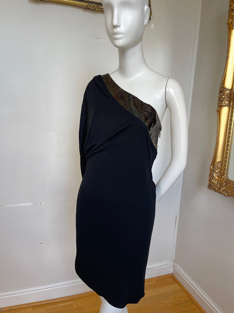 Gucci 2009 One-Shoulder Patent Leather and Crepe Disco Dress, meticulously crafted under the creative direction of Frida Gianni and prominently featured on the runway and in 2009 advertising campaigns. This stunning dress is offered in excellent condition, size 40.