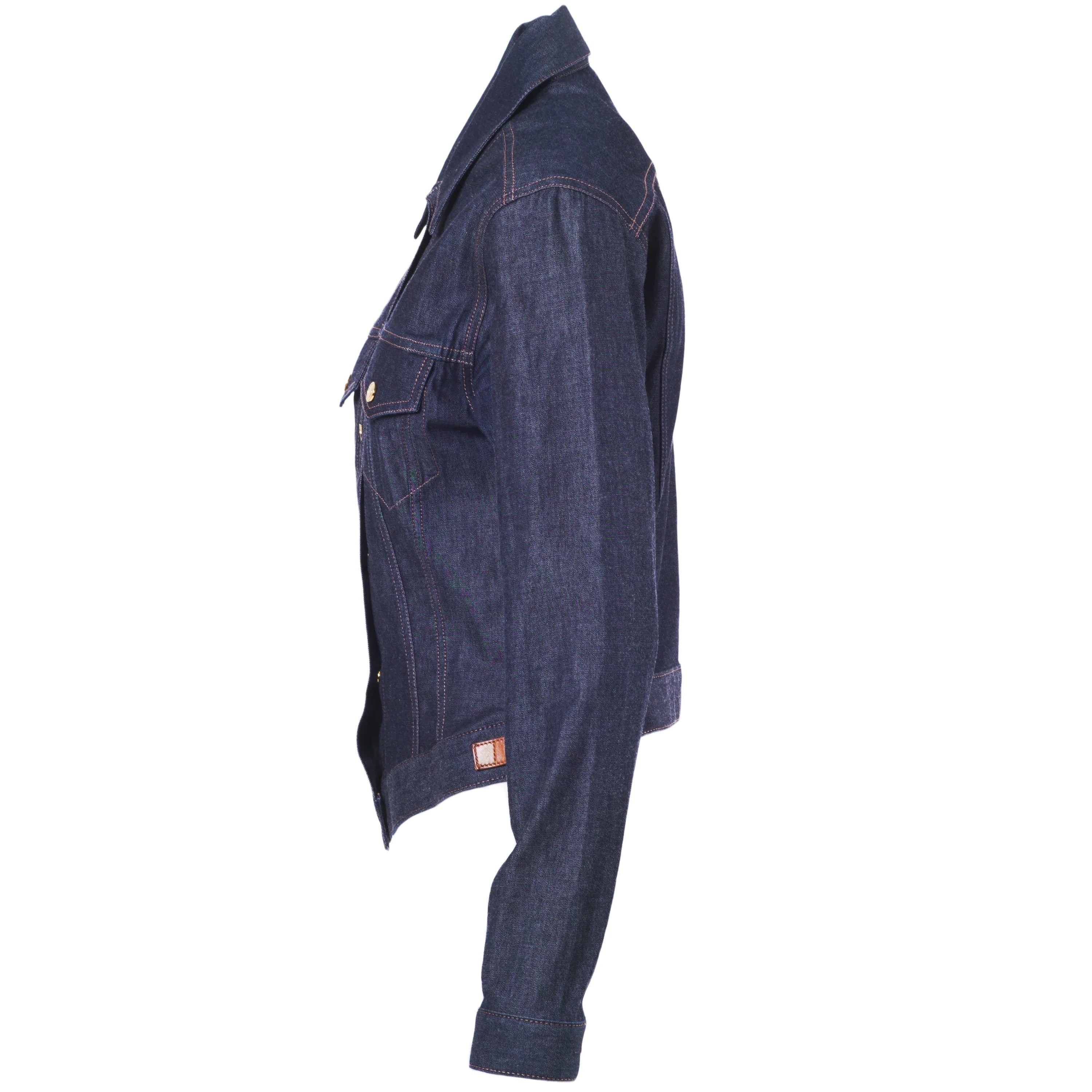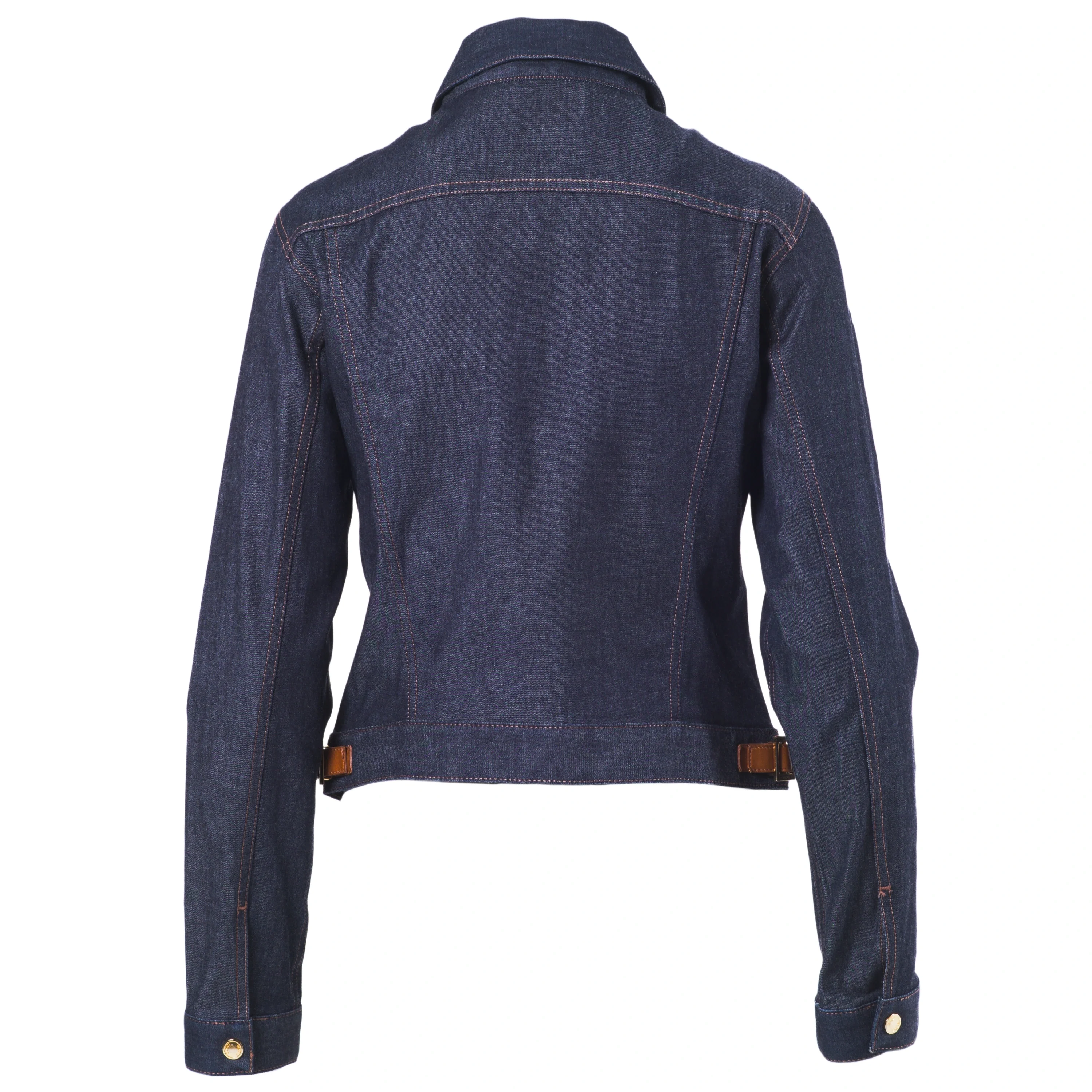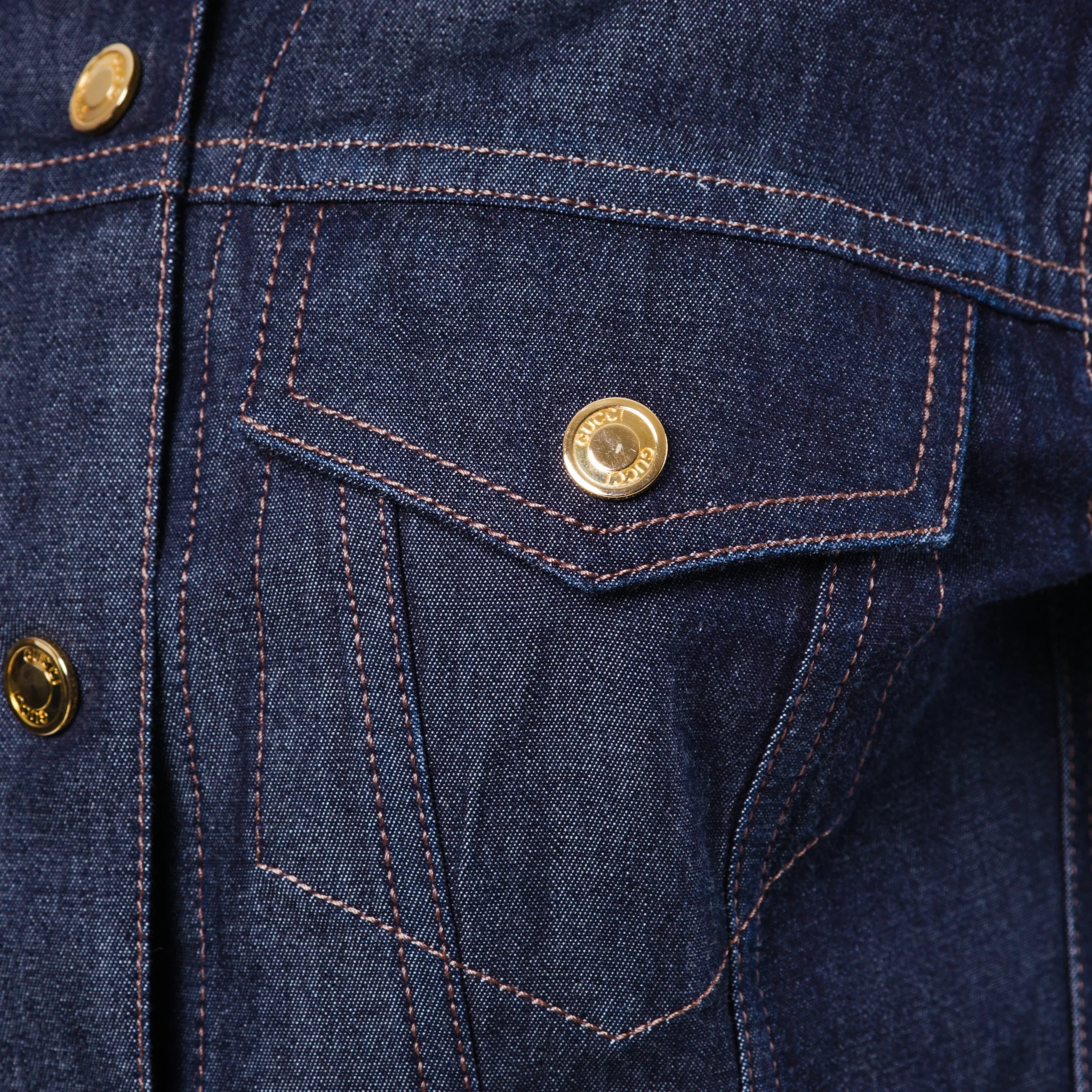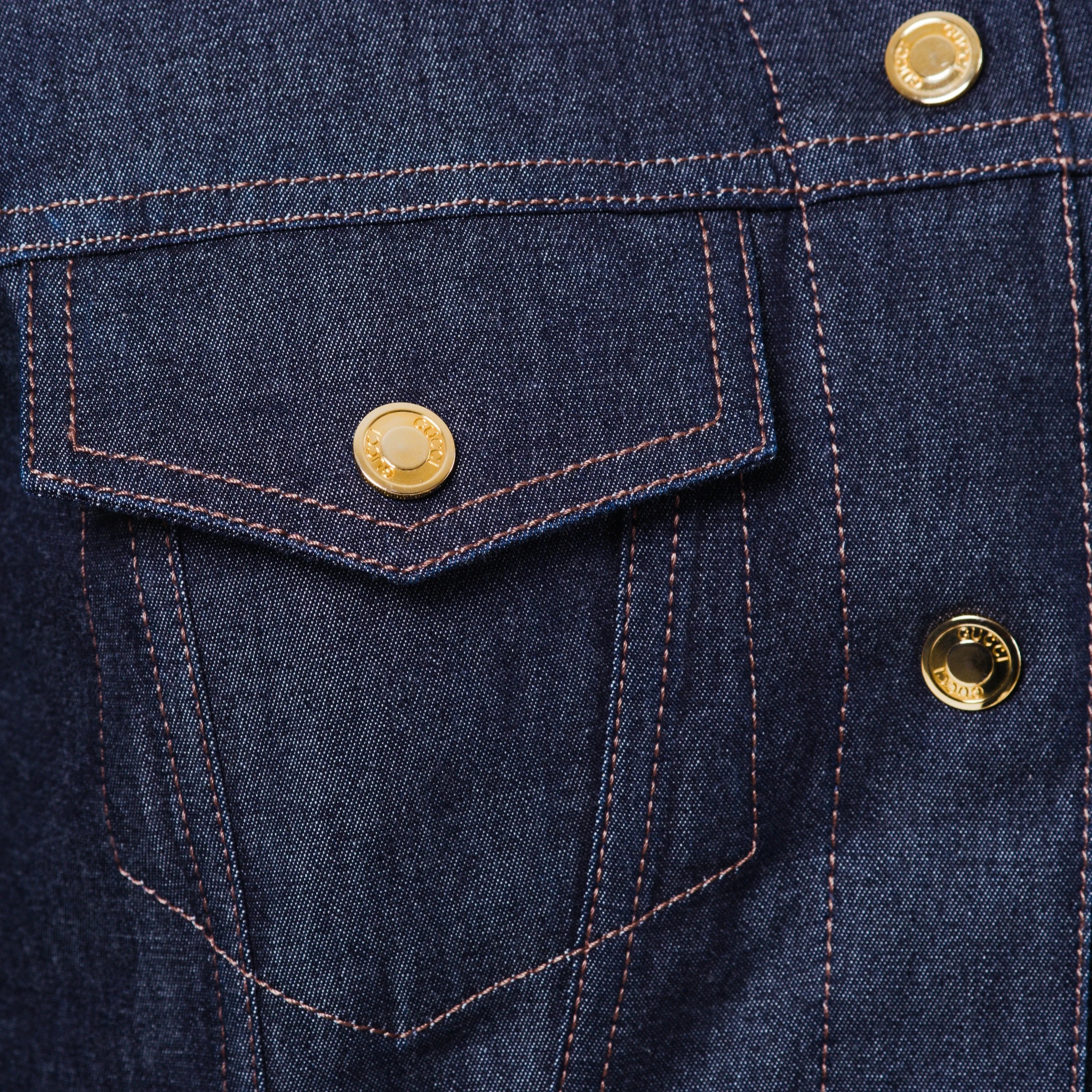 Rare denim jacket designed by Tom Ford for Gucci and presented in Milan for Spring/Summer 1999. Crafted in dark indigo stretch denim with a sculpted, fitted silhouette, it features gold-tone Gucci-stamped buttons, two front flap pockets, and signature leather side fasteners with gold-plated logo buckles. An iconic and highly collectible piece from Gucci’s most influential era.