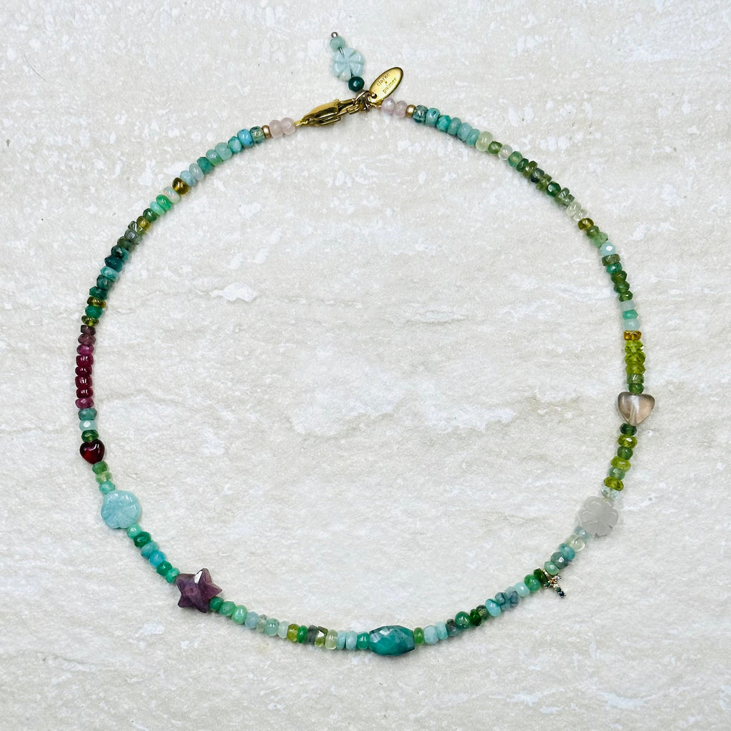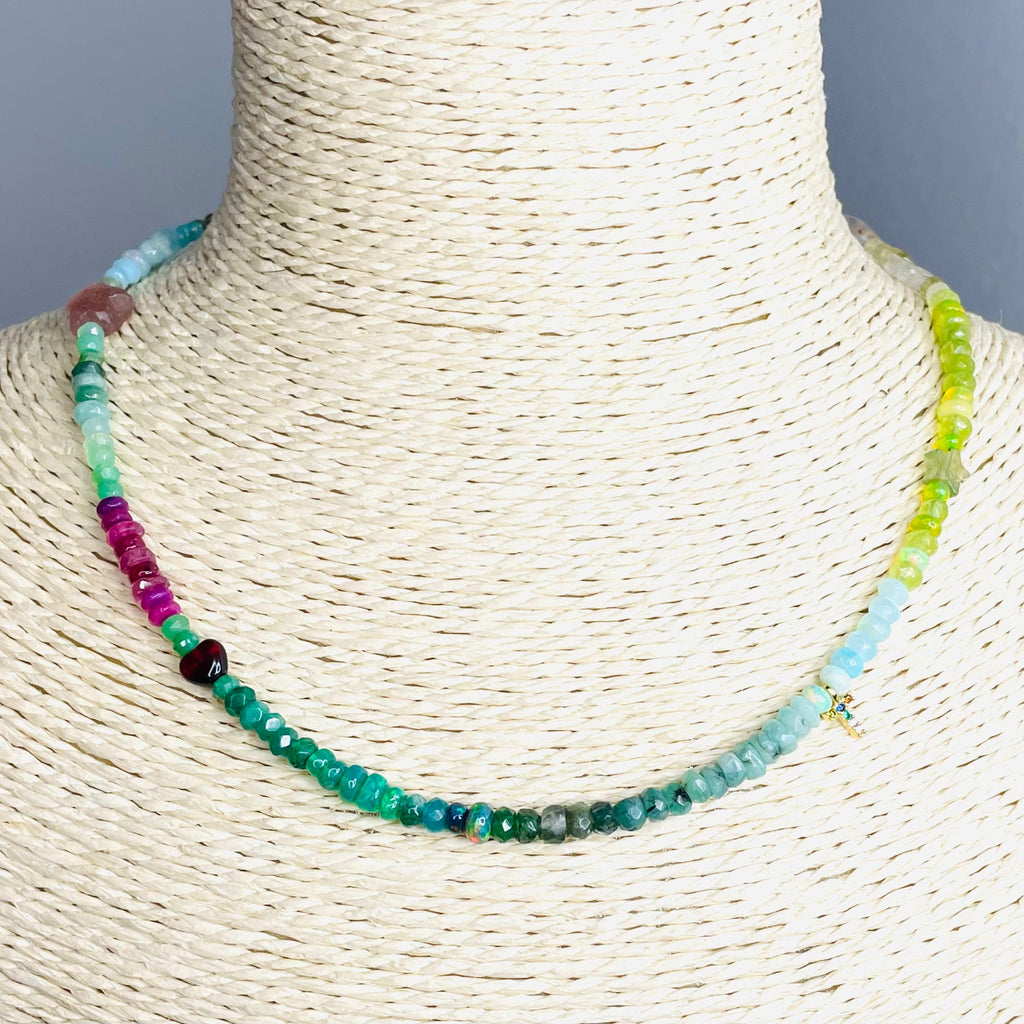 Our Heart of the World necklace is a homage to the beauty of Mother Nature. It blends ombré  shades of Ethiopian opal, emerald, chrysoprase, moss aquamarine, ruby, peridot, adventurine and strawberry Quartz. These beautiful sustainably sourced green and pink hued stones can help support your heart chakra.