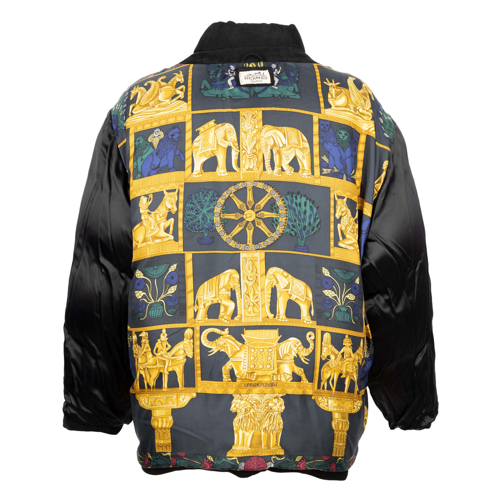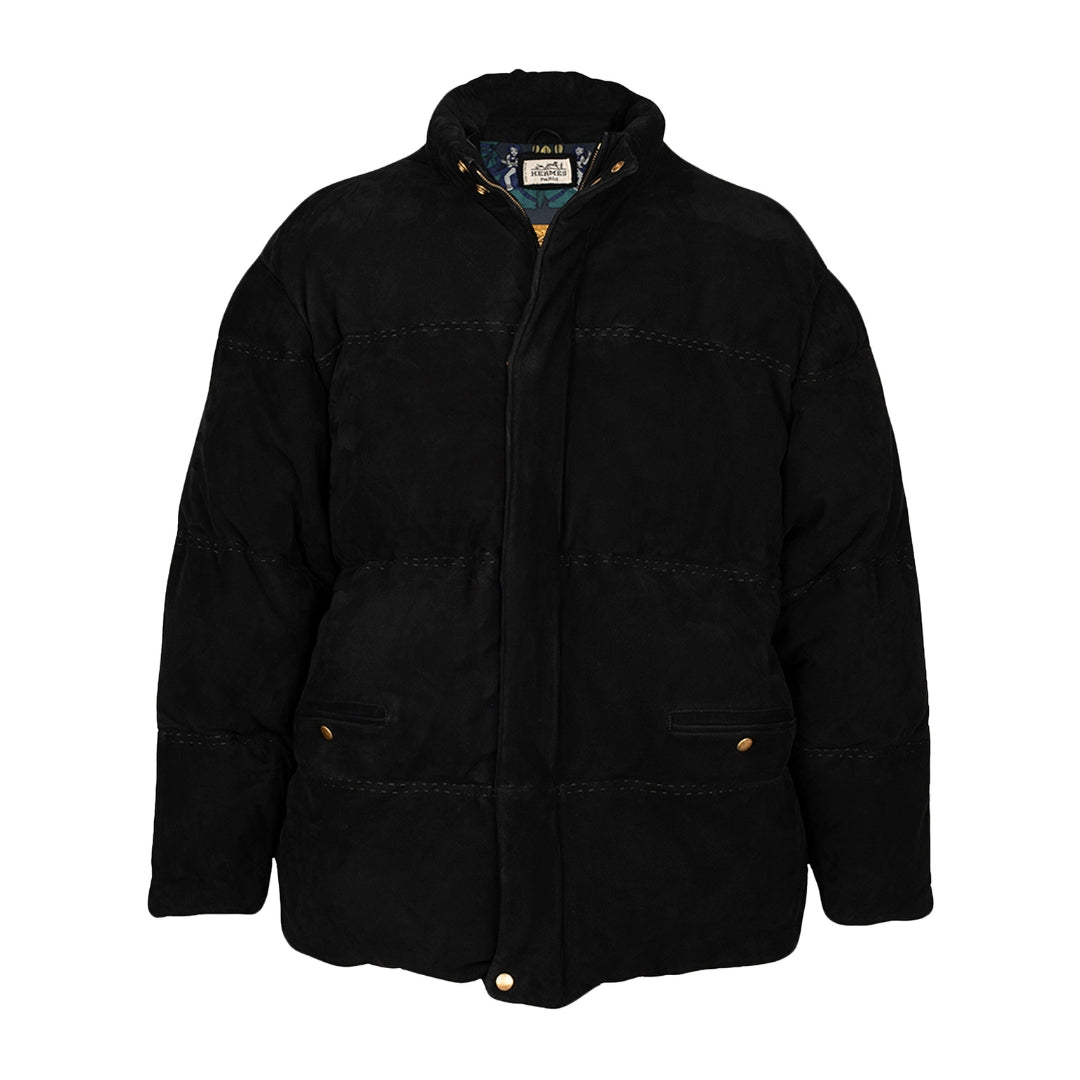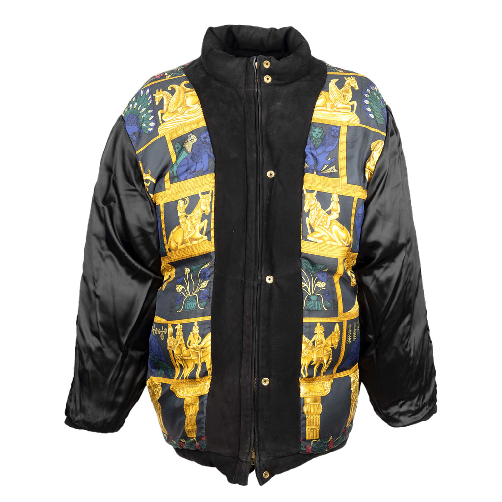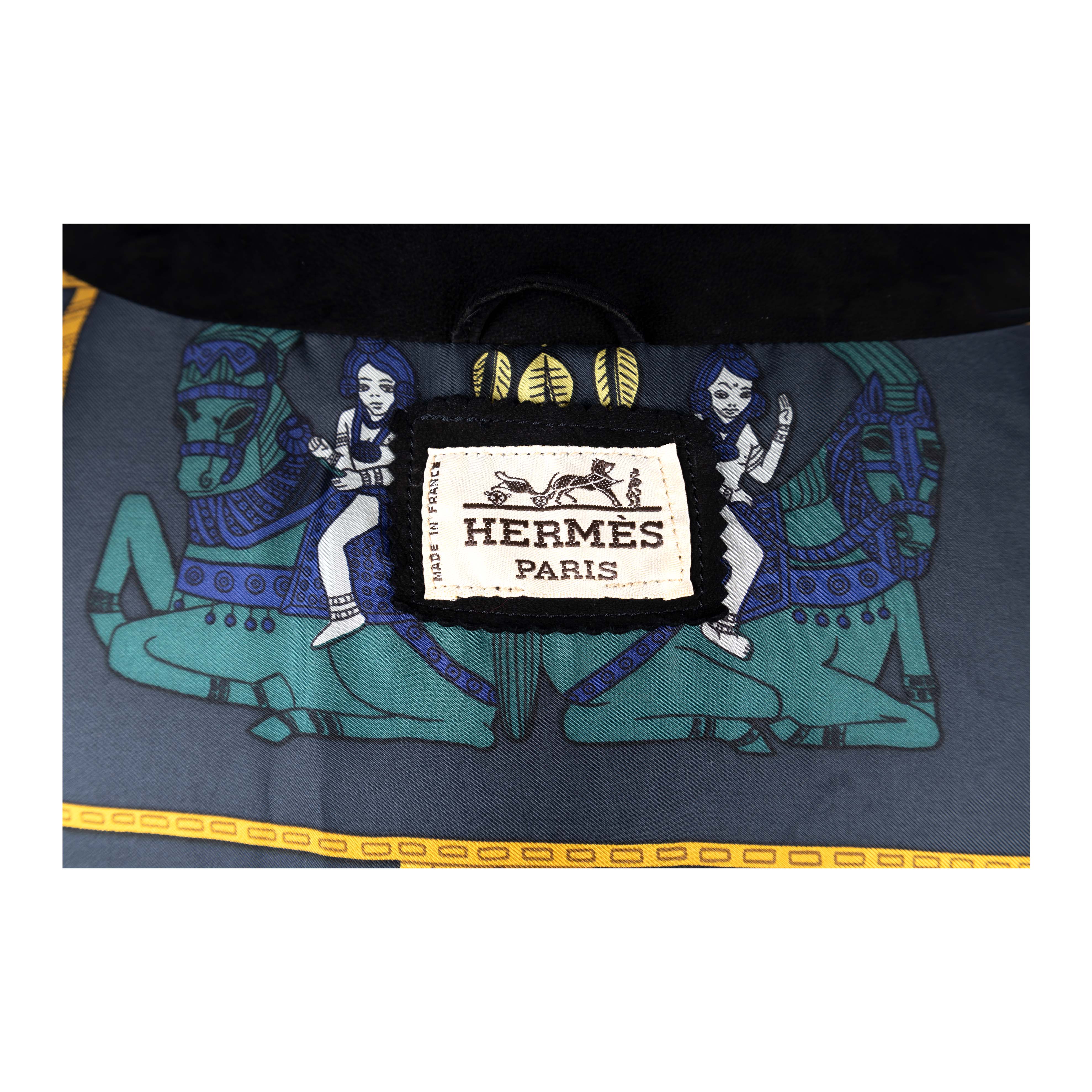 A standout piece from Hermès' 1990s collection, this black suede bomber jacket is an iconic example of luxury craftsmanship and timeless design. The jacket features rich, premium suede, complemented by intricate band quilting for a structured silhouette. Inside, an exquisite printed silk lining adds a sophisticated and unexpected flair. With long sleeves and a classic button fastening, this jacket exudes effortless elegance. Perfect for a curated men's heritage wardrobe, it represents the blend of understated style and refined craftsmanship that Hermès is known for.
