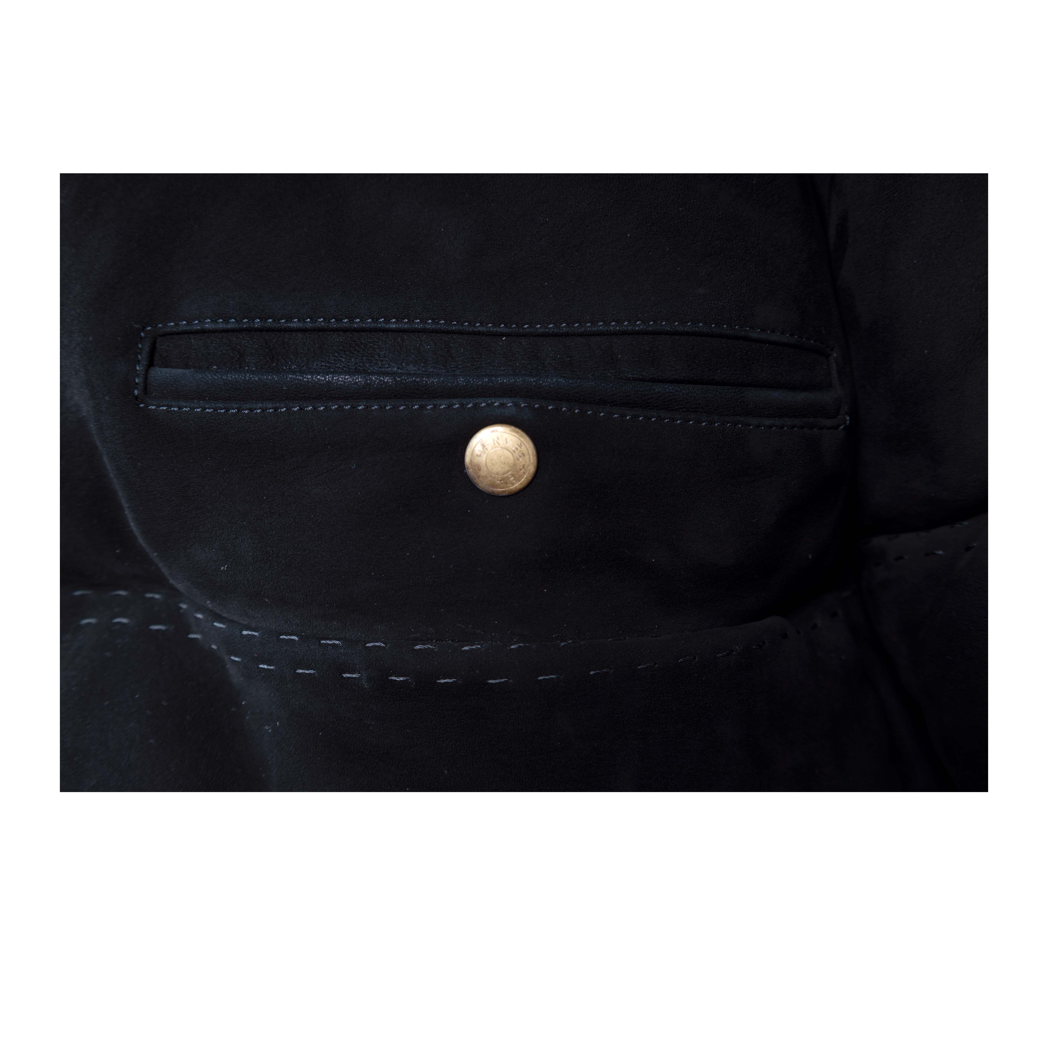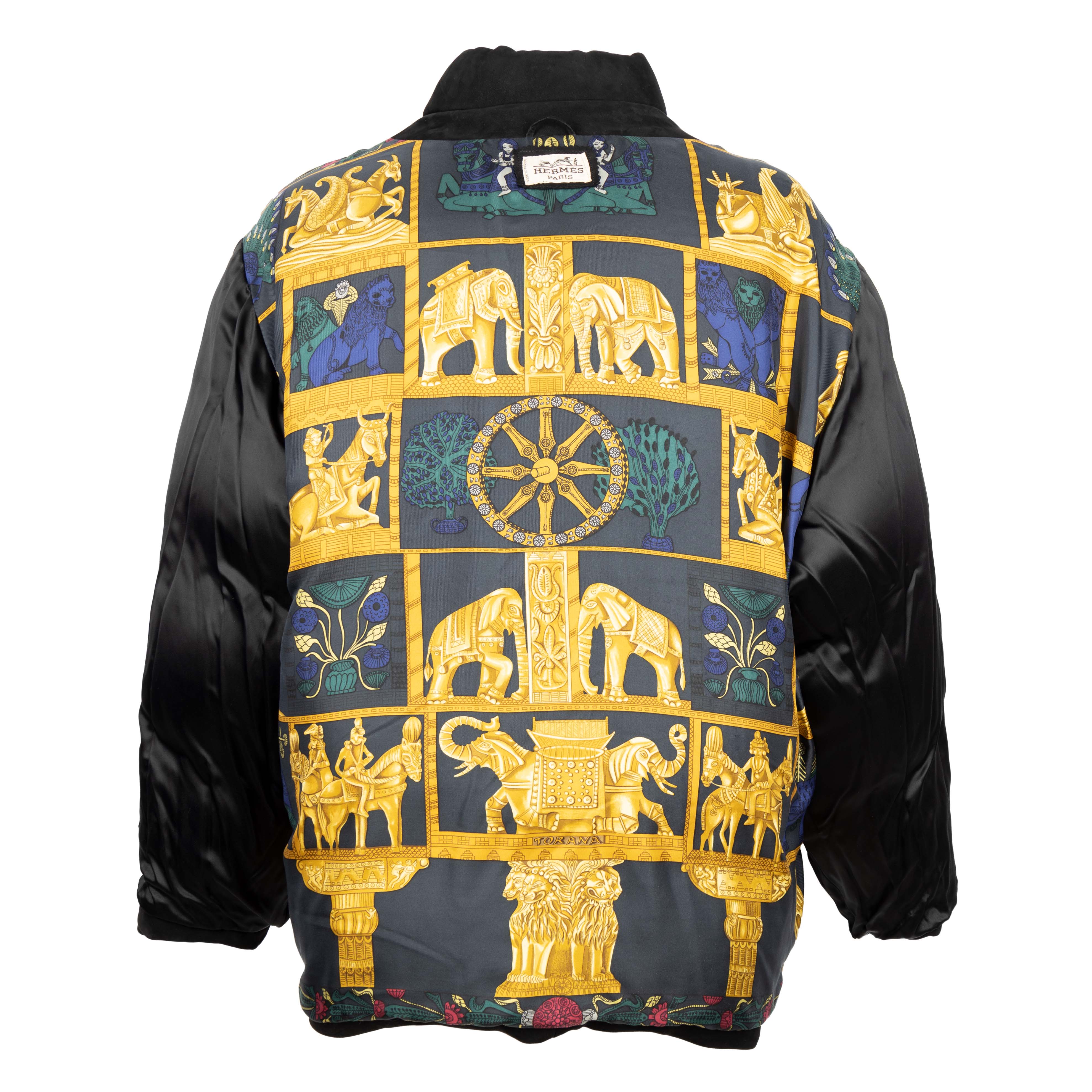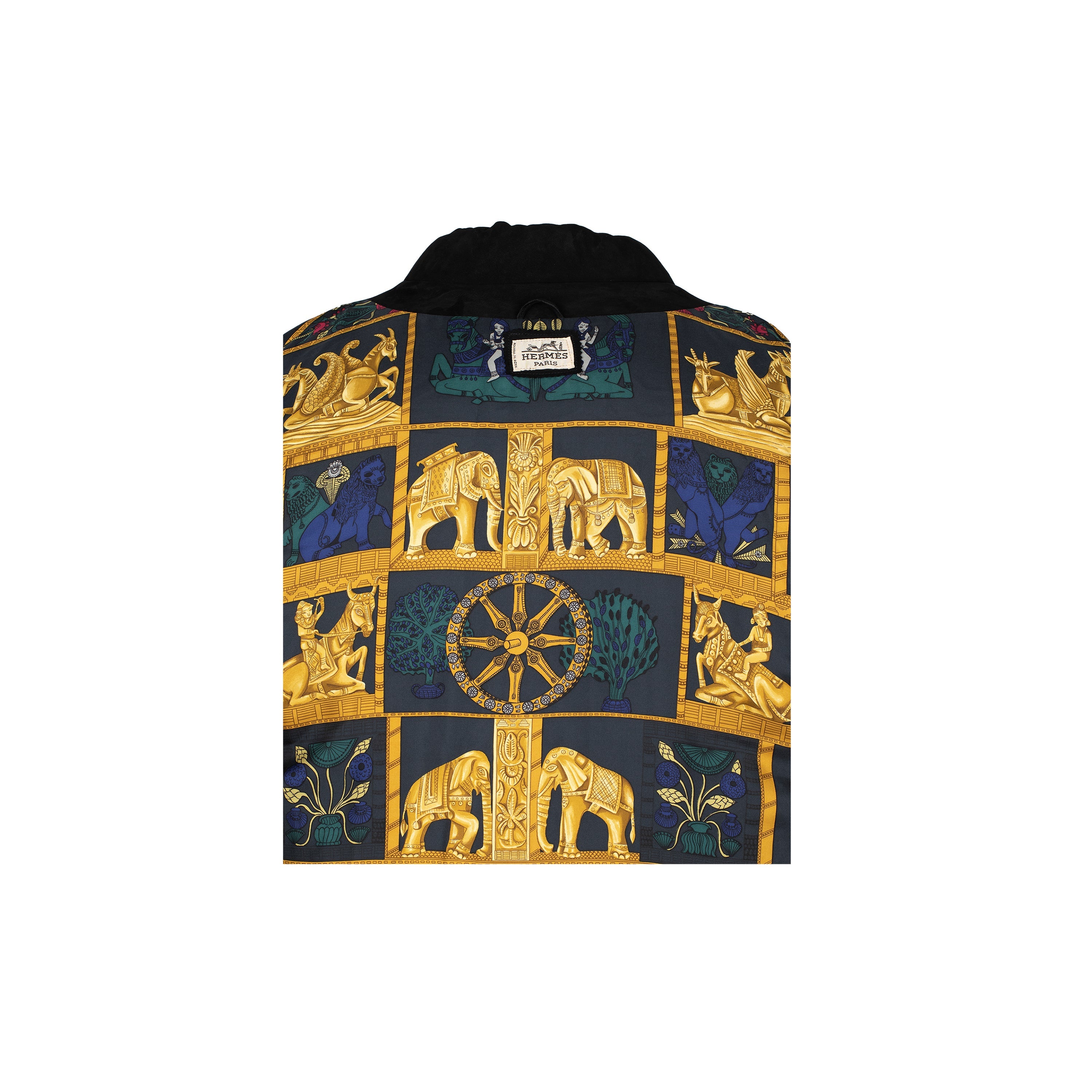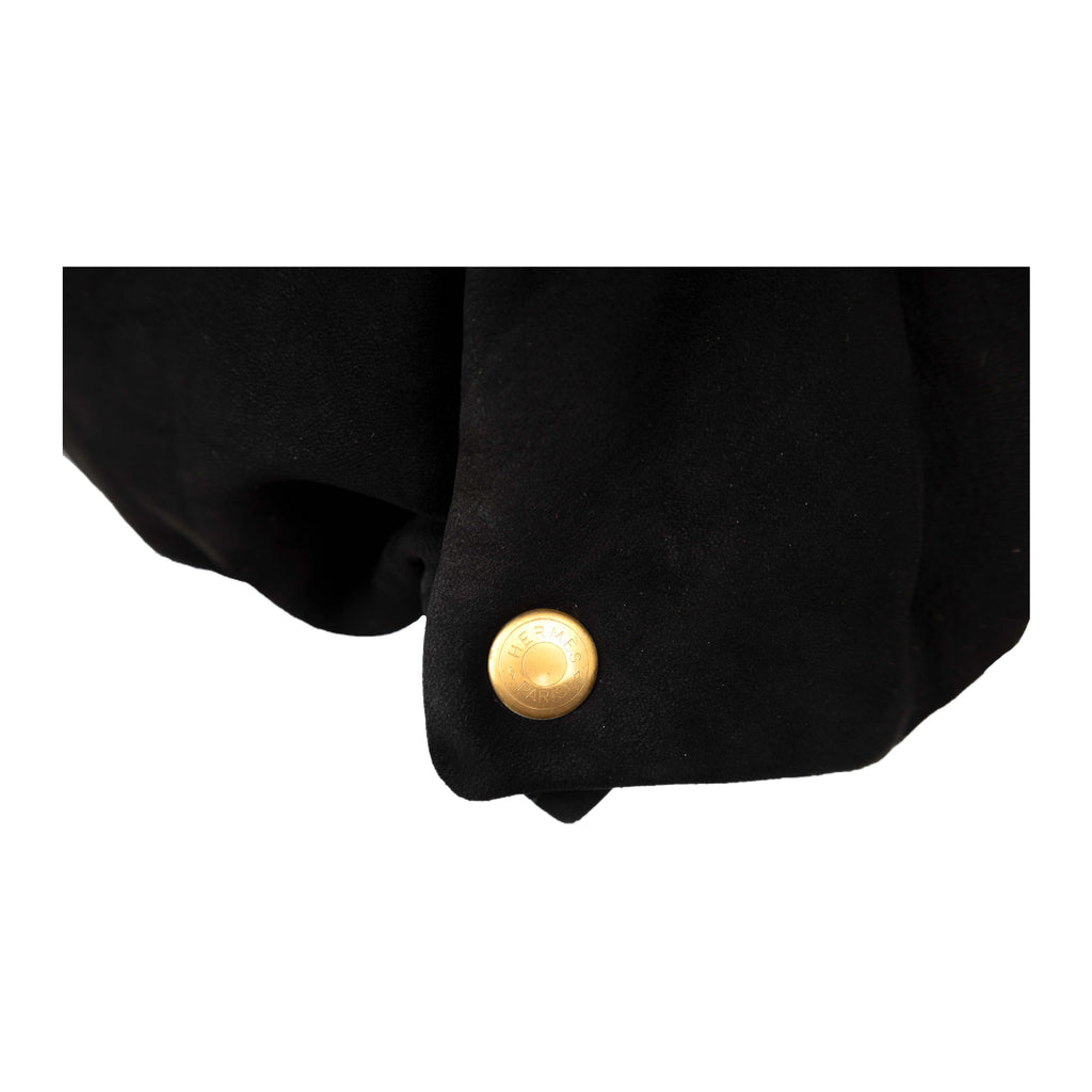 A standout piece from Hermès' 1990s collection, this black suede bomber jacket is an iconic example of luxury craftsmanship and timeless design. The jacket features rich, premium suede, complemented by intricate band quilting for a structured silhouette. Inside, an exquisite printed silk lining adds a sophisticated and unexpected flair. With long sleeves and a classic button fastening, this jacket exudes effortless elegance. Perfect for a curated men's heritage wardrobe, it represents the blend of understated style and refined craftsmanship that Hermès is known for.