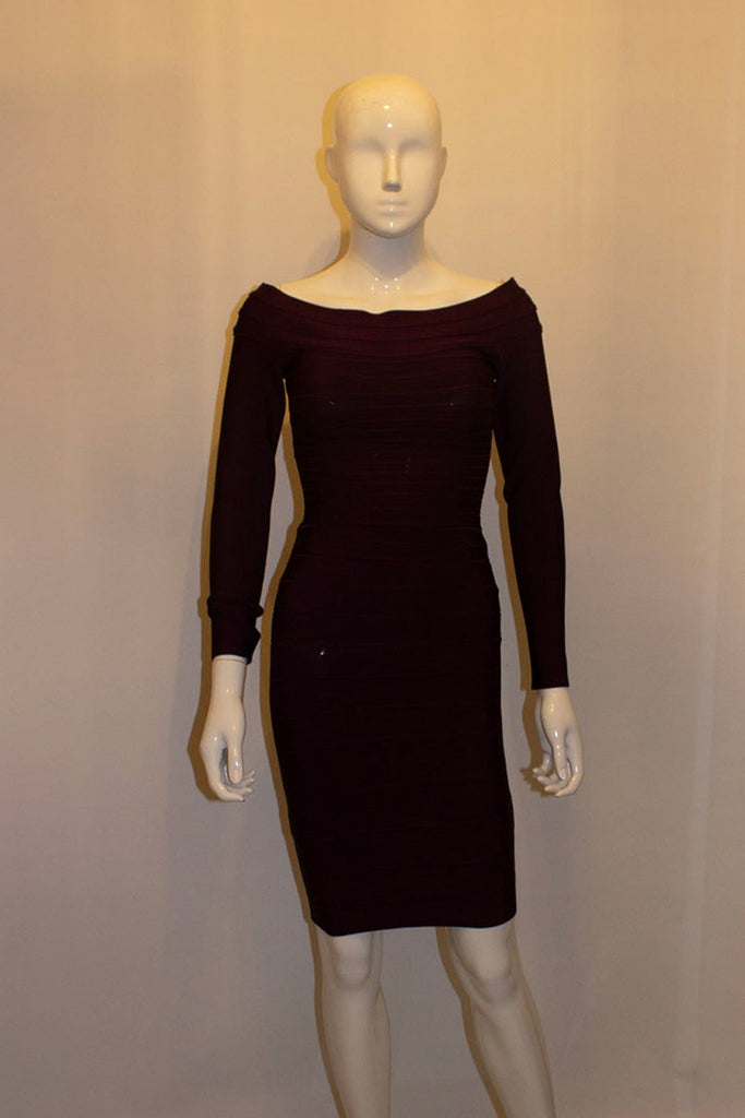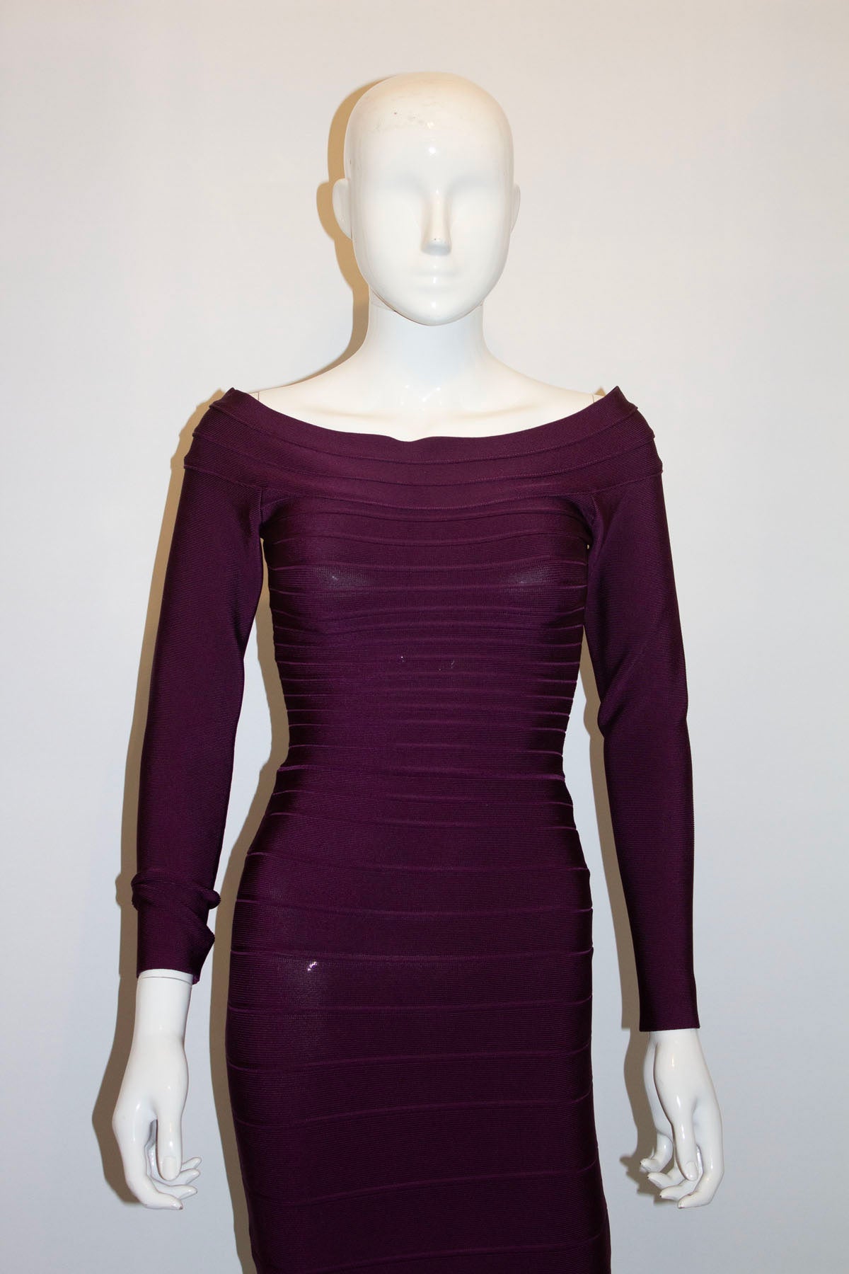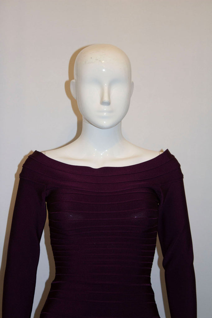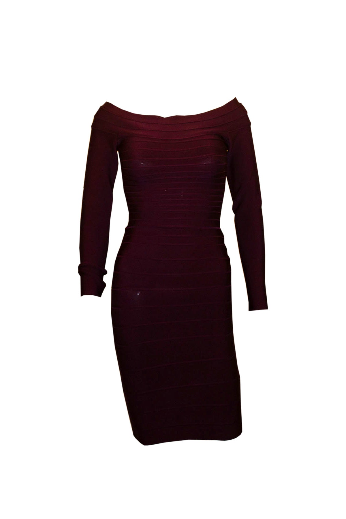 A chic dress from Herve Leger in a wonderful aubergine colour, dress number 00248958. The dress has a boat neckline, central back zip and long sleeves.