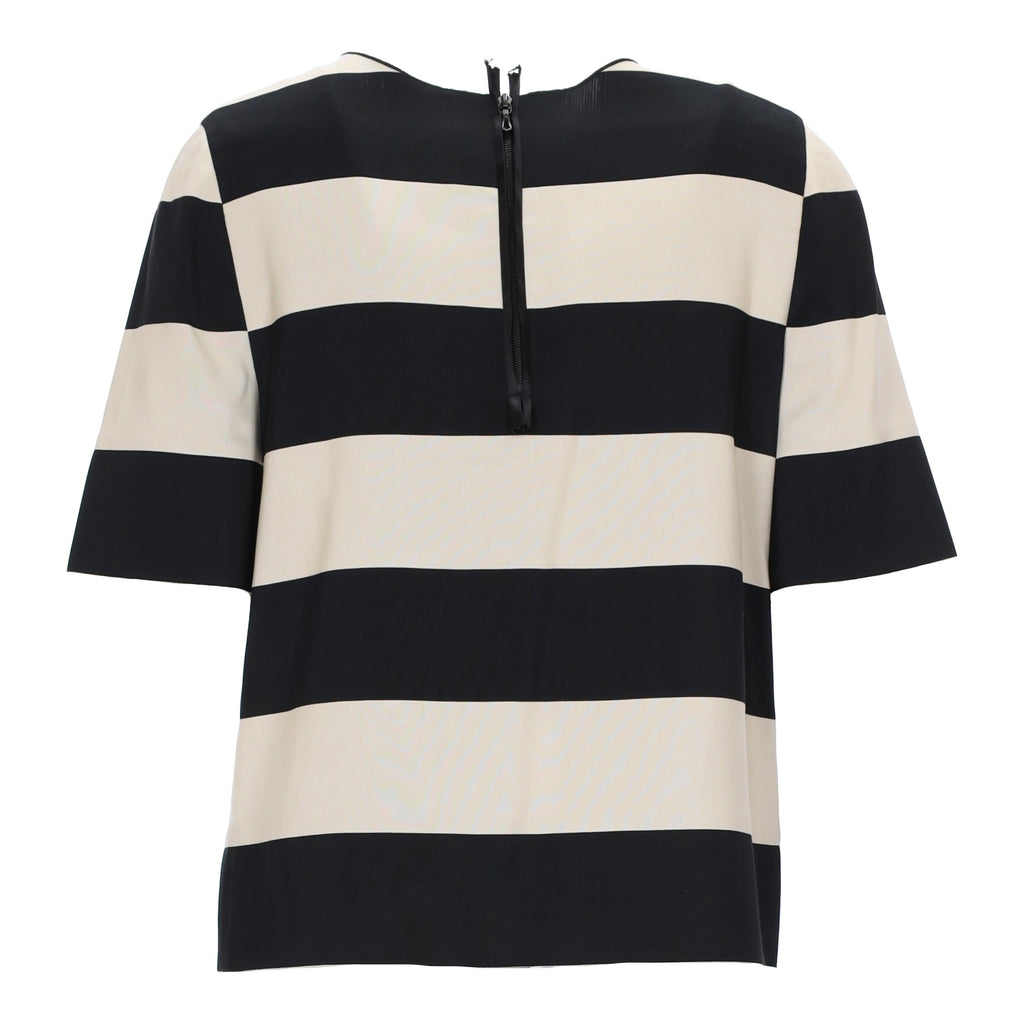 This Lanvin top is a classic French style from the Summer 2013 collection. Featuring sleek black and white horizontal stripes, a round neckline and a back zipper that stands out, this chic short sleeve top will become a staple item in your wardrobe.