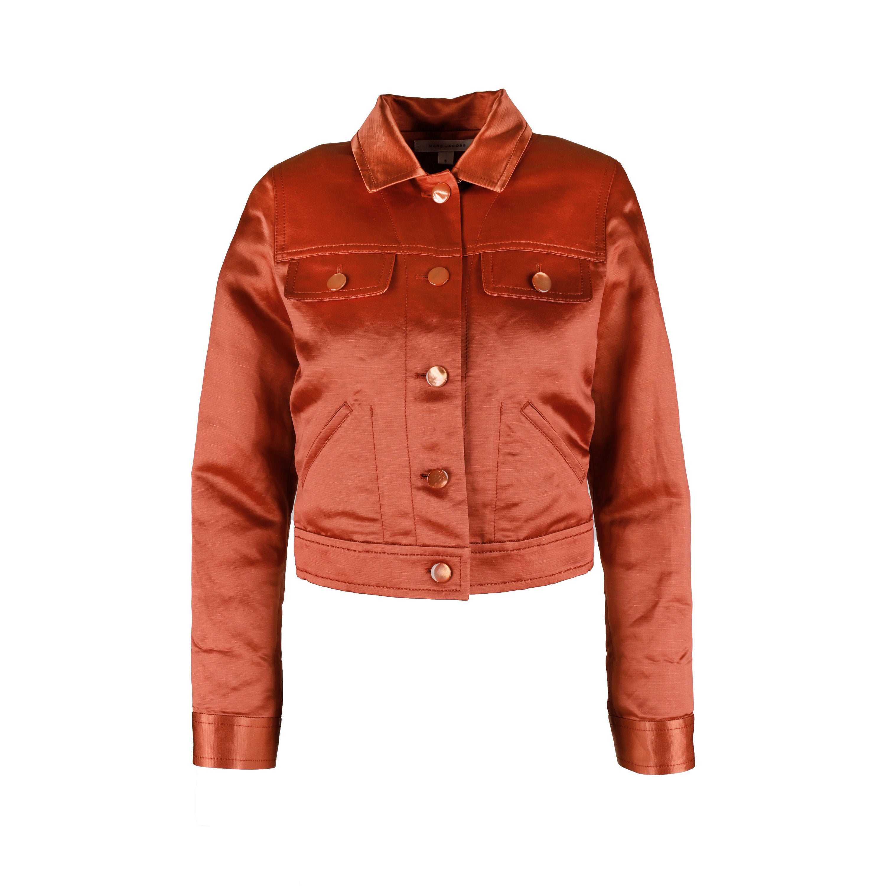 This refined Marc Jacobs jacket is made from a luxe blend of linen and rayon with a subtle sheen. Featuring a stylish collar with a front button closure, two flap pockets with button closure and two slanted pockets, this jacket is perfect for all occasions. It is unlined for a comfortable fit.