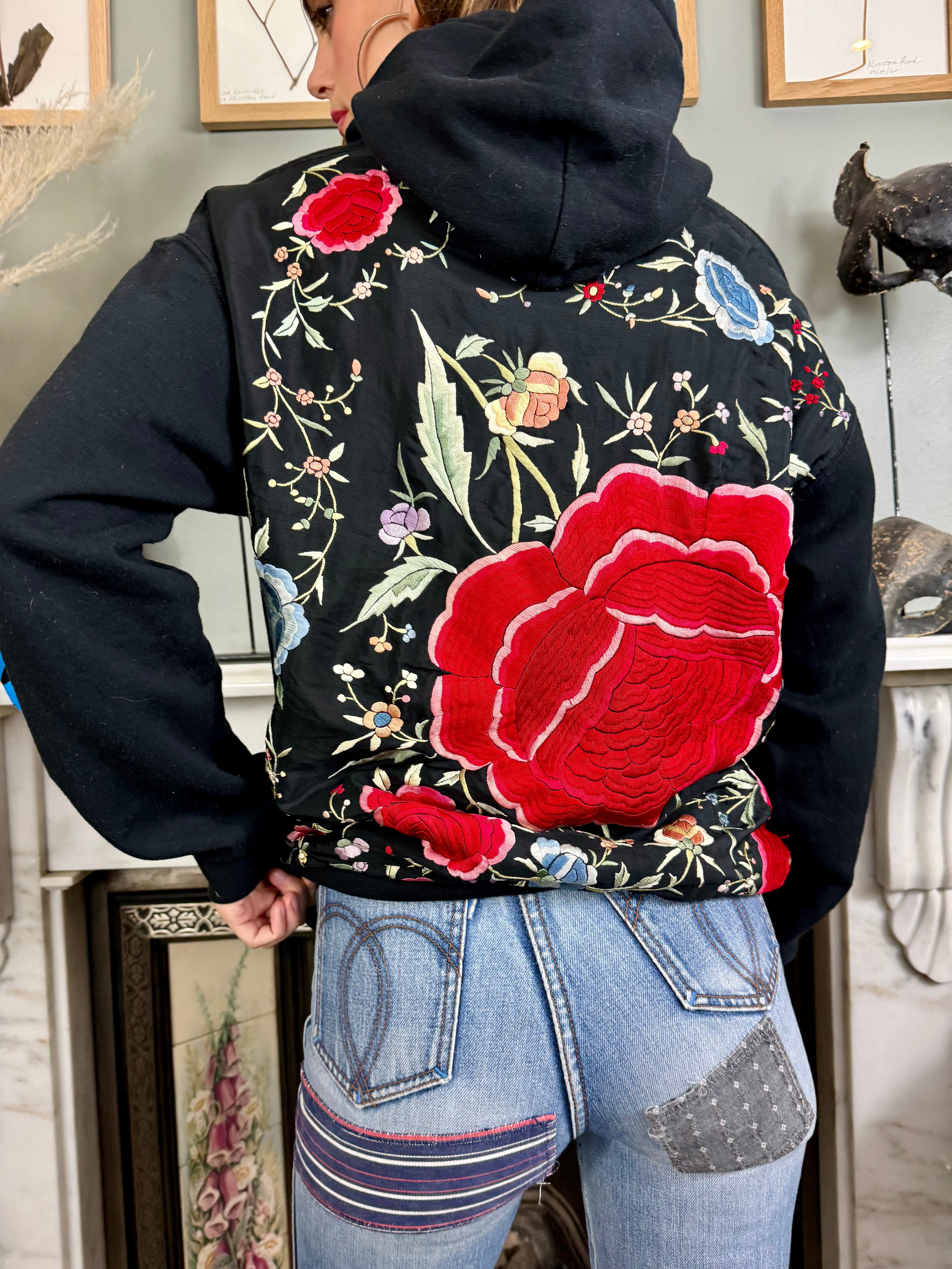 The Nirvana vintage embroidered sweatshirt is a must-have for any music lover. With a front and back embroidered floral panel, this sweatshirt adds a touch of elegance to the classic Nirvana logo. Stay cozy with long sleeves, a hood, and a front pocket, perfect for chilly days and to elevate your denim wear.