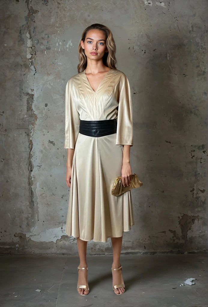 This Original 1970's Vintage Gold Disco Dress by Frank Usher is in a lovely gold shiny fabric. It features three quarter length sleeves and a plunging v - neck line with a zip up the back. It would fit a UK size 10 - 12 so please do check the measurements to avoid disappointment. Belt not included.
