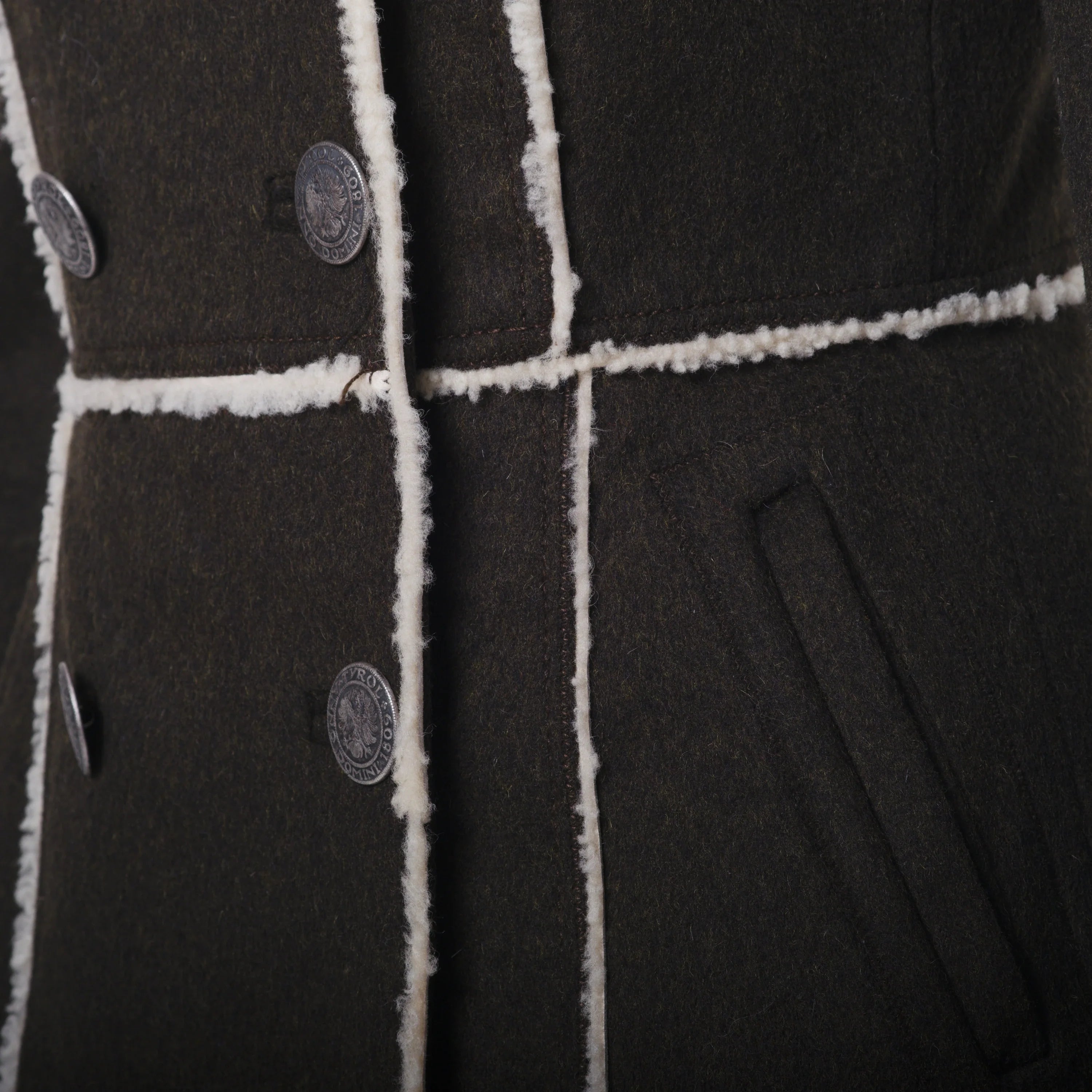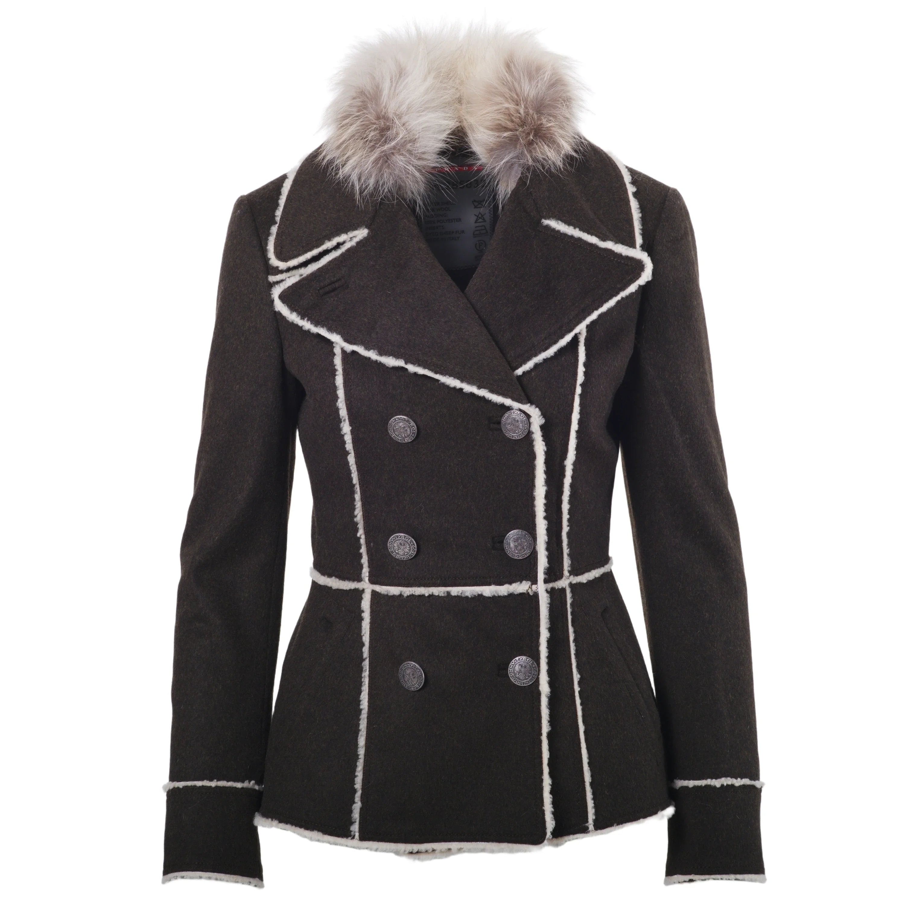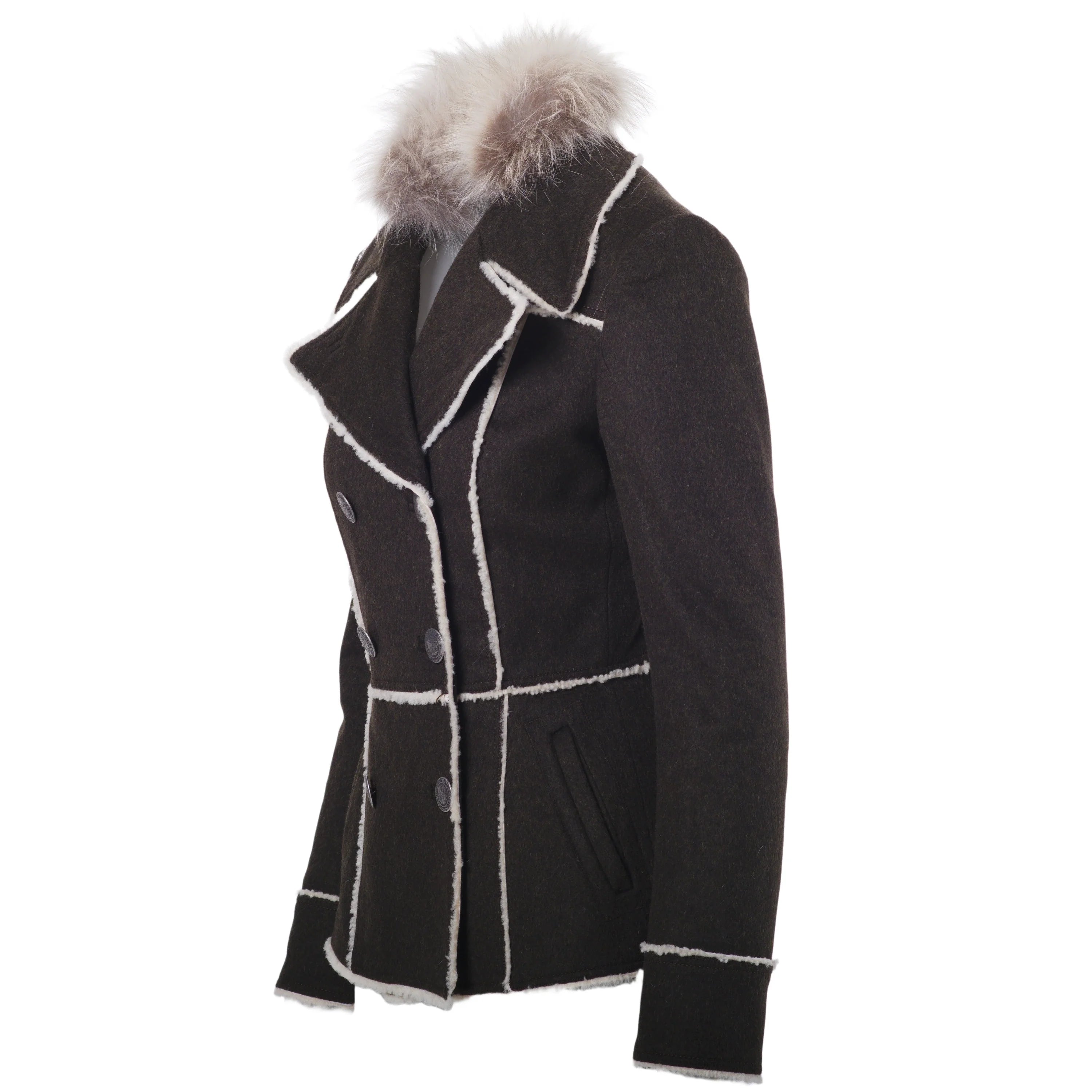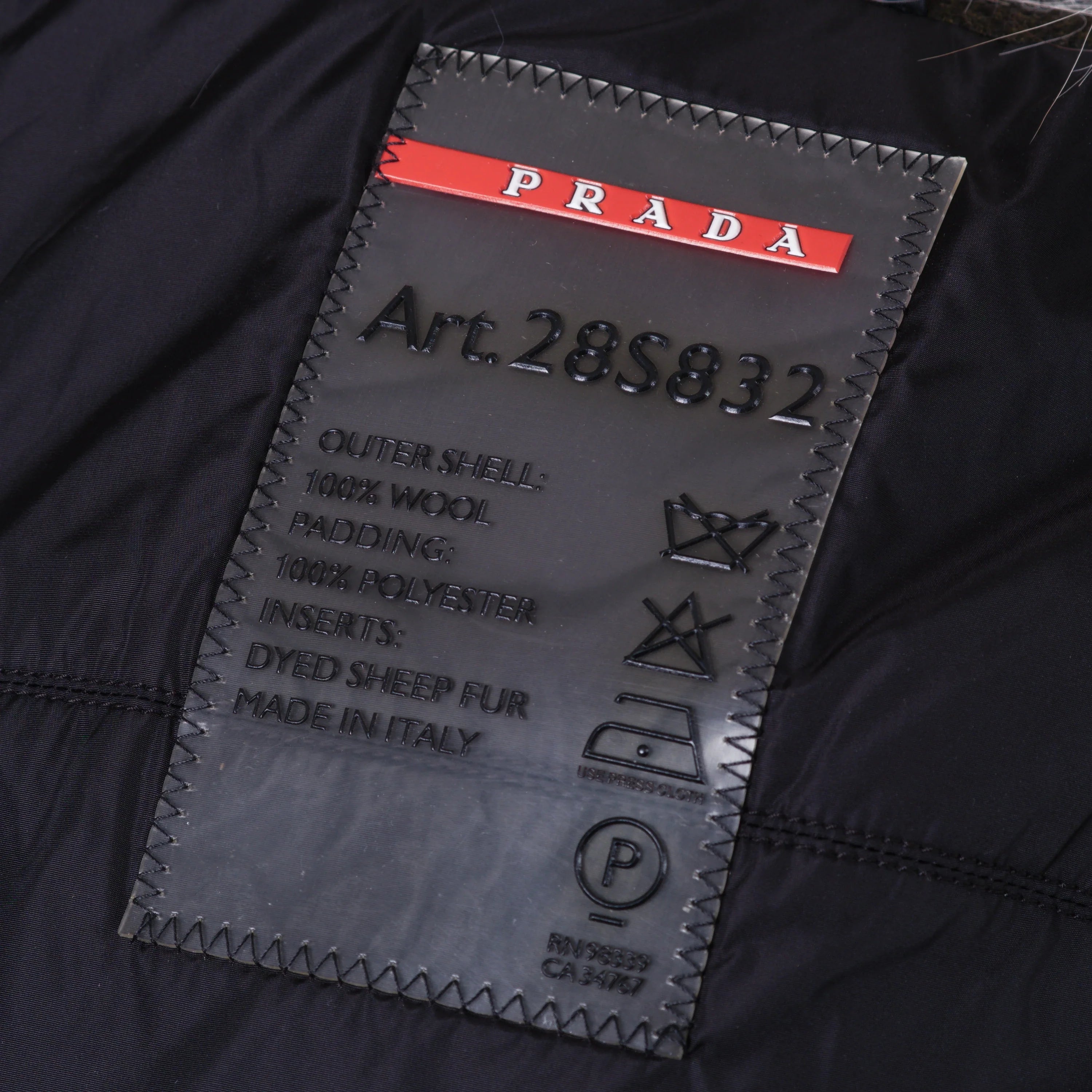 Prada jacket made in Italy, crafted from 100% wool with contrasting shearling trims and a dyed sheep fur collar. Double-breasted, padded for warmth, and tailored to define the waist. A refined, timeless outerwear piece with understated luxury appeal.