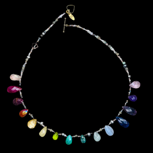 This beautiful necklace is handmade from silver pearls, moonstone, smoky Quartz rondelles blended with Miyuki and Preciosa glass beads and centred by sustainably sourced hand cut faceted briolettes in rose quartz, ruby, carnelian, citrine, peridot, chrysoprase, emerald, moss aquamarine, lace agate, sapphire, purple labradorite and amethyst.