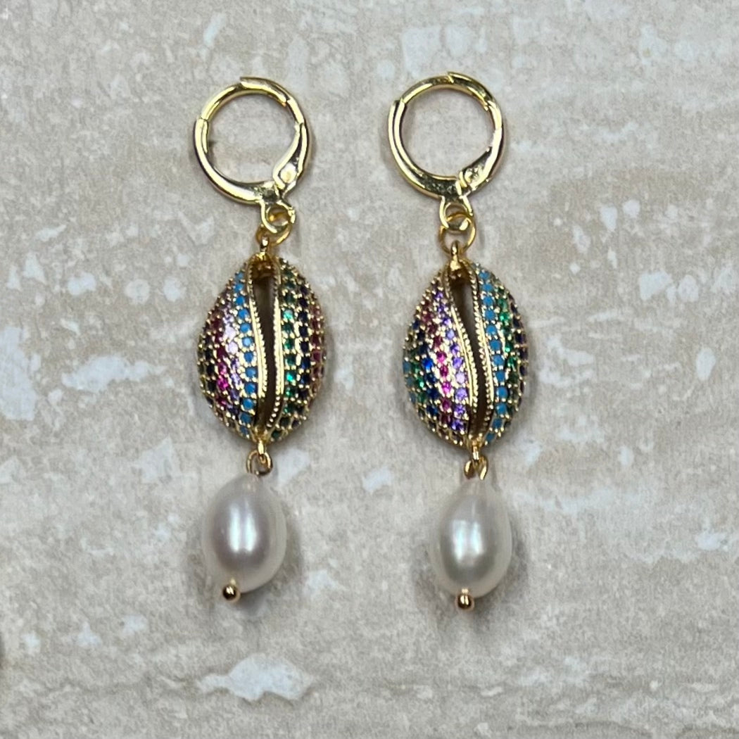 Rainbow CZ Cowrie Shell and Drop Pearl Earrings