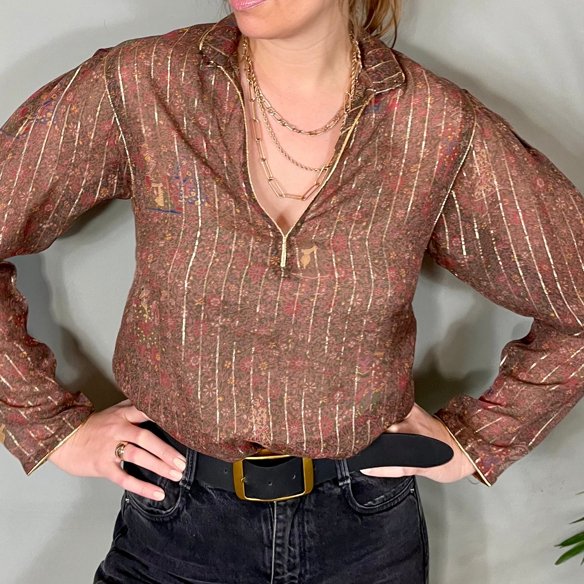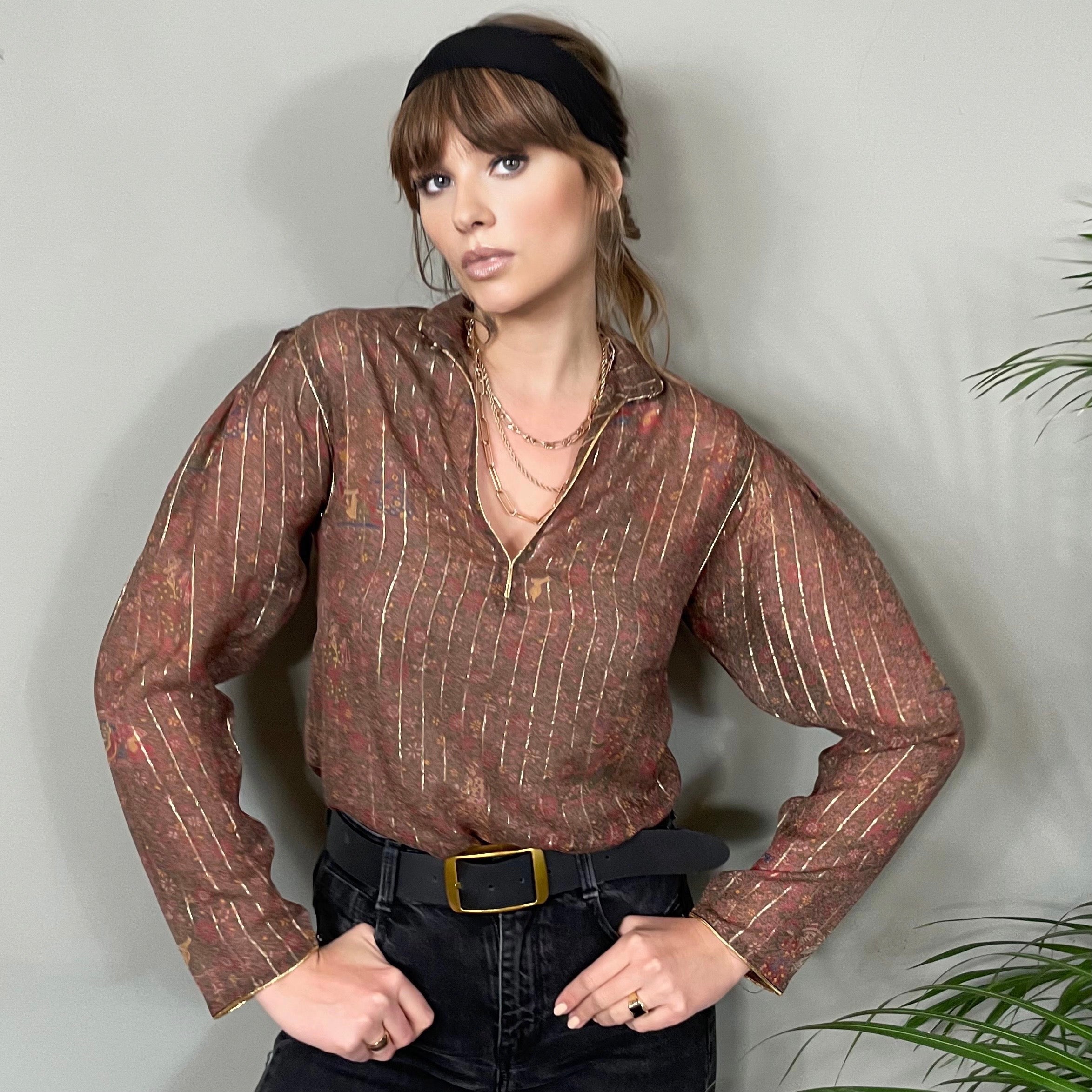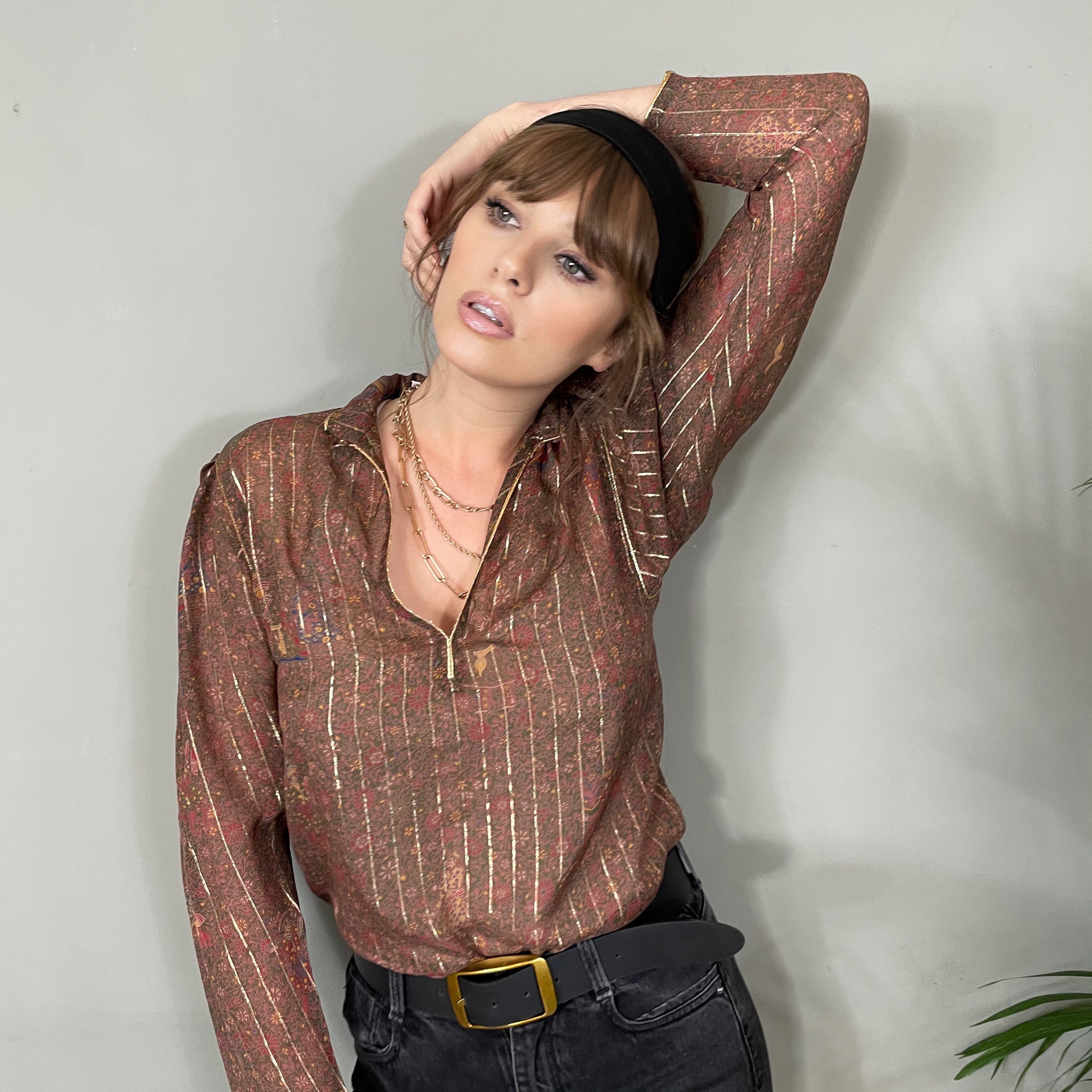 A true modern classic blouse with long sleeves. Made from the softest silk and finished in a fine gold thread. The quiet floral print is chic and just looks fabulous paired with light or dark denim.