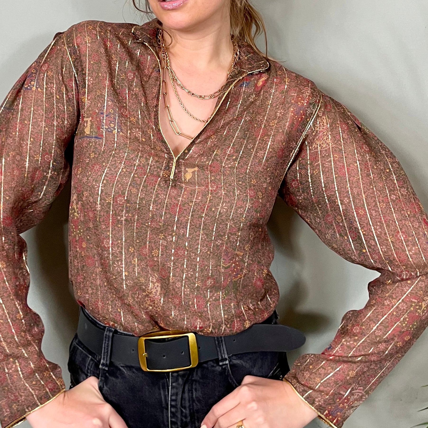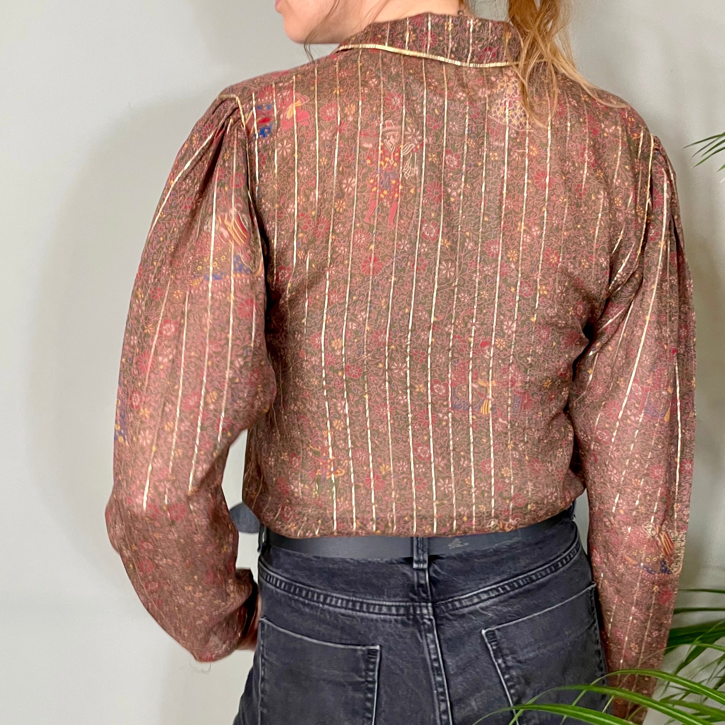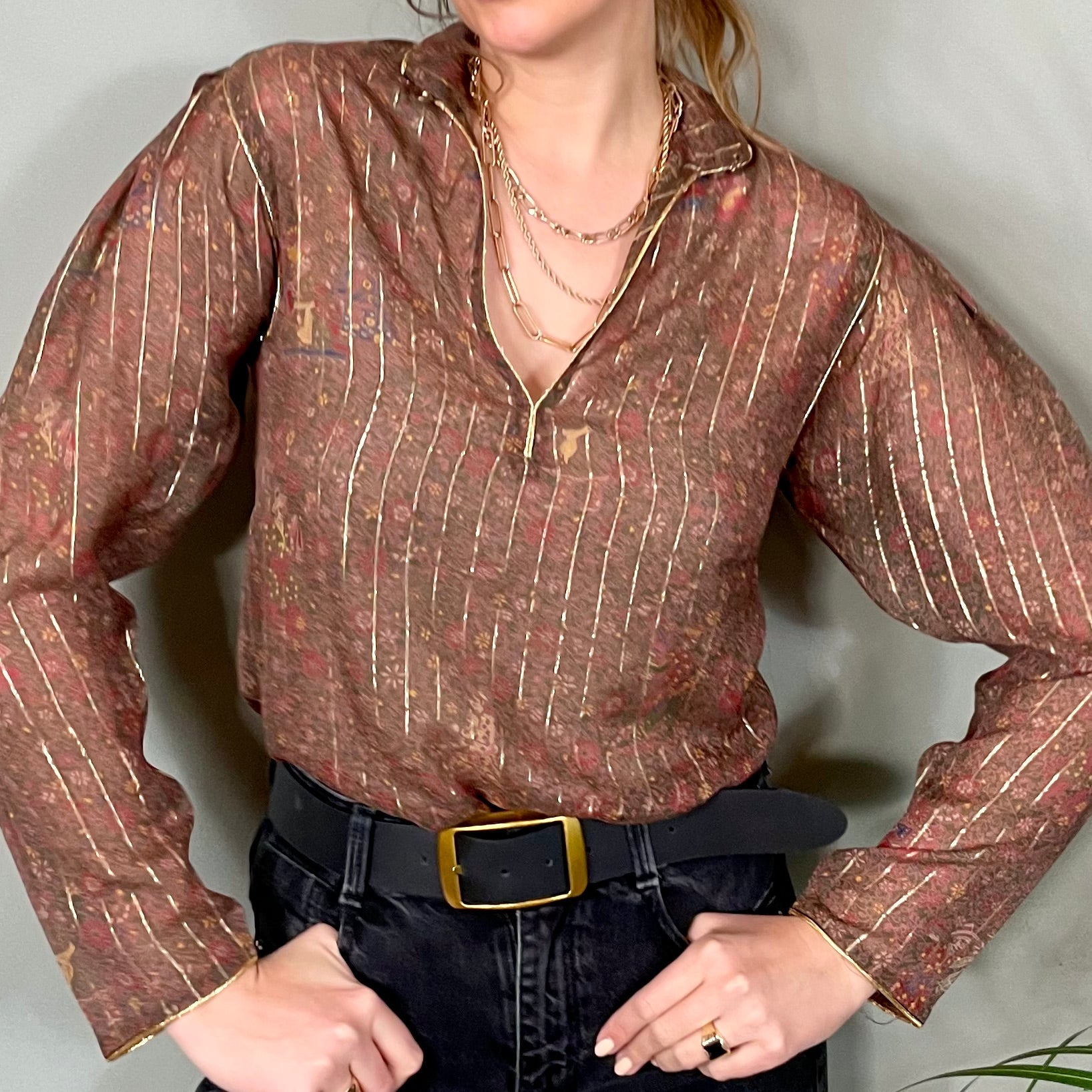 A true modern classic blouse with long sleeves. Made from the softest silk and finished in a fine gold thread. The quiet floral print is chic and just looks fabulous paired with light or dark denim.