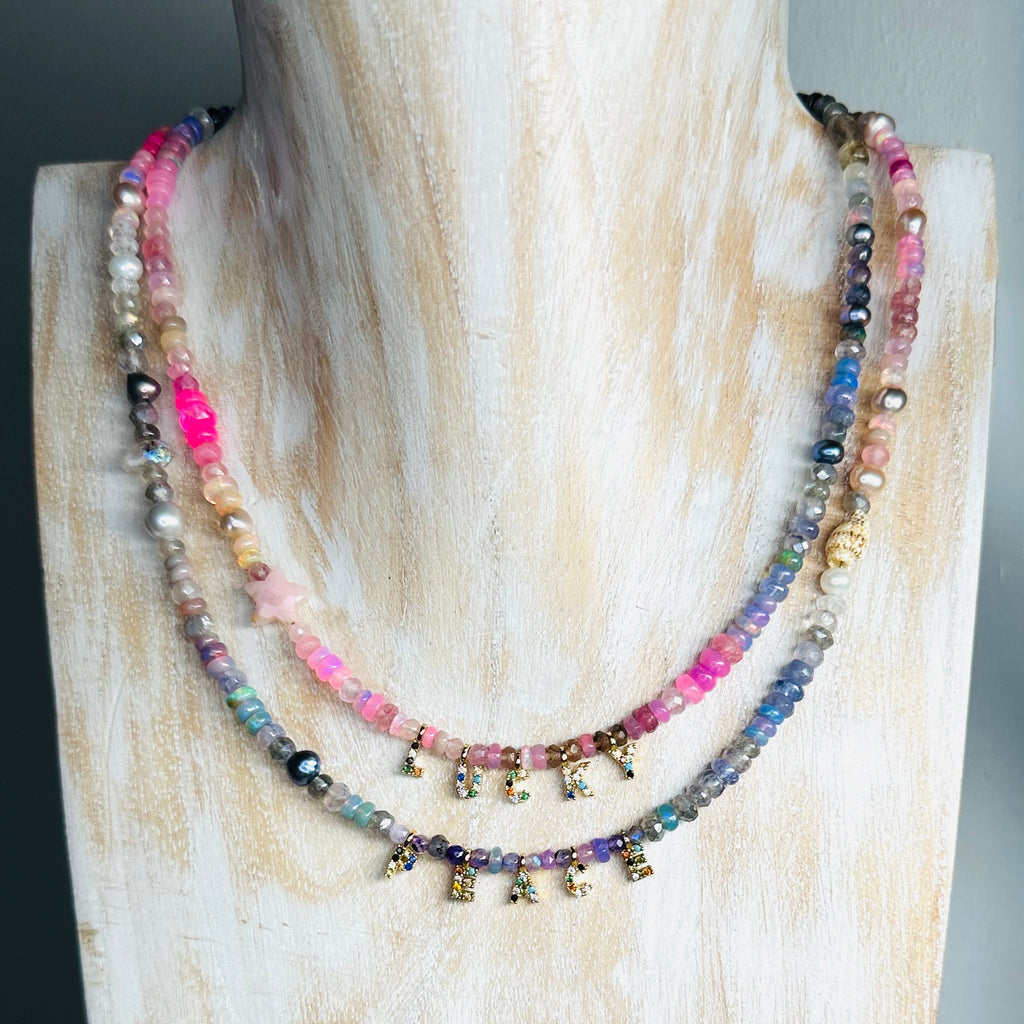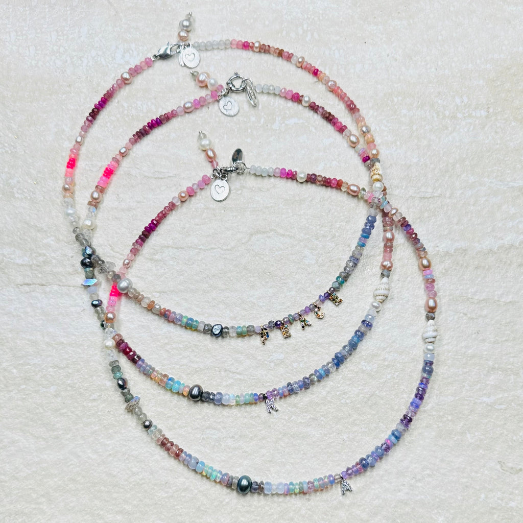 Our Rose Violet necklace is handmade from ombré shades of purple, delphinium blue and pink sustainably sourced gemstones. Including a handcut pale pink opal star it also includes hand cut opal, moonstone, tanzanite, tourmaline, pearl, sapphire, amethyst and ruby rondelles.tones including garnet, ruby, agate, opal, moonstone, pearls. You can choose between heart shaped toggle or sailor clasp in 24 kt gold vermeil.
